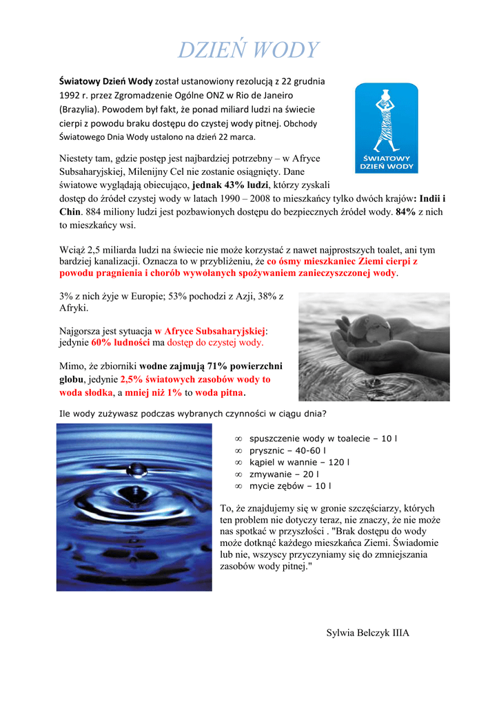DZIEŃ WODY Światowy Dzień Wody został ustanowiony rezolucją z 22 grudnia 1992 r. przez Zgromadzenie Ogólne ONZ w Rio de Janeiro (Brazylia). Powodem był fakt, że ponad miliard ludzi na świecie cierpi z powodu braku dostępu do czystej wody pitnej. Obchody Światowego Dnia Wody ustalono na dzień 22 marca. Niestety tam, gdzie postęp jest najbardziej potrzebny – w Afryce Subsaharyjskiej, Milenijny Cel nie zostanie osiągnięty. Dane światowe wyglądają obiecująco, jednak 43% ludzi, którzy zyskali dostęp do źródeł czystej wody w latach 1990 – 2008 to mieszkańcy tylko dwóch krajów: Indii i Chin. 884 miliony ludzi jest pozbawionych dostępu do bezpiecznych źródeł wody. 84% z nich to mieszkańcy wsi. WciąŜ 2,5 miliarda ludzi na świecie nie moŜe korzystać z nawet najprostszych toalet, ani tym bardziej kanalizacji. Oznacza to w przybliŜeniu, Ŝe co ósmy mieszkaniec Ziemi cierpi z powodu pragnienia i chorób wywołanych spoŜywaniem zanieczyszczonej wody. 3% z nich Ŝyje w Europie; 53% pochodzi z Azji, 38% z Afryki. Najgorsza jest sytuacja w Afryce Subsaharyjskiej: jedynie 60% ludności ma dostęp do czystej wody. Mimo, Ŝe zbiorniki wodne zajmują 71% powierzchni globu, jedynie 2,5% światowych zasobów wody to woda słodka, a mniej niŜ 1% to woda pitna. Ile wody zuŜywasz podczas wybranych czynności w ciągu dnia? • • • • • spuszczenie wody w toalecie – 10 l prysznic – 40-60 l kąpiel w wannie – 120 l zmywanie – 20 l mycie zębów – 10 l To, Ŝe znajdujemy się w gronie szczęściarzy, których ten problem nie dotyczy teraz, nie znaczy, Ŝe nie moŜe nas spotkać w przyszłości . "Brak dostępu do wody moŜe dotknąć kaŜdego mieszkańca Ziemi. Świadomie lub nie, wszyscy przyczyniamy się do zmniejszania zasobów wody pitnej." Sylwia Belczyk IIIA