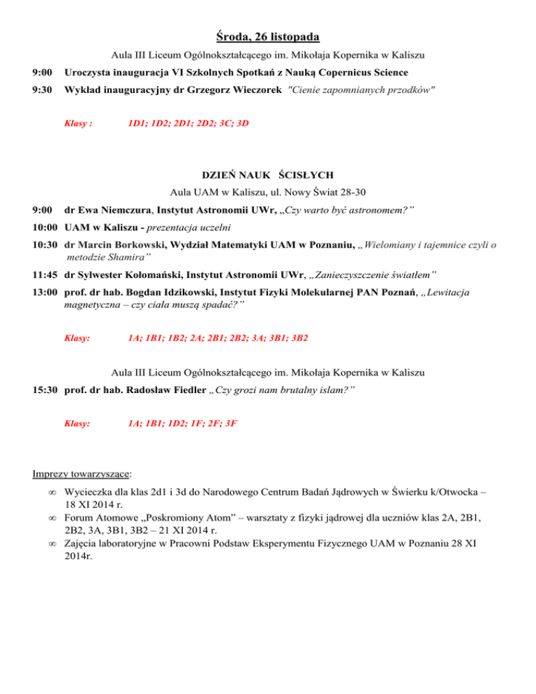 Środa, 26 listopada Aula III Liceum Ogólnokształcącego im. Mikołaja Kopernika w Kaliszu 9:00 Uroczysta inauguracja VI Szkolnych Spotkań z Nauką Copernicus Science 9:30 Wykład inauguracyjny dr Grzegorz Wieczorek "Cienie zapomnianych przodków" Klasy : 1D1; 1D2; 2D1; 2D2; 3C; 3D DZIEŃ NAUK ŚCISŁYCH Aula UAM w Kaliszu, ul. Nowy Świat 28-30 9:00 dr Ewa Niemczura, Instytut Astronomii UWr, „Czy warto być astronomem?” 10:00 UAM w Kaliszu - prezentacja uczelni 10:30 dr Marcin Borkowski, Wydział Matematyki UAM w Poznaniu, „Wielomiany i tajemnice czyli o metodzie Shamira” 11:45 dr Sylwester Kołomański, Instytut Astronomii UWr, „Zanieczyszczenie światłem” 13:00 prof. dr hab. Bogdan Idzikowski, Instytut Fizyki Molekularnej PAN Poznań, „Lewitacja magnetyczna – czy ciała muszą spadać?” Klasy: 1A; 1B1; 1B2; 2A; 2B1; 2B2; 3A; 3B1; 3B2 Aula III Liceum Ogólnokształcącego im. Mikołaja Kopernika w Kaliszu 15:30 prof. dr hab. Radosław Fiedler „Czy grozi nam brutalny islam?” Klasy: 1A; 1B1; 1D2; 1F; 2F; 3F Imprezy towarzyszące: • Wycieczka dla klas 2d1 i 3d do Narodowego Centrum Badań Jądrowych w Świerku k/Otwocka – 18 XI 2014 r. • Forum Atomowe „Poskromiony Atom” – warsztaty z fizyki jądrowej dla uczniów klas 2A, 2B1, 2B2, 3A, 3B1, 3B2 – 21 XI 2014 r. • Zajęcia laboratoryjne w Pracowni Podstaw Eksperymentu Fizycznego UAM w Poznaniu 28 XI 2014r. Czwartek, 27 listopada DZIEŃ NAUK PRZYRODNICZYCH Aula PWSZ ul. Nowy Świat 8.15 dr Andrzej Pajdowski, Osteoporoza. Zagrożenia, profilaktyka, specjalistyczna diagnostyka densytometryczna - trójwymiarowa (3D). Program badań przesiewowych. 9.00 mgr Krzysztof Mielicki komunikacja roślin. Uniwersytet Przyrodniczy w Poznaniu Allelopatia – chemiczna 10.00 mgr Krzysztof Mielicki Uniwersytet Przyrodniczy w Poznaniu Organizmy kwarantannowe czyli jak światowy handel wpływa na zmiany w ekosystemach. 11.00 Barbara Wrzesińska Komunikat : 20 lat Amazonek w Kaliszu 11.30 dr Marzena Zemła Profilaktyka onkologiczna. Klasy: 1D1; 1D2; 2D1; 2D2; 3C; 3D IX KONFERENCJA GEOGRAFICZNA Geografia dla przyszłości Aula III Liceum Ogólnokształcącego im. Mikołaja Kopernika 11:00 prof. dr hab. Mirosław Makohonienko UAM w Poznaniu - Wicedyrektor Instytutu Geoekologii i Geoinformacji, Kierownik Zakładu Geologii i Paleogeografii Czwartorzędu „Współczesna geografia uniwersytecka na Wydziale Nauk Geograficznych i Geologicznych Uniwersytetu im. Adama Mickiewicza w Poznaniu. Badania naukowe i kształcenie” mgr Katarzyna Bartkowiak UAM w Poznaniu „Geoinformacja - geografia na miarę XXI wieku” mgr Krzysztof Rymer UAM w Poznaniu „Poznańska geografia w badaniach polarnych” prof. dr hab. Mirosław Makohonienko UAM w Poznaniu „Antropocen – epoka, w której żyjemy. Dokąd zmierza Ziemia - problemy globalnego ocieplenia i ekologia miasta ” Konferencja odbywa się w ramach patronatu naukowego, jakim objął nasze liceum Wydział Nauk Geograficznych i Geologicznych Uniwersytetu Adama Mickiewicza. Koordynatorzy konferencji: prof. UAM dr hab. Leszek Kasprzak, Wydział Nauk Geograficznych i Geologicznych UAM; mgr Anna Bobińska, III LO im. Mikołaja Kopernika w Kaliszu Klasy: 1G; 2G; 3G1; 3G2 Piątek, 28 listopada Aula III Liceum Ogólnokształcącego im. Mikołaja Kopernika 9:00 dr inż. Małgorzata Steblecka (absolwentka III Liceum), Politechnika Łódzka, Zastosowanie światła w medycynie. Fotodynamiczna terapia nowotworów. Klasy: 1D1; 1D2; 2D1; 2D2; 3C; 3D DZIEŃ NAUK HUMANISTYCZNYCH Aula III Liceum Ogólnokształcącego im. Mikołaja Kopernika 10:00 ks. dr Krzysztof Niciejewski Wyższe Seminarium Duchowne w Kaliszu, Człowiek wobec prawdy. Od fizyki do metafizyki. 11:00 dr Jacek Pokładecki UAM Poznań, 25 lat samorządności w Polsce. Bilans. 12:00 dr Agnieszka Raubo UAM Poznań, Kultura renesansu w kontekstach medycyny, alchemii i szarlatanerii. 13:00 Krzysztof Martyna, Dwa plus dwa nie zawsze jest jeden. 13:30 Krzysztof Martyna, Język reklamowej nowomowy. Klasy: 1C; 1F; 2C; 2F; 3F Imprezy towarzyszące: • Warsztaty z teatru, animacji, tańca i choreografii dla aktorów Teatru NIBY NIC (prowadzą instruktorzy i wykładowcy PPSKAK w Kaliszu). W sumie dwa bloki zajęć. Zajęcia dramowe (teatralne) z p. Małgorzatą Kałędkiewicz odbędą się 24 listopada w godzinach dopołudniowych w III LO. • Warsztaty poetyckie z METAFORĄ – Stowarzyszenie Promocji Sztuki ”Łyżka Mleka” (p. Beata Wicenciak ze stowarzyszenia z grupą wychowanków, III LO). • Konkurs polonistyczny z biblioteką szkolną (Magdalena Pietrzak i Małgorzata Świerblewska, III LO). • Andrzejki z animatorami kultury – g. 16:00 w PPSKAK przy ul. Podmiejskiej. • Kino na temat. Udział w cyklu popularyzującym problematykę kina. Film ”Igrzyska śmierci”. Kino Helios w Galerii Amber – 24 listopada g. 9:00.