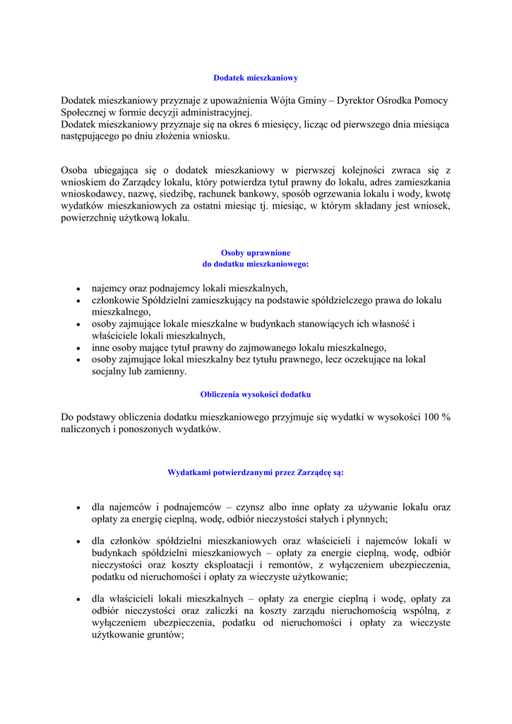 Dodatek mieszkaniowy Dodatek mieszkaniowy przyznaje z upoważnienia Wójta Gminy – Dyrektor Ośrodka Pomocy Społecznej w formie decyzji administracyjnej. Dodatek mieszkaniowy przyznaje się na okres 6 miesięcy, licząc od pierwszego dnia miesiąca następującego po dniu złożenia wniosku. Osoba ubiegająca się o dodatek mieszkaniowy w pierwszej kolejności zwraca się z wnioskiem do Zarządcy lokalu, który potwierdza tytuł prawny do lokalu, adres zamieszkania wnioskodawcy, nazwę, siedzibę, rachunek bankowy, sposób ogrzewania lokalu i wody, kwotę wydatków mieszkaniowych za ostatni miesiąc tj. miesiąc, w którym składany jest wniosek, powierzchnię użytkową lokalu. Osoby uprawnione do dodatku mieszkaniowego: najemcy oraz podnajemcy lokali mieszkalnych, członkowie Spółdzielni zamieszkujący na podstawie spółdzielczego prawa do lokalu mieszkalnego, osoby zajmujące lokale mieszkalne w budynkach stanowiących ich własność i właściciele lokali mieszkalnych, inne osoby mające tytuł prawny do zajmowanego lokalu mieszkalnego, osoby zajmujące lokal mieszkalny bez tytułu prawnego, lecz oczekujące na lokal socjalny lub zamienny. Obliczenia wysokości dodatku Do podstawy obliczenia dodatku mieszkaniowego przyjmuje się wydatki w wysokości 100 % naliczonych i ponoszonych wydatków. Wydatkami potwierdzanymi przez Zarządcę są: dla najemców i podnajemców – czynsz albo inne opłaty za używanie lokalu oraz opłaty za energię cieplną, wodę, odbiór nieczystości stałych i płynnych; dla członków spółdzielni mieszkaniowych oraz właścicieli i najemców lokali w budynkach spółdzielni mieszkaniowych – opłaty za energie cieplną, wodę, odbiór nieczystości oraz koszty eksploatacji i remontów, z wyłączeniem ubezpieczenia, podatku od nieruchomości i opłaty za wieczyste użytkowanie; dla właścicieli lokali mieszkalnych – opłaty za energie cieplną i wodę, opłaty za odbiór nieczystości oraz zaliczki na koszty zarządu nieruchomością wspólną, z wyłączeniem ubezpieczenia, podatku od nieruchomości i opłaty za wieczyste użytkowanie gruntów; dla osób używających lokali mieszkalnych w budynkach wielorodzinnych stanowiących ich własność oraz właścicieli domów jednorodzinnych – opłaty za energię cieplną i wodę dostarczane do lokalu, opłaty za odbiór nieczystości; dla osób zajmujących lokal bez tytułu prawnego i oczekujących na dostarczenie przysługującego im lokalu zamiennego lub socjalnego -odszkodowanie oraz opłaty za energię cieplną, wodę, odbiór nieczystości z wyłączeniem ubezpieczenia, podatku od nieruchomości i opłaty za wieczyste użytkowanie gruntów. Jeżeli osoba zamieszkuje w lokalu mieszkalnym lub domu niewchodzącym w skład mieszkaniowego zasobu gminy (np. wynajmuje lokal na podstawie umowy najmu od osoby prywatnej, mieszka w lokalu spółdzielczym) do wydatków mieszkaniowych zalicza się tylko takie wydatki, które pokrywane byłyby: wyłącznie do wysokości czynszu, jaki obowiązywałby dla danego lokalu, gdyby lokal ten wchodził w skład mieszkaniowego zasobu gminy, opłaty poza czynszem, które obowiązywałyby w zasobie mieszkaniowym gminy, gdyby ten lokal wchodził w skład tego zasobu. Wypłata dodatku mieszkaniowego Dodatek wpływa na konto zarządcy lokalu i pomniejsza tym samym wydatki mieszkaniowe najemcy lokalu wobec zarządcy. Właściciele domów jednorodzinnych mają wypłacony dodatek mieszkaniowy bezpośrednio do rąk. Ekwiwalent za brak mediów tzw. ryczałt na zakup opału może być przyznany bezpośrednio osobie, której przyznano dodatek. Wstrzymanie wypłaty dodatku Jeżeli osoba, której przyznano dodatek mieszkaniowy nie reguluje na bieżąco należności za lokal, to wypłatę dodatku wstrzymuje się do czasu pokrycia zaległości. Decyzja o przyznaniu dodatku wygasa, jeżeli zaległości nie zostaną pokryte w ciągu 3 miesięcy od dnia wydania decyzji wstrzymującej. O spłatę wstrzymanego dodatku można wystąpić dopiero po uregulowaniu w/w zaległości. Po upływie 6-miesięcznego terminu obowiązywania decyzji, osoba może ponownie złożyć wniosek o przyznanie dodatku pomimo zaległości wynikających z poprzedniej decyzji. Wywiad środowiskowy W przypadku rozbieżności między deklarowanymi dochodami, a faktycznym stanem majątkowym oraz liczbą osób faktycznie zamieszkałych w lokalu upoważniony pracownik przeprowadza wywiad środowiskowy. W/w pracownik może żądać od wnioskodawcy i innych członków gospodarstwa domowego złożenia oświadczenia o stanie majątkowym, zawierającego w szczególności dane dotyczące posiadanych: ruchomości i nieruchomości; zasobów pieniężnych. Odmowa przyznania dodatku mieszkaniowego następuje w przypadku: odmowy złożenia oświadczenia, istnienie rażącej dysproporcji między faktycznym wnioskodawcy, a zdeklarowanymi we wniosku dochodami, wykazania mniejszej liczby osób wspólnie stale zamieszkujących i gospodarujących z wnioskodawcą. stanem majątkowym Wysokość dodatku mieszkaniowego zależy od: dochodów, liczby osób faktycznie zamieszkałych, normatywnej powierzchni użytkowej lokalu, wysokości wydatków na utrzymanie lokalu przypadających na normatywną powierzchnie użytkową. Normatywna powierzchnia użytkowa lokalu w przeliczeniu na liczbę członków gospodarstwa domowego z możliwością przekroczenia jej nie więcej niż o 30% albo 50% wynosi: 35 m2 zwiększona do 45,5 m2 dla 1 osoby 40 m2 zwiększona do 52 m2 dla 2 osób 45 m2 zwiększona do 58,5 m2 dla 3 osób 55 m2 zwiększona do 71,5 m2 dla 4 osób 65 m2 zwiększona do 84,5 m2 dla 5 osób 70 m2 zwiększona do 91 m2 dla 6 osób, itd. Średni dochód na miesiąc Osoba ubiegająca się o dodatek mieszkaniowy deklaruje dochody brutto (tj. z podatkiem) po odliczeniu kosztów uzyskania i składek na ubezpieczenie emerytalne, rentowe i chorobowe za 3 ostatnie miesiące (sprzed daty złożenia wniosku).