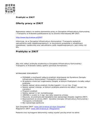 Praktyki w ZIKiT Oferty pracy w ZIKiT Najnowsze nabory na wolne stanowiska pracy w Zarządzie Infrastruktury Komunalnej i Transportu w Krakowie publikowane są na stronie internetowej BIP ZIKiT. http://www.bip.krakow.pl/ZIKIT Informuję, że w Zarządzie Infrastruktury Komunalnej i Transportu wskaźnik zatrudnienia osób niepełnosprawnych, w rozumieniu przepisów o rehabilitacji zawodowej i społecznej oraz zatrudnianiu osób niepełnosprawnych, jest niższy niż 6%. Praktyka w ZIKiT Aby móc odbyć praktykę studencką w Zarządzie Infrastruktury Komunalnej i Transportu w Krakowie należy spełnić poniższe formalności: WYMAGANE DOKUMENTY PODANIE o możliwość odbycia praktyki skierowane do Dyrektora Zarządu Infrastruktury Komunalnej i Transportu w Krakowie. W podaniu może być sugerowany Zespół, w którym Praktykant chciałby odbyć praktykę Należy wpisać okres praktyki (liczbę tygodni / m-cy) (np. 3 tyg) Należy wpisać miesiąc, w którym praktyka powinna się odbyć / zacząć (np. czerwiec) Program praktyki Należy wpisać nr tel. kontaktowego UMOWA z uczelni w 2 egz. bez daty zawarcia umowy Klauzula, że praktyka jest bezpłatna bez wpisanego Zespołu (ogólnie ZIKiT) Reprezentant ze strony ZIKiT: Dyrektor Zarządu Infrastruktury Komunalnej i Transportu w Krakowie Bez wpisanego opiekuna Spis Zespołów ZIKIT: www.zikit.krakow.pl>Spis Zespołów Regulamin ZIKiT: www.zikit.krakow.pl >Regulamin Podanie oraz wymagane dokumenty należy wysłać pocztą email na adres [email protected]. KONTAKT Zespół Personalny - Kinga Kasprzyk-Siwek 31-586 Kraków , ul. Centralna 53 pok. 103 tel. 012-616-74-29, fax. 012-616-74-17, pn.-pt. 7.30-15.30. Powered by TCPDF (www.tcpdf.org)