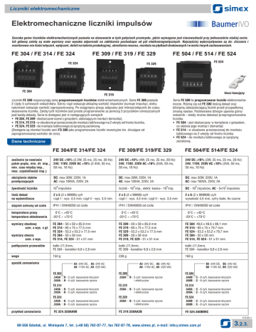 Liczniki elektromechaniczne Elektromechaniczne liczniki impulsów Szeroka gama liczników elektromechanicznych pozwala na stosowanie w tych ga³êziach przemys³u, gdzie wymagana jest niezawodnoœæ przy jednoczeœnie niskiej cenie. Ich g³ówn¹ zalet¹ s¹ ma³e wymiary oraz wysoka odpornoœæ na zak³ócenia pochodz¹ce od pól elektromagnetycznych. Najczêœciej wykorzystywane s¹ do: zliczania i monitorowa-nia iloœci w³¹czeñ, wy³¹czeñ, detali na taœmie produkcyjnej, okreœlania resursu, monta¿u na p³ytkach drukowanych i w wielu innych zastosowaniach. FE 304 / FE 314 / FE 324 FE 309 / FE 319 / FE 329 FE 324 FE 504 / FE 514 / FE 524 FE 524 FE 329 FE 304 klucz kasuj¹cy FE 319 Liczniki FE 300 rozpoczynaj¹ seriê programowanych liczników elektromechanicznych. Seria FE 300 posiada 2 rzêdy 5 cyfrowych wskaŸników. Górny rz¹d wskazuje aktualn¹ wartoœæ impulsów (sumuje impulsy), dolny natomiast wskazuje wartoœæ zaprogramowan¹. Po osi¹gniêciu progu za³¹czany jest mikroprze³¹cznik do czasu skasowania licznika. Zalet¹ tych liczników jest proste programowanie za pomoc¹ 5 przycisków umieszczonych pod ka¿d¹ dekad¹. Seria ta dostêpna jest w nastêpuj¹cych wersjach: w FE 304, FE 309 - dostarczane razem z gniazdem, u³atwiaj¹cym monta¿ i demonta¿, w FE 314, FE 319 - w obudowie przeznaczonej do monta¿u tablicowego na 2 wkrêty od frontu licznika, w FE 324, FE 329 - do monta¿u tablicowego ze sprê¿yn¹ zaciskow¹. (Dostêpne s¹ równie¿ liczniki serii FS 300 jako programowane liczniki rewersyjne tzn. zliczaj¹ce od zaprogramowanej wartoœci do zera). Seria FE 500 to programowane liczniki elektromechaniczne. Ró¿ni¹ siê od FE 300 iloœci¹ dekad oraz dŸwigni¹ zabezpieczaj¹c¹ licznik przed przypadkow¹ zmian¹ nastaw. Podniesienie dŸwigni ujawnia górny wskaŸnik - wtedy mo¿na dokonaæ przeprogramowania licznika. w FE 504 - jest dostarczany w komplecie z gniazdem, co u³atwia jego monta¿ i demonta¿ w FE 514 - w obudowie przeznaczonej do monta¿u tablicowego na 2 wkrêty od frontu licznika w FE 524 - do monta¿u tablicowego ze sprê¿yn¹ zaciskow¹. Dane techniczne FE 309/FE 319/FE 329 FE 504/FE 514/FE 524 24V DC ±10% (2.2W, 25 ms, 25 ms, 20 Hz) zasilanie (w nawiasie pobór pr¹du, min. d³. imp., 24V, 110V, 220V AC ±10% (2.4VA, 50 ms, 50 ms, 10 Hz) min. czas miêdzy imp., max. czêstotliwoœæ imp.) 24V DC ±10% (4W, 25 ms, 25 ms, 20 Hz) 24V, 110V, 220V AC ±10% (5VA, 50 ms, 50 ms, 10 Hz) 24V DC ±10% (2W, 25 ms, 25 ms, 20 Hz) 24V, 110V, 220V AC ±10% (3VA, 50 ms, 50 ms, 10 Hz) obci¹¿enie styków prze³¹czaj¹cych DC: max 30W, 220V, 1A AC: max 100VA, 220V, 2A DC: max 30W, 220V, 1A AC: max 100VA, 220V, 2A DC: max 30W, 220V, 1A AC: max 100VA, 220V, 2A ¿ywotnoœæ licznika 10 impulsów licznik - 10 imp., elektr. kasow.- 10 imp. DC - 10 impulsów, AC - 5x10 impulsów iloœæ dekad na wyœwietlaczu 2 x 5 (2 x 99999) cyfr rz¹d I - wys. 4,5 mm; rz¹d II - wys. 3,5 mm 2 x 5 (2 x 99999) cyfr rz¹d I - wys. 4,5 mm; rz¹d II - wys. 3,5 mm 2 x 6 (2 x 999999) cyfr wysokoœæ 4,5 mm, cyfry bia³e, t³o czarne stopieñ ochrony od czo³a IP41 / DIN40050 od czo³a IP41 / DIN40050 od czo³a IP41 / DIN40050 od czo³a temperatura pracy temperatura sk³adowania 0° C¸ +45° C -20° C¸ +70° C 0° C¸ +45° C -20° C¸ +70° C 0° C¸ +45° C -20° C¸ +70° C wymiary obudowy szer. x wys. x g³. FE 304 - 50 x 50 x 85,9 mm FE 314 - 60 x 75 x 77,5 mm FE 324 - 53,2 x 53,2 x 77,5 mm FE 304 - 50 x 50 mm FE 314, FE 324 - 51 x 51 mm FE 309 - 50 x 50 x 85,9 mm FE 319 - 60 x 75 x 77,5 mm FE 329 - 53,2 x 53,2 x 77,5 mm FE 309 - 50 x 50 mm FE 319, FE 329 - 51 x 51 mm FE 504 49,6 x 49,6 x 88,1 mm FE 514 - 60 x 75 x 79,7 mm FE 524 - 53,2 x 53,2 x 79,7 mm FE 504 - 50 x 50 mm FE 514, FE 524 - 51 x 51 mm pod³¹czenie przewodów ko³ki A 1,5mm, FE 304 - konektor 0,8 x 2,8 mm ko³ki A 1,5mm, FE 309 - konektor 0,8 x 2,8 mm ko³ki A 1,5mm, FE 504 - konektor 0,8 x 2,8 mm waga 150 g 230 g 160 g FE 304/FE 314/FE 324 wymiary otworu szer. x wys. sposób zamawiania przyk³ad zamawiania 8 8 A3 -24V DC, A5 -24V AC A8 -110V AC, A9 -220 VAC 6 8 A3 -24V DC, A5 -24V AC A8 -110V AC, A9 -220 VAC 7 B3 -24V DC, B5 -24V AC B8 -110V AC, B9 -220 VAC FE 304 .540A B - 5 cyfr, kasowanie kluczem .550A B - 5 cyfr, kasowanie rêczne FE 309 .550A B - 5 cyfr, kasowanie rêczne i elektryczne FE 504 .640B C - 6 cyfr, kasowanie kluczem .650B C - 6 cyfr, kasowanie rêczne FE 314 .540A B - 5 cyfr, kasowanie kluczem .550A B - 5 cyfr, kasowanie rêczne FE 319 .550A B - 5 cyfr, kasowanie rêczne i elektryczne FE 514 .640A C - 6 cyfr, kasowanie kluczem .650A C - 6 cyfr, kasowanie rêczne FE 324 .540A B - 5 cyfr, kasowanie kluczem .550A B - 5 cyfr, kasowanie rêczne FE 329 .550A B - 5 cyfr, kasowanie rêczne i elektryczne FE 524 .640B C - 6 cyfr, kasowanie kluczem .650B C - 6 cyfr, kasowanie rêczne FE 324.550AA9B FE 319.550AA3B FE 524.640BB9C V.5.03.1 80-556 Gdañsk, ul. Wielopole 7, tel. (+48 58) 762-07-77, fax 762-07-70, www.simex.pl, e-mail: [email protected] 3.2.3.