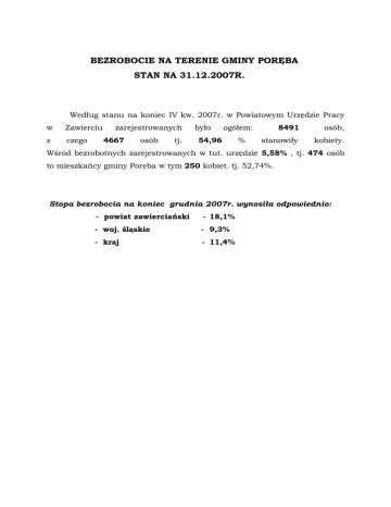 BEZROBOCIE NA TERENIE GMINY PORĘBA STAN NA 31.12.2007R. Według stanu na koniec IV kw. 2007r. w Powiatowym Urzędzie Pracy w Zawierciu z czego zarejestrowanych 4667 osób tj. było 8491 osób, stanowiły kobiety. ogółem: 54,96 % Wśród bezrobotnych zarejestrowanych w tut. urzędzie 5,58% , tj. 474 osób to mieszkańcy gminy Poręba w tym 250 kobiet. tj. 52,74%. Stopa bezrobocia na koniec grudnia 2007r. wynosiła odpowiednio: - powiat zawierciański - 18,1% - woj. śląskie - 9,3% - kraj - 11,4% Bezrobotni będący w trudnej sytuacji na rynku pracy, zarejestrowani w PUP Zawiercie z uwzględnieniem mieszkańców gminy Poręba (stan na koniec 31.12.2007r.) Kategorie osób Bezrobotni w ramach poszczególnych kategorii w szczególnej sytuacji na rynku pracy ogółem powiat mieszkańcy Poręby Do 25 roku życia 1399 63 Długotrwale bezrobotni 5665 313 Powyżej 50 roku życia 1685 101 Bez kwalifikacji zawodowych 2315 121 Samotnie wychowujące co najmniej jedno dziecko do 7 roku życia 184 Niepełnosprawni 211 3 10 Podział bezrobotnych według wykształcenia (zarejestrowani z gminy Poręba na 31.12.2007r.) przedstawiony jest w tabeli poniżej: LP Wykształcenie Liczba zarejestrowanych z terenu Poręby w tym kobiet 42 29 135 78 49 34 1 wyższe 2 policealne i średnie zawodowe 3 średnie ogólnokształcące 4 zasadnicze zawodowe 148 59 5 gimnazjalne i poniżej 100 50 Bezrobotni według wieku (zarejestrowani z gminy Poręba na 31.12.2007r.) przedstawia tabela poniżej: LP Kategoria wiekowa Liczba zarejestrowanych z terenu Poręby w tym kobiet 1 18 - 24 63 30 2 25 - 34 143 87 3 35 - 44 96 54 4 45 - 54 135 69 5 55 - 59 31 10 6 60 - 64 6 0 Staż pracy zarejestrowanych bezrobotnych z gminy Poręba (stan na koniec 31.12.2007r.) przedstawia tabela poniżej: LP Staż pracy w latach Liczba zarejestrowanych z terenu Poręby 1 do 1 roku 75 41 2 1–5 77 39 3 5 – 10 59 28 4 10 – 20 80 46 5 20 – 30 57 18 6 30 lat i więcej 16 7 7 bez stażu 110 71 w tym kobiet Okres pozostawania bezrobotnych bez pracy (zarejestrowani z gminy Poręba na 31.12.2007r.) przedstawia tabele poniżej: LP Czas pozostawania bez pracy w miesiącach Liczba zarejestrowanych z terenu Poręby w tym kobiet 1 do 1 44 18 2 1-3 71 37 3 3-6 75 41 4 6 - 12 81 40 5 12 - 24 69 36 6 powyżej 24 134 78 Stan bezrobocia w poszczególnych gminach w na koniec IV kw. 2007r. przedstawiał się następująco: Gminy Irządze Kroczyce Łazy Ogrodzieniec Pilica Poręba Szczekociny Włodowice Zawiercie Żarnowiec PUP Zawiercie ogółem: Liczba zarejestrowanych ogółem: 136 486 1100 728 448 474 630 404 3836 249 8491 W tym liczba kobiet 54 252 625 400 238 250 334 232 2156 126 4667