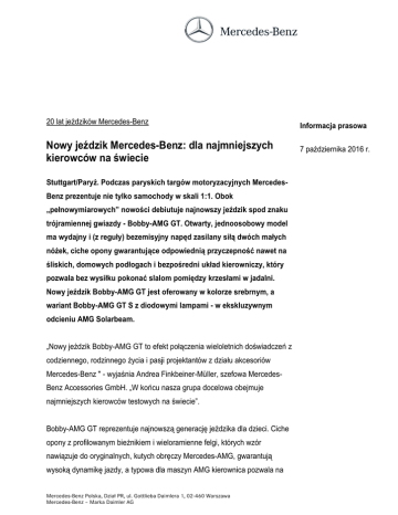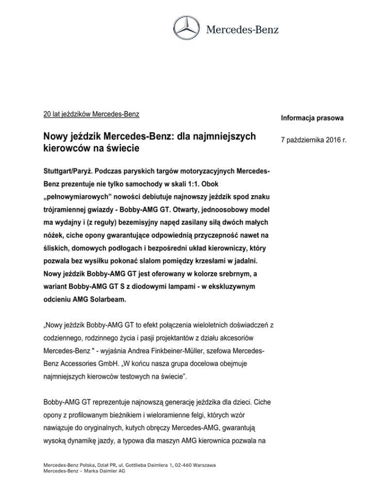 20 lat jeździków Mercedes-Benz Nowy jeździk Mercedes-Benz: dla najmniejszych kierowców na świecie Stuttgart/Paryż. Podczas paryskich targów motoryzacyjnych MercedesBenz prezentuje nie tylko samochody w skali 1:1. Obok „pełnowymiarowych” nowości debiutuje najnowszy jeździk spod znaku trójramiennej gwiazdy - Bobby-AMG GT. Otwarty, jednoosobowy model ma wydajny i (z reguły) bezemisyjny napęd zasilany siłą dwóch małych nóżek, ciche opony gwarantujące odpowiednią przyczepność nawet na śliskich, domowych podłogach i bezpośredni układ kierowniczy, który pozwala bez wysiłku pokonać slalom pomiędzy krzesłami w jadalni. Nowy jeździk Bobby-AMG GT jest oferowany w kolorze srebrnym, a wariant Bobby-AMG GT S z diodowymi lampami - w ekskluzywnym odcieniu AMG Solarbeam. „Nowy jeździk Bobby-AMG GT to efekt połączenia wieloletnich doświadczeń z codziennego, rodzinnego życia i pasji projektantów z działu akcesoriów Mercedes-Benz " - wyjaśnia Andrea Finkbeiner-Müller, szefowa MercedesBenz Accessories GmbH. „W końcu nasza grupa docelowa obejmuje najmniejszych kierowców testowych na świecie”. Bobby-AMG GT reprezentuje najnowszą generację jeździka dla dzieci. Ciche opony z profilowanym bieżnikiem i wieloramienne felgi, których wzór nawiązuje do oryginalnych, kutych obręczy Mercedes-AMG, gwarantują wysoką dynamikę jazdy, a typowa dla maszyn AMG kierownica pozwala na Mercedes-Benz Polska, Dział PR, ul. Gottlieba Daimlera 1, 02-460 Warszawa Mercedes-Benz – Marka Daimler AG Informacja prasowa 7 października 2016 r. Strona 2 bezpieczne manewrowanie. Do „prawdziwego” AMG GT odwołuje się również starannie odwzorowany kształt lamp z przeźroczystymi kloszami. Kierowca jeździka siedzi na wygodnej, wypełnionej pianką poduszce z czerwonym obiciem. Nowe modele Bobby-AMG dostarczane są z zestawem naklejek, a precyzyjny, bezstopniowy dwuprzegubowy układ kierowniczy zapewnia im dużą zwrotność. Nowy jeździk można także zamówić w wersji Bobby-AMG GT S, wyposażonej w diodowe lampy - przednie i tylne. Poza efektownym oświetleniem wyróżnia go równie efektowny lakier AMG solarbeam. Podobnie jak pierwowzór, jeździk ma kierownicę ze spłaszczonym u dołu wieńcem, panel wskaźników z dwiema tubami i ciche opony z czarnymi felgami, stylizowanymi na kute obręcze AMG. Umieszczony na desce rozdzielczej przełącznik umożliwia błyskawiczne uruchomienie świateł do jazdy dziennej oraz mijania. Lista wyposażenia obejmuje też wypełnione pianką siedzenie w kolorze czarnym oraz zestaw naklejek. W ofercie będzie też specjalna edycja jeździka Bobby-AMG GT o nazwie „Tribute to Bambi” z wyjątkowym zestawem naklejek poświęconym niemieckiej reprezentacji w piłkę nożną. Limitowany do 1000 egzemplarzy wariant ma czarne nadwozie, czarne obręcze i czerwony fotel. Dochód z jego sprzedaży trafi do fundacji „Tribute to Bambi”, działającej na rzecz potrzebujących dzieci. Wszystkie trzy modele wykonano z wytrzymałego plastiku. Zaprojektowano je z myślą o dzieciach w wieku 18 miesięcy i starszych. Bobby-AMG GT jest Mercedes-Benz Polska, Dział PR, ul. Gottlieba Daimlera 1, 02-460 Warszawa Mercedes-Benz – Marka Daimler AG Strona 3 produkowany przez twórcę jeździka Bobby Car, firmę BIG z Burghaslach w Bawarii. Bobby-AMG GT jest dostępny w polskiej ofercie akcesoriów Mercedes-Benz od 7 października, a wariant GT S będzie w sprzedaży od 28 października br. Czy wiesz, że... ...pierwszy Bobby-Benz trafił do żłobków ponad 20 lat temu? Stworzono go w oparciu o model SLK serii R 170 - i właśnie do jego żółtego lakieru nawiązuje nowy Bobby-AMG GT S w kolorze AMG solarbeam. ...firma BIG produkuje jeździki Bobby Car od 1972 roku? Do dziś zbudowała ich ponad 17 milionów. W efekcie to najlepiej sprzedający się jeździk świata. A nazwa „Bobby Car” w wielu krajach stała się synonimem jeździków wszystkich producentów. ...od lat 90. odbywają się oficjalne wyścigi jeździków Bobby Car? Seria wyścigów jest organizowana przez klub Bobby-Car-Sport-Verband (http://bobbycarclub.de/). Dzieciaki, młodzież, amatorzy i profesjonalni zawodnicy startują seryjnymi lub zmodyfikowanymi jeździkami w walce o lokalne tytuły mistrzowskie oraz punkty w pucharze światowym. ...rekord prędkości profesjonalnego, wyścigowego jeździka Bobby Car wynosi 115 km/h? Marcel Paul z klubu Bobby-Car-Club w Altenhain Mercedes-Benz Polska, Dział PR, ul. Gottlieba Daimlera 1, 02-460 Warszawa Mercedes-Benz – Marka Daimler AG Strona 4 ustanowił go - zgodnie z oficjalnymi przepisami - 7 września 2012 r. podczas jazd testowych w ramach Festiwalu Prędkości w Gedern. ...do dziś powstało ponad 100 różnych odmian jeździka Bobby Car? Ich lista obejmuje m.in. trzy generacje Mercedesa SLK, a także współczesnego Gullwinga - model SLS AMG. Wszystkie pojazdy są wytwarzane w Niemczech, w fabryce firmy BIG w Burghaslach. ...od 2012 roku Mercedes-Benz pomaga w organizacji gali wręczania nagród BAMBI i buduje tor dla jeździków Bobby Car? Za każde okrążenie, które pokonają obecne na imprezie gwiazdy, producent ze Stuttgartu przekazuje 100 euro na rzecz „Tribute to Bambi” - fundacji zajmującej się wspieraniem potrzebujących dzieci. Jeździki z autografami znanych osobistości trafiają później na aukcję, z której dochód również zasila konto organizacji, podobnie jak środki ze sprzedaży licznych, limitowanych do 1000 egzemplarzy serii modeli Bobby-Benz. W 2015 roku łączne wpływy z działalności Mercedes-Benz na rzecz fundacji „Tribute to Bambi” wyniosły około 100 tysięcy euro. ...stworzono specjalną stronę internetową dla nabywców jeździków, z poradami i testami? Kompleksowe informacje można znaleźć pod adresem http://bobby-car-ratgeber.de/. Kontakt: Aleksander Rzepecki e-mail: [email protected] Mercedes-Benz Polska, Dział PR, ul. Gottlieba Daimlera 1, 02-460 Warszawa Mercedes-Benz