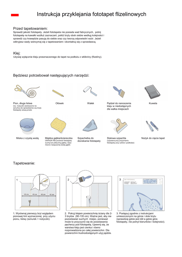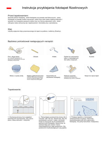 Instrukcja przyklejania fototapet flizelinowych Przed tapetowaniem: Sprawdź jakość fototapety. Jeżeli fototapeta nie posiada wad fabrycznych, potnij fototapetę na kawałki wzdłuż zaznaczeń, połóż bryty obok siebie według kolejności i sprawdź czy krawędzie pasują do siebie oraz czy tworzą odpowiedni wzór. Jeżeli odkryjesz wady wstrzymaj się z tapetowaniem i skontaktuj się z sprzedawcą. Klej: Używaj wyłącznie kleju przeznaczonego do tapet na podłożu z włókniny (flizeliny). Będziesz potrzebował następujących narzędzi: Pion, długa listwa Ołówek Wałek (np. nożyczki zawieszone na sznurku) do sprawdzenia czy bryty fototapety wiszą prosto Miska z czystą wodą Miękka gąbka/ściereczka UWAGA! Nie pocierać fototapety suchą lub półsuchą gąbką. Użyć mocno nasączonej wodą gąbki. Szpachelka do dociskania fototapety Pędzel do nanoszenia kleju w niedostępnych dla wałka miejscach Stalowa szpachla Kuweta Nożyk do cięcia tapet (używana przy przycinaniu fototapety przy suficie i podłodze) Tapetowanie: 1. Wyrównaj pierwszy bryt względem pionowej linii wyznaczonej przy użyciu pionu, listwy (sznurek + nożyczki). 2. Pokryj klejem powierzchnię ściany dla 23 brytów (90-135 cm). Ważne jest, aby nie pozostawiać suchych miejsc, ponieważ może to przyczynić się do powstawania pęcherzy pod fototapetą. Upewnij się, że warstwa kleju jest cienka i równo rozprowadzona po całej powierzchni. Dla powierzchni trudnodostępnych użyj pędzla. 3. Postępuj zgodnie z instrukcjami umieszczonymi na górze i dole brytu (sprawdzaj gdzie jest dół a gdzie góra fototapety, nie pomyl kierunków i kolejności). 4. Podczas przykładania fototapety do ściany złóż ją w połowie do wewnątrz, aby uniknąć ubrudzenia przedniej strony klejem. Przyłóż górną część brytu do ściany na prawidłowej wysokości oraz pozycji i opuść fototapetę w dół. 5. Dopasuj górną i dolną część brytu względem pionu przed przystąpieniem do dociskania jej do ściany. Nigdy nie próbuj poprawiać położenia na ścianie. Jeżeli popełniłeś błąd, zdejmij bryt i zacznij pasowanie od nowa. Posmaruj ponownie ścianę klejem, jeżeli pierwsza warstwa wyschła. Nie smaruj klejem tapety ! 6. Użyj szpachelki dociskowej aby usunąć nadmiar kleju oraz pęcherzyki powietrza. Zachowuj czystość szpachelki! Ciągle czyść szpachelkę aby usunąć wszelkie pozostałości kleju i tonera/tuszu. Dociskaj szpachelką bryt od góry do dołu i od środka do krawędzi brytu. 7. Przyłóż kolejny bryt dopasowując jego krawędzie względem siebie. Upewnij się, że wzór się zgadza. Ważne jest, aby nie brakowało kleju na styku brytów. W przeciwnym razie widoczne pozostaną odstające styki pasów fototapety. 8. Odetnij wszystkie części, które nie są elementem wzoru fototapety (instrukcje, białe krawędzie itp.). Użyj metalowej listwy do przy odcinaniu. Wymieniaj często ostrze nożyka. Tępe ostrze może doprowadzić do oderwania od ściany lub uszkodzenia fototapety. 9. Kontynuuj czynności w powyższy sposób, aż do ukończenia tapetowania na całej ścianie. Pytania i odpowiedzi: Usuń klej! Jeżeli zabrudziłeś przednią stronę fototapety klejem, zetrzyj go przy użyciu wilgotnej gąbki. Nie dociskaj jej mocno do fototapety, ewentualnie użyj więcej wody. Sucha gąbka działa na fototapetę jak materiał ścierny. Tapetowanie na płycie gipsowo-kartonowej lub płycie wiórowej? Zastosuj koniecznie warstwę wstępną/gruntującą klejem lub warstwę podkładową. W przeciwnym razie, powierzchnia będzie absorbować wodę z kleju a wynik przyklejania będzie niesatysfakcjonujący. Fototapeta jest niejednolita! Nowo ułożona fototapeta może zawierać pęcherze i plamy. Mogą one zniknąć po 24 godzinach ale przebarwienia z farb i plamy z przemoczenia niewłaściwymi klejami mogą pozostać. Tapetowanie na włóknie szklanym lub materiale malowanym? Powierzchnia ściany musi być zaszpachlowana i zeszlifowana. Zastosuj gruntowanie klejem. Wietrz pokój! Pamiętaj aby nie zamykać pokoju z nowo przyklejoną fototapetą. Pozostaw dopływ powietrza i utrzymuj normalną temperaturę powietrza w pomieszczeniu, w celu zapewnienia prawidłowego wyschnięcia fototapety. Temperatura w pomieszczeniu powinna wynosić minimum 18 °C. Kontrastowe tło! Wykonaj malowanie podkładowe w celu ujednolicenia koloru podłoża i fototapety dla zamaskowania połączeń na kontrastującej powierzchni ściany. Zadarte krawędzie, pęcherze i odstępy? Problemy te nie wynikają z jakości fototapety, a z ilości użytego kleju, jakości tapetowanej powierzchni lub samego sposobu tapetowania. Uszkodzona fototapeta wymieniana jest na towar wolny od wad. Sprzedawca nie odpowiada za malowanie, ponowne tapetowania a także nie ponosi kosztów związanych z czasem pracy i podobnymi szkodami pośrednimi. Wyłącznie gładka powierzchnia! Przed tapetowaniem, usuń dokładnie z podłoża pozostałości po papierowych, winylowych, tekstylnych oraz strukturalnych tapetach. Tapetowanie na pomalowanej powierzchni? Powierzchnia powinna zostać umyta środkiem odtłuszczającym i spłukana wodą, w szczególności jeżeli zostały użyte farby o wysokim stopniu połysku.