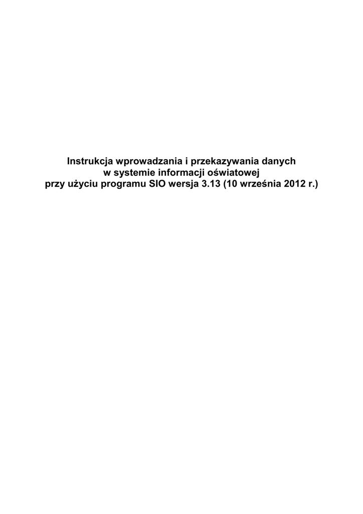 Instrukcja wprowadzania i przekazywania danych w systemie informacji oświatowej przy uŜyciu programu SIO wersja 3.13 (10 września 2012 r.) Podstawy prawne systemu informacji oświatowej (dalej: SIO) stanowią: 1. ustawa z dnia 15 kwietnia 2011 r. o systemie informacji oświatowej (Dz. U. Nr 139, poz. 814), zwana dalej ustawą, 2. rozporządzenie Ministra Edukacji Narodowej z dnia …………………………….. w sprawie szczegółowego zakresu danych w bazach danych oświatowych, zakresu danych identyfikujących podmioty prowadzące bazy danych oświatowych, terminów przekazywania danych między bazami danych oświatowych oraz wzorów wydruków zestawień zbiorczych (Dz. U. ……………………..), zwane dalej rozporządzeniem. Uwaga! Obecna edycja gromadzenia danych w systemie informacji oświatowej odbywa się zasadniczo na tych samych zasadach, co w poprzednich latach. NaleŜy jednak zwrócić uwagę, Ŝe zmieniły się podstawy prawne gromadzenia danych. Obecnie są one określone w art. 106 – 118 wyŜej wymienionej ustawy i rozporządzenia wykonawczego. Według stanu na 10 września aktualizowane są dane niezbędne do: 1) oszacowania wstępnej wysokości części oświatowej subwencji ogólnej dla jednostek samorządu terytorialnego; przepis art. 33 ustawy z dnia 13 listopada 2003 r. o dochodach jednostek samorządu terytorialnego (Dz. U. z 2010 r. Nr 80, poz. 526, z późn. zm.), 2) wydania aktów prawnych dotyczących regulacji płac nauczycieli na podstawie art. 30 ust. 5 i 6 ustawy z dnia 26 stycznia 1982 r. – Karta Nauczyciela. Dane wg stanu na 10 września aktualizują i przekazują: - w zakresie liczby uczniów: 1) szkoły publiczne prowadzone przez: jednostki samorządu terytorialnego (JST), osoby fizyczne i osoby prawne inne niŜ JST, 2) szkoły niepubliczne z uprawnieniami szkół publicznych i bez uprawnień szkół publicznych (z wyjątkiem niepublicznych szkół artystycznych), 3) publiczne i niepubliczne kolegia nauczycielskie, nauczycielskie kolegia języków obcych, kolegia pracowników słuŜb społecznych. - w zakresie liczby nauczycieli: 1) przedszkola publiczne (w tym inne formy wychowania przedszkolnego), szkoły publiczne i placówki publiczne prowadzone przez jednostki samorządu terytorialnego i organy administracji rządowej, 2) publiczne kolegia nauczycielskie, nauczycielskie kolegia języków obcych, kolegia pracowników słuŜb społecznych, 3) organy administracji rządowej, kuratoria oświaty, specjalistyczne jednostki nadzoru, Centralna Komisja Egzaminacyjna i okręgowe komisje egzaminacyjne. 2 Nie prowadzą baz danych oświatowych i nie przekazują danych wg stanu na 10 września następujące podmioty zobowiązane do prowadzenia baz danych oświatowych: 1) przedszkola publiczne prowadzone przez osoby fizyczne i osoby prawne inne niŜ jednostki samorządu terytorialnego oraz przedszkola niepubliczne, 2) niepubliczne szkoły artystyczne, 3) placówki publiczne prowadzone przez osoby fizyczne i osoby prawne inne niŜ jednostki samorządu terytorialnego oraz placówki niepubliczne, 4) zespoły obsługi ekonomiczno-administracyjnej szkół, o których mowa w art. 5 ust. 9 ustawy o systemie oświaty. Uwaga! Przez placówkę w pkt 3 powyŜej naleŜy rozumieć jednostkę, która nie jest przedszkolem, szkołą ani kolegium. Nie przekazują danych wg stanu na 10 września równieŜ takie szkoły lub placówki publiczne, które funkcjonują, ale w dniu 10 września nie mają uczniów ani nie zatrudniają nauczycieli, np. liceum uzupełniające, które nie dokonało naboru, nie ma uczniów w klasach II, ale nie zostało zlikwidowane. Podobnie sezonowe schronisko młodzieŜowe, które w dniu 10 września nie zatrudnia Ŝadnego nauczyciela. I. Identyfikacja Dane identyfikacyjne wprowadzane są do systemu na tych samych zasadach co w poprzednich edycjach SIO. Dane wprowadzone do bazy wg stanu na 10 września moŜna będzie importować do bazy wg stanu na 30 września. Tabela I1. Identyfikacja Wiersz 1 - Nazwa – naleŜy wpisać urzędową nazwę podmiotu prowadzącego bazę danych oświatowych, zgodnie z aktem załoŜycielskim lub wpisem do ewidencji - w przypadku szkół i placówek niepublicznych. W nazwie szkoły funkcjonującej w zespole naleŜy pominąć nazwę zespołu (poniewaŜ nazwa ta jest zapisana w tablicy identyfikacji zespołu) oraz patrona (poniewaŜ jest on wpisywany w osobnym polu). Nazwa nie moŜe być dłuŜsza niŜ 120 znaków łącznie ze spacjami. Wiersz 2 - Patron – naleŜy wpisać patrona w mianowniku, np. „Henryk Sienkiewicz” lub w dopełniaczu, np. „Powstańców Śląskich”. Wiersz 3 - Numer REGON – W programie przyjęto zasadę, Ŝe REGON wpisuje się jako numer czternastoznakowy. Oznacza to, Ŝe numery dziewięcioznakowe naleŜy uzupełnić do czternastu znaków zerami na końcu. Jednostki samorządu terytorialnego, pełniące jednocześnie funkcje gminy i powiatu, czyli miasta na prawach powiatu, posiadają jeden numer REGON dla urzędu obsługującego tę jednostkę. W polu dotyczącym typu jednostki naleŜy wpisać miasto na prawach powiatu (uwaga ta dotyczy tylko identyfikacji jednostek samorządu terytorialnego). 3 W kaŜdym numerze REGON jest liczba kontrolna, która pozwala sprawdzić, czy został on prawidłowo wpisany. Podstawę prawną nadawania numeru REGON stanowi rozporządzenie Rady Ministrów z dnia 27 lipca 1999 r. w sprawie sposobu i metodologii prowadzenia i aktualizacji rejestru podmiotów gospodarki narodowej, w tym wzorów wniosków, ankiet i zaświadczeń, oraz szczegółowych warunków i trybu współdziałania słuŜb statystyki publicznej z innymi organami prowadzącymi urzędowe rejestry i systemy informacyjne administracji publicznej (Dz. U. Nr 69, poz. 763, z późn. zm.). Wiersz 4 - Typ – wpisuje się automatycznie zgodnie z wyborem dokonanym na pierwszym ekranie. WaŜne jest sprawdzenie, czy typ szkoły/placówki został wybrany prawidłowo. Wykaz wszystkich typów szkół i