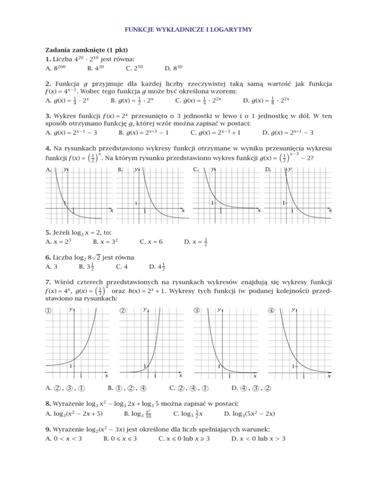 FUNKCJE WYKŁADNICZE I LOGARYTMY Zadania zamknięte (1 pkt