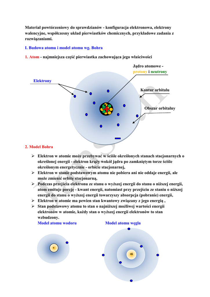 Materiał powtórzeniowy do sprawdzianów - konfiguracja elektronowa, elektrony walencyjne, współczesny układ pierwiastków chemicznych, przykładowe zadania z rozwiązaniami. I. Budowa atomu i model atomu wg. Bohra 1. Atom - najmniejsza część pierwiastka zachowująca jego właściwości Jądro atomowe protony i neutrony Elektrony Kontur orbitalu Obszar orbitalny 2. Model Bohra Elektron w atomie może przebywać w ściśle określonych stanach stacjonarnych o określonej energii - elektron krąży wokół jądra po zamkniętym torze ściśle określonym energetycznie - orbicie stacjonarnej, Elektron w stanie podstawowym atomu nie pobiera ani nie oddaje energii, ale może zmienić orbitę stacjonarną, Podczas przejścia elektronu ze stanu o wyższej energii do stanu o niższej energii, atom emituje porcję - kwant energii, natomiast przy przejściu ze staniu o niższej energii do stanu o wyższej energii towarzyszy absorpcja (pobranie) energii, Elektron w atomie ma pewien stan kwantowy związany z jego energią , Stan podstawowy atomu to stan o najniższej możliwej wartości energii elektronów w atomie, każdy stan o wyższej energii elektronów to stan wzbudzony. Model atomu wodoru Model atomu węgla + +6 6 2. Kwantowo-mechaniczny model atomu Korpuskularno-falowa natura elektronu (dualizm korpuskularno-falowy) elektron jest jednocześnie cząstką materii (korpuskułą posiadającą masę) i falą o określonej długości (fala elektromagnetyczna) Zasada nieznaczności Heisenberga: nie jest możliwe jednoczesne określenie z dowolną dokładnością położenia i pędu cząstki elementarnej (elektronu), czyli jednoczesnego określenia toru po którym porusza się elektron w atomie i gdzie się on znajduje w danym momencie, istnieje tylko określenie prawdopodobieństwa znalezienia elektronu w określonym czasie w dowolnie wybranym punkcie przestrzeni wokół jądra (w chmurze elektronowej), chmura elektronowa jest mocniej zagęszczona, tam gdzie prawdopodobieństwo jest duże, zagęszczenie jest mniejsze gdzie prawdopodobieństwo jest mniejsze, Równanie falowe Schrődingera Rozwiązaniem równania jest funkcja falowa Ψ, zwana orbitalem atomowym. Kwadrat funkcji | Ψ|2 jest proporcjonalna do prawdopodobieństwa znalezienie elektronu na orbitalu, Orbital atomowy i kontur orbitalu Orbital atomowy - funkcja falowa opisująca stan elektronu w atomie, jest to przestrzeń, w której prawdopodobieństwo znalezienia elektronu jest największe. Kontur orbitalu - powierzchnia ograniczająca obszar o tej samej gęstości chmury elektronowej. 3. Kształty konturów orbitali i stany energetyczne orbitali Orbital typu s (kulisty) o najniższym poziome energetycznym y kontur orbitalu x obszar orbitalny z Orbitale tupu p (równoramienna klepsydra) px y py y y pz y x z z z Stany energetyczne orbitali s < p < d < f kierunek wzrostu poziomów energetycznych Stany energetyczne elektronu warstwie orbitali 1s, 2s, 3s 1s 2s 3s kierunek wzrostu poziomów energetycznych 4. Liczby kwantowe - każdy elektron (stan kwantowy elektronu) opisują liczby kwantowe, w atomie n i l a w zewnętrznym polu magnetycznym liczby kwantowe n, l, m i ms. Główna liczba kwantowa n określa energię elektronu w atomie, przyjmuje wartości liczb naturalnych : n = 1, 2, 3, 4, 5, 6, 7, stany kwantowe (elektrony) o takiej samej wartości głównej liczby kwantowej tworzą zbiór elektronów nazywany powłoką elektronową, maksymalną liczbę stanów kwantowych, które mogą obsadzać daną powłokę elektronową oblicza się z wyrażenia: 2n2 praktyczne decyduje o całkowitej energii elektronu, liczbie powłok i rozmiarach konturu orbitalu Wartość głównej liczby kwantowej n 1 2 3 4 5 6 7 K2 Symbol powłoki elektronowej K L M N O P Q Maksymalna liczba stanów kwantowych - elektronów 2 8 18 32 50 72 98 L8 M18 N32 O50 P72 Q98 2 3 4 5 6 7 + n= 1 Poboczna (orbitalna) liczba kwantowa l Rozróżnia stany energetyczne elektronów w tej samej powłoce i charakteryzuje symetrię podpowłok elektronowych (orbitali), przyjmuje wartości liczb całkowitych : 0 ≤ l ≤ (n -1) i może przyjąć tyle wartości jaką ma wartość n (zawsze od 0 do n - 1) Stany kwantowe o tej samej wartości głównej liczby kwantowej n i tej samej wartości pobocznej liczby kwantowej l tworzą zbiór elektronów nazywany podpowłoką elektronową (orbitalem), Maksymalną liczbę stanów kwantowych (elektronów), które mogą obsadzać poszczególne podpowłoki (orbitale) oblicza się z wyrażenia 4·l +2, Praktycznie określa liczbę podpowłok (orbitali) w powłoce, decyduje o kształcie konturu orbitalu. Główna liczba kwantowa n 1 Symbol powłoki elektronowej K2 2 L8 3 M18 4 N32 Orbitalna liczba kwantowa l 0 0 1 0 1 2 0 1 2 3 Symbol Max. liczba podpowłoki - stanów orbitali kwantowych s 2 s 2 p 6 s 2 p 6 d 10 s 2 p 4 d 10 f 14 Wnioski: w 1 powłoce K2 jest tylko jedna podpowłoka s, którą mogą obsadzać maksymalnie 2 elektrony: 1s2 w 2 powłoce L8 mogą wystąpić dwie podpowłoki: s i p, które mogą być obsadzane maksymalne przez : s 2 elektrony a p 6 elektronów: 2s2 i 2p6, w 3 powłoce M16 mogą wystąpić trzy podpowłoki: s, p i d, które mogą być obsadzone maksymalnie przez : s 2 elektrony, p 6 elektronów, d 10 elektronów: 3s2 3p6 i 3d10 w 4 powłoce N32 mogą wystąpić cztery podpowłoki: s, p, d i f, które mogą być obsadzone maksymalnie przez: s 2 elektrony, p 6 elektronów, d 10 elektronów i f 14 elektronów: 4s2, 4p6, 4d10 i 4f14 Magnetyczna liczba kwantowa m określa liczbę poziomów orbitalnych w danej podpowłoce związanych z ułożeniem się orbitali w przestrzeni pod wpływem zewnętrznego pola magnetycznego (decyduje o orientacji przestrzennej konturu orbitalu), m przyjmuje wartości liczb całkowitych - l ≤ l ≤ +l Główna Poboczna Typ Magnetyczne Liczba liczba liczba podpowłoki liczba kwantowa poziomów kwantowa n kwantowa l m orbitalnych 1 0 s 0 1 0 s 0 1 2 1 p -1, 0, 1 3 0 s 0 1 3 1 p -1, 0, 1, 3 2 d -2, -