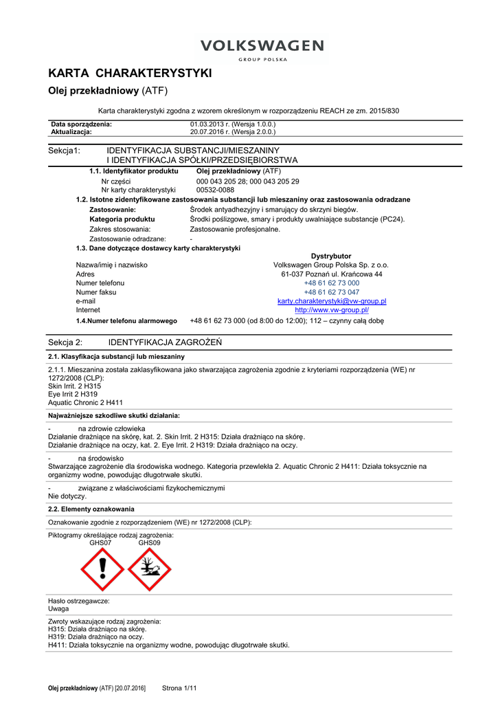KARTA CHARAKTERYSTYKI Olej przekładniowy (ATF) Karta charakterystyki zgodna z wzorem określonym w rozporządzeniu REACH ze zm. 2015/830 Data sporządzenia: Aktualizacja: Sekcja1: 01.03.2013 r. (Wersja 1.0.0.) 20.07.2016 r. (Wersja 2.0.0.) IDENTYFIKACJA SUBSTANCJI/MIESZANINY I IDENTYFIKACJA SPÓŁKI/PRZEDSIĘBIORSTWA 1.1. Identyfikator produktu Olej przekładniowy (ATF) Nr części 000 043 205 28; 000 043 205 29 Nr karty charakterystyki 00532-0088 1.2. Istotne zidentyfikowane zastosowania substancji lub mieszaniny oraz zastosowania odradzane Zastosowanie: Środek antyadhezyjny i smarujący do skrzyni biegów. Kategoria produktu Środki poślizgowe, smary i produkty uwalniające substancje (PC24). Zakres stosowania: Zastosowanie profesjonalne. Zastosowanie odradzane: 1.3. Dane dotyczące dostawcy karty charakterystyki Dystrybutor Volkswagen Group Polska Sp. z o.o. 61-037 Poznań ul. Krańcowa 44 +48 61 62 73 000 +48 61 62 73 047 [email protected] http://www.vw-group.pl/ Nazwa/imię i nazwisko Adres Numer telefonu Numer faksu e-mail Internet 1.4.Numer telefonu alarmowego Sekcja 2: +48 61 62 73 000 (od 8:00 do 12:00); 112 – czynny całą dobę IDENTYFIKACJA ZAGROŻEŃ 2.1. Klasyfikacja substancji lub mieszaniny 2.1.1. Mieszanina została zaklasyfikowana jako stwarzająca zagrożenia zgodnie z kryteriami rozporządzenia (WE) nr 1272/2008 (CLP): Skin Irrit. 2 H315 Eye Irrit 2 H319 Aquatic Chronic 2 H411 Najważniejsze szkodliwe skutki działania: na zdrowie człowieka Działanie drażniące na skórę, kat. 2. Skin Irrit. 2 H315: Działa drażniąco na skórę. Działanie drażniące na oczy, kat. 2. Eye Irrit. 2 H319: Działa drażniąco na oczy. na środowisko Stwarzające zagrożenie dla środowiska wodnego. Kategoria przewlekła 2. Aquatic Chronic 2 H411: Działa toksycznie na organizmy wodne, powodując długotrwałe skutki. związane z właściwościami fizykochemicznymi Nie dotyczy. 2.2. Elementy oznakowania Oznakowanie zgodnie z rozporządzeniem (WE) nr 1272/2008 (CLP): Piktogramy określające rodzaj zagrożenia: GHS07 GHS09 Hasło ostrzegawcze: Uwaga Zwroty wskazujące rodzaj zagrożenia: H315: Działa drażniąco na skórę. H319: Działa drażniąco na oczy. H411: Działa toksycznie na organizmy wodne, powodując długotrwałe skutki. Olej przekładniowy (ATF) [20.07.2016] Strona 1/11 KARTA CHARAKTERYSTYKI Olej przekładniowy (ATF) Sekcja 2: IDENTYFIKACJA ZAGROŻEŃ Zwroty wskazujące środki ostrożności: P262: Nie wprowadzać do oczu, na skórę lub na odzież. P280: Stosować rękawice ochronne/odzież ochronną/ochronę oczu/ochronę twarzy. P501: Zawartość/pojemnik usuwać na składowiska odpadów niebezpiecznych. Informacje uzupełniające o zagrożeniach: Nie podano Etykieta powinna zawierać identyfikator produktu, o którym mowa w art. 18 rozp. CLP oraz nazwę, adres i telefon dostawcy danej mieszaniny. Dane identyfikujące wszystkie substancje w mieszaninie, które decydują o jej zaklasyfikowaniu zgodnie z Art. 18 pkt. 3b. Nie dotyczy. 2.3. Inne zagrożenia 2.3.1 Ocena PBT lub vPvB zgodnie z zał. XIII REACH – substancje zawarte w mieszaninie nie zostały zakwalifikowane jako PBT lub vPvB. Kryteria PBT i vPvB zawarte są w Aneksie XIII REACH. 2.3.2. Informacje dotyczące innych zagrożeń, które nie powodują zaklasyfikowania, a które mogą przyczynić się do ogólnych zagrożeń powodowanych przez mieszaninę. Zgodnie z informacją producenta urazy spowodowane przez wtrysk produktu pod wysokim ciśnieniem wymagają natychmiastowej interwencji chirurgicznej, a w razie potrzeby zastosowania leczenia sterydami w celu zminimalizowania ryzyka uszkodzeń tkanki i zaburzeń czynnościowych. Sekcja 3. SKŁAD/INFORMACJA O SKŁADNIKACH 3.1. Substancje 3.2. Mieszaniny Opis ogólny: Mieszanina wysokorafinowanych olejów mineralnych. Spis substancji w mieszaninie: a) Substancje stanowiące zagrożenie dla zdrowia lub środowiska w rozumieniu rozporządzenia (WE) nr 1272/2008 Produkty reakcji N-fenylobenzenoaminy z 2,4,4trimetylopentenem: Substancja UVCB Zawartość: Nr CAS: Nr WE: Nr indeksowy: Nr rejestracji: Klasyfikacja substancji zgodnie z rozporządzeniem (WE) nr 1272/2008 1-5% 68411-46-1 270-128-1 01-2119491299-23-xxxx Aquatic Chronic 2 H411 Rozgałęzione estry alkilowe 3,5-bis (1,1-dimetyloetylo)-4-hydroksyC7-C9-kwasu benzenopropionowego: Substancja UVCB Zawartość: Nr CAS: Nr WE: Nr indeksowy: Nr rejestracji: Klasyfikacja substancji zgodnie z rozporządzeniem (WE) nr 1272/2008 Produkty reakcji związków alkilotioalkoholowych podstawionych związkami fosforowymi(Fosforan(III) alkilu: Substancja UVCB Zawartość: Nr CAS: Nr WE: Nr indeksowy: Nr rejestracji: Klasyfikacja substancji zgodnie z rozporządzeniem (WE) nr 1272/2008 Olej przekładniowy (ATF) [20.07.2016] Strona 2/11 1-5% 125643-61-0 406-040-9 607-530-00-7 01-2119830067-43-xxxx Aquatic Chronic 4 H413 0,1-1% 424-820-7 01-0000017126-75 -xxxx Skin Corr. 1B H314 Acute Tox. 4 H312 KARTA CHARAKTERYSTYKI Olej przekładniowy (ATF) Sekcja 3. SKŁAD/INFORMACJA O SKŁADNIKACH Aquatic Acute 1 H400 Aquatic Chronic 1 H410 b) Substancje, dla których istnieją wspólnotowe najwyższe dopuszczalne stężenia w środowisku pracy, które nie zostały zawarte w lit. a): c) substancje trwałe, wykazujące zdolność do bioakumulacji i toksyczne lub bardzo trwałe i wykazujące bardzo dużą zdolność do bioakumulacji zgodnie z kryteriami zawartymi w załączniku XIII lub substancje zawarte w wykazie sporządzonym zgodnie z art. 59 ust. 1 z powodów innych niż zagrożenia, o których mowa w lit. a): W mieszaninie nie występują ww. substancje. Objaśnienia stosowanych skrótów podano w sekcji 16. Sekcja 4. ŚRODKI PIERWSZEJ POMOCY 4.1. Opis środków pierwszej pomocy Narażenie przez drogi oddechowe Wyprowadzić lub wynieść poszkodowanego na świeże powietrze (ratownicy muszą być wyposażeni w odpowiednie środki ochrony indywidualnej – patrz sekcja 8). Przepłukać wodą jamę ustną i jamę nosową. Zapewnić po