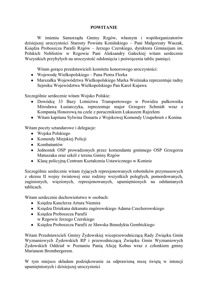 POWITANIE W imieniu Samorządu Gminy Rzgów, własnym i współorganizatorów dzisiejszej uroczystości Starosty Powiatu Konińskiego – Pani Małgorzaty Waszak, Księdza Proboszcza Parafii Rzgów – Jerzego Czerskiego, dyrektora Gimnazjum im. Polskich Noblistów w Rzgowie Pani Aleksandry Gałeckiej witam serdecznie Wszystkich przybyłych na uroczystość odsłonięcia i poświęcenia tablic pamięci. Witam gorąco przedstawicieli komitetu honorowego uroczystości: Wojewodę Wielkopolskiego – Pana Piotra Florka Marszałka Województwa Wielkopolskiego Marka Woźniaka reprezentuje radny Sejmiku Województwa Wielkopolskiego Pan Karol Kujawa Szczególnie serdecznie witam Wojsko Polskie: Dowódcę 33 Bazy Lotnictwa Transportowego w Powidzu pułkownika Mirosława Łusiarczyka, reprezentuje major Grzegorz Schmidt wraz z Kompanią Honorową na czele z porucznikiem Łukaszem Rajzelem Witam kapitana Sylwina Donarta z Wojskowej Komendy Uzupełnień z Konina Witam poczty sztandarowe i delegacje: Wojska Polskiego Komendy Miejskiej Policji Kombatantów Jednostek OSP prowadzonych przez komendanta gminnego OSP Grzegorza Matuszaka oraz szkół z terenu Gminy Rzgów Klasę policyjną Centrum Kształcenia Ustawicznego w Koninie Szczególnie serdecznie witam żyjących represjonowanych robotników przymusowych z okresu II wojny światowej oraz rodziny wszystkich poległych, pomordowanych, zaginionych, więzionych, represjonowanych, upamiętnionych na odsłanianych tablicach. Witam serdecznie duchowieństwo w osobach: Księdza Kanclerza Artura Niemira Księdza Dziekana dekanatu zagórowskiego Adama Czechorowskiego Księdza Proboszcza Parafii w Rzgowie Jerzego Czerskiego Księdza Proboszcza Parafii ze Sławska Benedykta Gembickiego Witam Przedstawicieli Gminy Żydowskiej wiceprzewodniczącą Rady Związku Gmin Wyznaniowych Żydowskich RP i przewodniczącą Związku Gmin Wyznaniowych Żydowskich Oddział w Poznaniu Panią Alicję Kobus wraz z członkiem gminy Marianem Brombergerem. W tym miejscu składam podziękowanie za odprawioną mszę świętą w intencji upamiętnionych i dzisiejszej uroczystości Witam przybyłych samorządowców z miast i gmin: Prezydenta Miasta Konina reprezentuje Pan Czesław Botor Witam delegację bliźniaczego Rzgowa koło Łodzi na czele z Przewodniczącym Rady Miejskiej Rzgowa Markiem Bartoszewskim Burmistrza Rychwała Pana Stefana Dziamarę Witam służby mundurowe na czele z Komendantem Miejskim Policji w Koninie Sławomirem Jądrzakiem. Prezesa Gminnego OSP RP – Radosława Rydzewskiego Witam środowiska kombatanckie z prezesem Koła Kombatantów w Koninie Panem Kazimierzem Samulczykiem oraz opiekunem Koła z Zagórowa Jarosławem Buziakiem Witam Kazimierza Brzega i Andrzeja Bernata z Fundacji „Pro Memoria” w Zagórowie, Prezesa Ludowego Banku Spółdzielczego w Strzałkowie Tadeusza Krotoszyńskiego, Kierownika Archiwum Państwowego w Poznaniu Oddział w Koninie Pana Piotra Rybczyńskiego. Witam Przewodniczącą Rady Gminy Rzgów Alicję Ciesielską, radnych Gminy Rzgów oraz Młodzieżową Radę Gminy Rzgów z Przewodniczącą Natalią Michalak, dyrektorów szkół i Gminnych Jednostek, nauczycieli, uczniów, sołtysów, Sportowców Gminnego Klubu Sportowego, strażaków w tym Orkiestrę Dętą OSP w Rzgowie, Koła Gospodyń Wiejskich, Uniwersytet Trzeciego Wieku, Stowarzyszenie „Dzikie Bobry” i Stowarzyszenie „Solidarni w Partnerstwie”. Witam jeszcze raz Państwa wszystkich razem oraz każdego z osobna, którzy przybyli na dzisiejszą uroczystość. W sposób szczególny witam media, które objęły patronatem naszą uroczystość: TV Polonia Radio Konin Gazetę Słupecką Głos Wielkopolski, Konińską Gazetę Internetową, LM.pl InfoKonin.pl KoninNaszeMiasto.pl Oraz wszystkie pozostałe media, w tym Teleskop i Przegląd Koniński Tablice pamięci, które dziś odsłaniamy zostały opracowane w ramach gminnego projektu „Przywrócić pamięć, ocalić od zapomnienia” prowadzonego w latach 2012 – 2013. Plac Stuczyńskich, na którym się znajdują przypomina tragiczny los tej rodziny. Na tym placu zostało zamordowanych przez hitlerowców dwóch członków rodziny Stuczyńskich oraz pięciu w Kowalewku Strudze. Realizatorem programu było Gimnazjum im. Polskich Noblistów w Rzgowie na czele z koordynatorem Panią Katarzyną Grabką. Realizacja projektu była możliwa dzięki pomocy i współpracy instytucji i osób, a są to: Rodziny Upamiętnionych, Rada Ochrony Pamięci Walk i Męczeństwa w Warszawie, Związek Kombatantów RP i Byłych Więźniów Politycznych w Koninie i Zagórowie, Wojskowa Komenda Uzupełnień w Koninie, 33 Baza Lotnictwa Transportowego w Powidzu wraz z Kompanią Honorową, Księża Proboszczowie, Sołtysi, Szkoły z terenu Gminy Rzgów, Gminna Biblioteka Publiczna w Rzgowie, Muzeum Regionalne w Słupcy, Andrzej Bernat, Czesław Botor, Jarosław Buziak, Mirosław Słowiński, Elżbieta Wośkowiak, Maria Matecka, Urząd Gminy Rzgów. Fundatorem tablic jest Rada Ochrony Pamięci Walk i Męczeństwa w Warszawie. Koszt wykonania tablic 14.700 zł. Autorem projektu i wykonania tablic jest zakład kamieniarski „Skorbet” w Koninie. Tablice upamiętniają 169 osób, w tym 49 poległych na różnych frontach, zamordowanych, zaginionych bez wieści, zamęczonych w obozach koncentracyjnych i na nieludzkiej ziemi katyńskiej. 120 osób to weterani walk oraz robotnicy przymusowi, więźniowie obozów koncentracyjnych. W samej kampanii wrześniowej przelewało krew 43 żołnierzy. Ofiara życia i przelanej krwi Mieszkańców Gminy Rzgów jest więc ogromna. Tablice upamiętniają również Getto Żydowskie w Rzgowie, w którym hitlerowcy przetrzymywali w latach 1940-1941 ponad 1000 osób społeczności żydowskiej. W tym miejscu wszystkim wymienionym składam gorące podziękowania za pomoc przy realizacji projektu „Przywrócić pamięć, ocalić od zapomnienia”, który dziś wieńczymy odsłonięciem tablic pamięci. Dziękuję bardzo