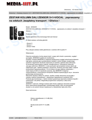 o i d d i V Utworzono : 02 marzec 2017 Kolumny > Zestawy kolumn 5.0 > ZESTAW KOLUMN DALI ZENSOR 5+1+VOCAL ,zapraszamy na odsłuch ,bezpłatny tr ZESTAW KOLUMN DALI ZENSOR 5+1+VOCAL ,zapraszamy na odsłuch ,bezpłatny transport / Gliwice / p le Model : ZENSOR u A ZESTAW KOLUMN DALI ZENSOR 5+1+VOCAL ,zapraszamy na odsłuch ,bezpłatny transport / Gliwice / k S Producent : DALI Zestaw głośników kina domowego Dali serii Zensor l p W skład zestawu wchodzą głośniki: - Zensor 5 - Zensor 1 - Zensor Vokal Przy zakupie zestawu kable głośnikowe o wartości 200 zł gratis !!! Właściwości: Obecnie oczekujemy trochę więcej troski i uwagi, jeśli chodzi o parametry, wygląd i szczegóły. ZENSOR 5 spełnia te oczekiwania. Przednia ścianka ZENSOR'a 5 zapewnia ekskluzywny wygląd wykończenia lakierem high-gloss, podczas gdy wysokiej jakości dodatki z winylu dodają przyjemnego wrażenia i łagodności obudowie wykonanej ze średniej gęstości płyty pilśniowej. W konstrukcji wykorzystano materiał dźwiękochłonny i wewnętrzne wsporniki. Jak jego wielki brat, ZENSOR 5 może pochwalić się kompletem funkcji, takich jak zdejmowany grill, stabilna podstawa z aluminium, frontowy port bass reflex i wejście przewodowe najwyższej jakości. 15 cm krótszy niż jego większe rodzeństwo i nadal więcej niż 80 cm wysokości pozwolą, aby ZENSOR 5 mógł być rozpoznawalnym i nowoczesnym kompanem idealnie wpasowującym się w otoczenie gustownego pomieszczenia. Naturalnie obydwa 5 ¼-calowe woofery zostały stworzone od początku i czerpią z pełnych doświadczeń i dziedzictwa nagradzanych wooferów DALI. Podczas gdy konstrukcja o niskich stratach gwarantuje optymalne działanie kopułki i zawieszenia dla pełnej i długotrałej przyjemności czerpanej z całej sceny muzycznej. ZENSOR 5 jest tym, którego szukasz jeśli chcesz upiększyć otoczenie swojego domu obecnością wiarygodnego i prawdziwego artysty, który nie pozostawia złudzeń co do swoich korzeni osadzonych w dziedzictwie high-endu DALI. Dane techniczne: Zakres częstotliwości (+/-3 dB) [Hz] 43 - 26.500 Skuteczność [2,83 V/1 m) [dB] 88 kontakt : - [email protected] Strona 1/{nb} o i d d i V Utworzono : 02 marzec 2017 Kolumny > Zestawy kolumn 5.0 > ZESTAW KOLUMN DALI ZENSOR 5+1+VOCAL ,zapraszamy na odsłuch ,bezpłatny tr ZESTAW KOLUMN DALI ZENSOR 5+1+VOCAL ,zapraszamy na odsłuch ,bezpłatny transport / Gliwice / p le u A Impedancja nominalna [Ω] 6 l p k S Maks. SPL [dB] 108 Sugerowana moc wzmacniacza [W] 30 - 150 Częstotliwość podziału [Hz] 2.400 Hz Przetwornik wysokotonowy 1 x 25 mm Soft Textile Dome Przetwornik niskotonowy 2 x 5,25" Wood Fibre Cone Typ obudowy Bass Reflex Strojenie bass-reflexu [Hz] 44 Wejścia Single Wire Ekranowanie magnetyczne No Rekomendowane umiejscowienie Floor Sugerowana odległość od ściany [cm] 20 - 80 Maks. wymiary z podstawą i maskownicą (wys. x szer. x gł.) [mm] 840 x 162 x 253 Masa [kg] kontakt : - [email protected] Strona 2/{nb} o i d d i V Utworzono : 02 marzec 2017 Kolumny > Zestawy kolumn 5.0 > ZESTAW KOLUMN DALI ZENSOR 5+1+VOCAL ,zapraszamy na odsłuch ,bezpłatny tr ZESTAW KOLUMN DALI ZENSOR 5+1+VOCAL ,zapraszamy na odsłuch ,bezpłatny transport / Gliwice / p le 10. l p u A k S Wszechstronny ZENSOR 1 jest idealnym głośnikiem dla zestawu stereo do użytku w małych i średniej wielkości pomieszczeniach. Doskonale sprawdza się jako głośnik frontowy w zestawie 2.1 surround lub jako głośnik tylny w zestawach 5.1 z subwooferem jako wybitnym i dyskretnym źródłem dźwięku. Wyróżniający się znanymi rozwiązaniami DALI, jak lekkie, ale jednocześnie sztywne membrany wykonane z pulpy drzewnej, dostarczające dynamiki, dużej liczby szczegółów i niezakłóconej reprodukcji oryginalnego dźwięku, podczas gdy ultralekki materiał tweetera zapewnia bardzo szeroki zakres częstotliwości. Dyskretny wymiarami (wys. 27,4 x szer. 16,2 x gł. 22 cm), 6‐cio litrowa obudowa pokryta lakierem high‐gloss wtapia się idealnie w otoczenie nowoczesnych pomieszczeń. DALI zastosowało swoje pomysły dotyczące dźwiękoszczelnej konstrukcji leżące u podstaw konstrukcji głośnika. Od ogólnych i podstawowych właściwości do każdego detalu, jak zintegrowany uchwyt ścienny, zaokrąglone rogi i umieszczony z tyłu port bass reflex, wszystko z uwielbienia do muzyki. ZENSOR 1 osiągnął sukces w przetwarzaniu mocy wzmacniacza w czystą energię akustyczną bez strat, czy ograniczeń, a to oznacza więcej przyjemności dla wrażliwych uszu, oferując skoncentrowany, spójny dźwięk i stylową wizualna identyfikację. Dane techniczne: Zakres częstotliwości (+/-3 dB) [Hz] 53 - 26.500 Skuteczność [2,83 V/1 m) [dB] 86.5 Impedancja nominalna [Ω] 6 Maks. SPL [dB] 106 Sugerowana moc wzmacniacza [W] 25 - 100 Częstotliwość podziału [Hz] 2.900 Hz kontakt : - [email protected] Strona 3/{nb} o i d d i V Utworzono : 02 marzec 2017 Kolumny > Zestawy kolumn 5.0 > ZESTAW KOLUMN DALI ZENSOR 5+1+VOCAL ,zapraszamy na odsłuch ,bezpłatny tr ZESTAW KOLUMN DALI ZENSOR 5+1+VOCAL ,zapraszamy na odsłuch ,bezpłatny transport / Gliwice / p le u A Przetwornik wysokotonowy 1 x 25 mm Soft Textile Dome l p k S Przetwornik niskotonowy 1 x 5.25" Wood Fibre Cone Typ obudowy Bass Reflex Strojenie bass-reflexu [Hz] 51.5 Wejścia Single Wire Ekranowanie magnetyczne Semi Magnetic Shielded Rekomendowane umiejscowienie On-Wall Shelf Stand Maks. wymiary z podstawą i maskownicą (wys. x szer. x gł.) [mm] 274 x 162 x 220 Masa [kg] 4.2 Głośnik centralny obejmuje zasadniczo ważną strefę dźwięku, ponieważ jest to miejsce, gdzie większość dialogów ścieżek filmowych można znaleźć. ZENSOR VOKAL jest zaprojektowany w celu pokrycia tej strefy, oferując w pełni realistyczne wrażenia wokalu i wrażenie surround. Integracja dźwiękowa ZENSOR VOKAL, który powinien być umieszczony na półce poniżej ekranu telewizora, jest bardzo przekonująca, jako żejest doskonale dopasowany do innych mo