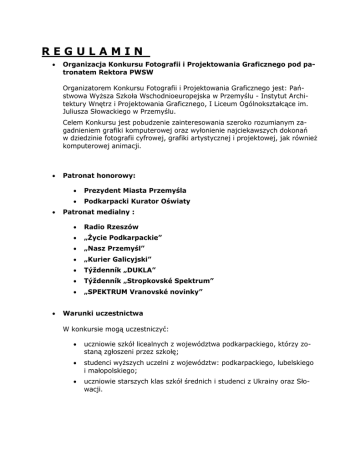 REGULAMIN Organizacja Konkursu Fotografii i Projektowania Graficznego pod patronatem Rektora PWSW Organizatorem Konkursu Fotografii i Projektowania Graficznego jest: Państwowa Wyższa Szkoła Wschodnioeuropejska w Przemyślu - Instytut Architektury Wnętrz i Projektowania Graficznego, I Liceum Ogólnokształcące im. Juliusza Słowackiego w Przemyślu. Celem Konkursu jest pobudzenie zainteresowania szeroko rozumianym zagadnieniem grafiki komputerowej oraz wyłonienie najciekawszych dokonań w dziedzinie fotografii cyfrowej, grafiki artystycznej i projektowej, jak również komputerowej animacji. Patronat honorowy: Prezydent Miasta Przemyśla Podkarpacki Kurator Oświaty Patronat medialny : Radio Rzeszów „Życie Podkarpackie” „Nasz Przemyśl” „Kurier Galicyjski” Týždenník „DUKLA” Týždenník „Stropkovské Spektrum” „SPEKTRUM Vranovské novinky” Warunki uczestnictwa W konkursie mogą uczestniczyć: uczniowie szkół licealnych z województwa podkarpackiego, którzy zostaną zgłoszeni przez szkołę; studenci wyższych uczelni z województw: podkarpackiego, lubelskiego i małopolskiego; uczniowie starszych klas szkół średnich i studenci z Ukrainy oraz Słowacji. Każdy uczestnik może nadesłać lub złożyć prace w zapisie cyfrowym wraz z wypełnioną Kartą Zgłoszenia (do pobrania ze strony - www.slowak.edu.pl oraz www.pwsw.pl), tylko z jednej dowolnie wybranej dziedziny: fotografii cyfrowej – (zestaw 3 do 5 prac); projektowania i grafiki komputerowej – rozumianych jako grafika artystyczna (kompozycje graficzne) lub projektowa (formy użytkowe - plakat, okładka płytowa i książkowa) – 3 do 5 prac prac; animacji komputerowej – do 2 prac (do 5 min każda). Uczestnicy wykonują samodzielnie prace (zadania) w domu lub szkole, propagując m.in. ciekawe zabytki i przedsięwzięcia ze swojego otoczenia. Autorzy mogą korzystać z wszelkiej pomocy opiekunów, nie prowadzącej jednak bezpośrednio do rozwiązania zadania. W wyznaczonym terminie uczestnik przesyła sam lub za pośrednictwem szkoły lub uczelni nośnik cyfrowy (krążek CD) z pracami z dopiskiem na kopercie "Konkurs" na adres: Państwowa Wyższa Szkoła Wschodnioeuropejska w Przemyślu ul. Książąt Lubomirskich 6 Przemyśl 37-700 tel. 16 7355 100 faks 16 7355 101 Termin składania prac (decyduje data stempla pocztowego) 3 maj 2016 r. 1. Oceny nadesłanych prac dokona jury powołane przez Organizatora Konkursu. 2. Jury ustali listę rankingową twórców prac i nagrodzi finalistów dyplomami oraz nagrodami rzeczowymi w następujących kategoriach: fotografii cyfrowej projektowania i grafiki komputerowej animacji komputerowej 3. Wyróżnione prace finalistów będą prezentowane na stronach internetowych.: Państwowej Wyższej Szkoły Wschodnioeuropejskiej w Przemyślu oraz I Liceum Ogólnokształcącego im. Juliusza Słowackiego w Przemyślu. 4. Wyniki Konkursu będą podane na łamach tygodnika „Życie Podkarpackie”, miesięcznika „Nasz Przemyśl”, „Kurier Galicyjski”, oraz w Internecie na stronach organizatora: Państwowej Wyższej Szkoły Wschodnioeuropejskiej i I Liceum Ogólnokształcącego im. Juliusza Słowackiego w Przemyślu. 5. Ogłoszenie wyników Konkursu i prezentacja nagrodzonych prac - 13 maja 2016 r. w Państwowej Wyższej Szkole Wschodnioeuropejskiej w Przemyślu Postanowienia dodatkowe 1. Każda praca powinna być opatrzona opisem: imię i nazwisko autora, adres pocztowy i elektroniczny, tytuł pracy, rok powstania, technika / użyte programy oraz (w przypadku uczniów i studentów) nazwa szkoły / uczelni. 2. Nie pobiera się opłat wpisowych. 3. Organizator nie zwraca prac uczestnikom konkursu. 4. Nadesłanie prac jest równoznaczne z oświadczeniem posiadania praw autorskich do danej pracy, wyrażeniem zgody przez autora na publikację pracy (prac) oraz imienia i nazwiska, a także przetwarzanie jego danych do celów związanych z konkursem (z możliwością wglądu i edycji danych). Prace bez karty zgłoszenia lub z kartą nie posiadającą wszystkich danych będą odrzucane. 5. Wypełnienie i podpisanie karty zgłoszenia jest wyrazem akceptacji regulaminu i warunków udziału w konkursie. 6. W przypadku dostarczenia pracy na nośniku zewnętrznym prace zgłoszone na konkurs powinny być odpowiednio zabezpieczone przez autora. 7. Organizator nie ponosi odpowiedzialności za uszkodzenia prac w czasie transportu. Prace niezgodne z regulaminem lub zniszczone nie będą brane pod uwagę. 8. Koszty dostarczania prac ponoszą uczestnicy konkursu. 9. Organizatorzy zastrzegają sobie prawo do publikacji nadesłanych prac w mediach oraz dokumentowania ich dla potrzeb wydawnictw bez wypłacania honora- riów autorom. 10.Prace finalistów wybierze Jury. Organizatorzy poinformują uczestników o zakwalifikowaniu ich prac. 11.Decyzje oraz werdykt Jury są ostateczne. 12.W sprawach nieuregulowanych niniejszym regulaminem, decyzje podejmuje Jury. 13.Organizatorzy zapewniają publikację zakwalifikowanych prac w Internecie. 14.Planowana jest prezentacja wybranych prac w formie publicznych pokazów. Kurator Konkursu: dr inż. Piotr Kisiel [email protected] Warunki techniczne: obraz statyczny: - każdy z twórców może nadesłać trzy prace wykonane w szeroko pojętej technologii cyfrowej, umożliwiające ich ekspozycję w wersji elektronicznej (dłuższy bok min. 1000 pikseli, rozdzielczość 300 dpi, format JPEG lub PDF, maksymalny rozmiar pliku 2 MB) obraz ruchomy: - dopuszczalne formaty: *.avi(wyłącznie popularne ogólnodostępne kodeki), *.mov, *.wmv zapisane na płycie CD lub DVD – (w przypadku zbyt „dużego” pliku organizatorzy rezerwują sobie prawo do jego skompresowania i dostosowania do potrzeb prezentacji w Internecie);