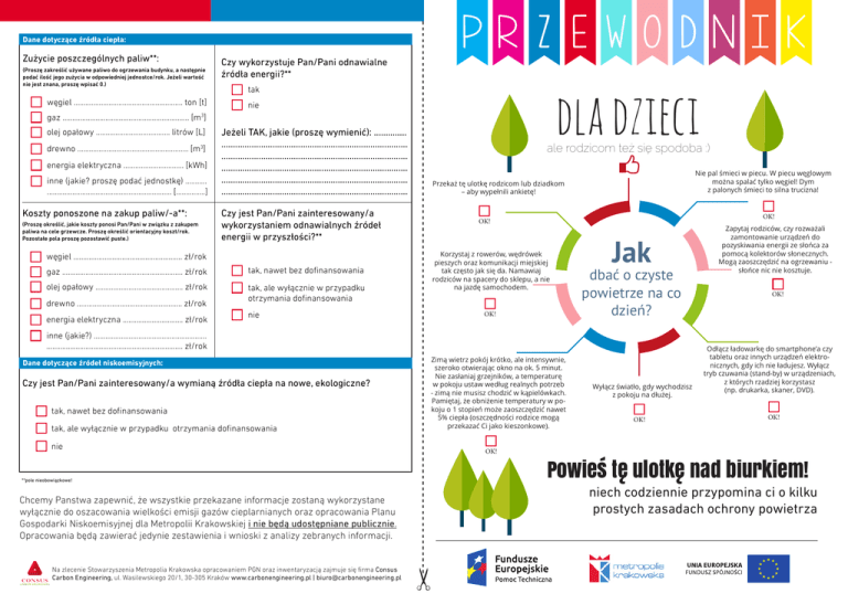 Dane dotyczące źródła ciepła: Zużycie poszczególnych paliw**: (Proszę zakreślić używane paliwo do ogrzewania budynku, a następnie podać ilość jego zużycia w odpowiedniej jednostce/rok. Jeżeli wartość nie jest znana, proszę wpisać 0.) węgiel ........................................................ ton [t] Czy wykorzystuje Pan/Pani odnawialne źródła energii?** przewodnik dla dzieci tak nie gaz ................................................................. [m3] olej opałowy ...................................... litrów [L] drewno ......................................................... [m ] 3 energia elektryczna ............................... [kWh] inne (jakie? proszę podać jednostkę) ........... ................................................................ [...............] Koszty ponoszone na zakup paliw/-a**: (Proszę określić, jakie koszty ponosi Pan/Pani w związku z zakupem paliwa na cele grzewcze. Proszę określić orientacyjny koszt/rok. Pozostałe pola proszę pozostawić puste.) Jeżeli TAK, jakie (proszę wymienić): .............. ................................................................................ ................................................................................ ................................................................................ ................................................................................ ................................................................................ Czy jest Pan/Pani zainteresowany/a wykorzystaniem odnawialnych źródeł energii w przyszłości?** węgiel ........................................................ zł/rok gaz .............................................................. zł/rok tak, nawet bez dofinansowania olej opałowy ............................................. zł/rok tak, ale wyłącznie w przypadku otrzymania dofinansowania drewno ...................................................... zł/rok energia elektryczna ............................... zł/rok nie ale rodzicom też się spodoba :) Nie pal śmieci w piecu. W piecu węglowym można spalać tylko węgiel! Dym z palonych śmieci to silna trucizna! Przekaż tę ulotkę rodzicom lub dziadkom – aby wypełnili ankietę! OK! OK! Korzystaj z rowerów, wędrówek pieszych oraz komunikacji miejskiej tak często jak się da. Namawiaj rodziców na spacery do sklepu, a nie na jazdę samochodem. OK! Jak Jak dbać o czyste powietrze na co dzień? inne (jakie?) .......................................................... ...................................................................... zł/rok Dane dotyczące źródeł niskoemisyjnych: Czy jest Pan/Pani zainteresowany/a wymianą źródła ciepła na nowe, ekologiczne? tak, nawet bez dofinansowania tak, ale wyłącznie w przypadku otrzymania dofinansowania nie **pole nieobowiązkowe! Chcemy Panstwa zapewnić, że wszystkie przekazane informacje zostaną wykorzystane wyłącznie do oszacowania wielkości emisji gazów cieplarnianych oraz opracowania Planu Gospodarki Niskoemisyjnej dla Metropolii Krakowskiej i nie będą udostępniane publicznie. Opracowania będą zawierać jedynie zestawienia i wnioski z analizy zebranych informacji. Na zlecenie Stowarzyszenia Metropolia Krakowska opracowaniem PGN oraz inwentaryzacją zajmuje się firma Consus Carbon Engineering, ul. Wasilewskiego 20/1, 30-305 Kraków www.carbonengineering.pl | [email protected] Zimą wietrz pokój krótko, ale intensywnie, szeroko otwierając okno na ok. 5 minut. Nie zasłaniaj grzejników, a temperaturę w pokoju ustaw według realnych potrzeb - zimą nie musisz chodzić w kąpielówkach. Pamiętaj, że obniżenie temperatury w pokoju o 1 stopień może zaoszczędzić nawet 5% ciepła (oszczędności rodzice mogą przekazać Ci jako kieszonkowe). OK! Wyłącz światło, gdy wychodzisz z pokoju na dłużej. OK! Zapytaj rodziców, czy rozważali zamontowanie urządzeń do pozyskiwania energii ze słońca za pomocą kolektorów słonecznych. Mogą zaoszczędzić na ogrzewaniu słońce nic nie kosztuje. OK! Odłącz ładowarkę do smartphone’a czy tabletu oraz innych urządzeń elektronicznych, gdy ich nie ładujesz. Wyłącz tryb czuwania (stand-by) w urządzeniach, z których rzadziej korzystasz (np. drukarka, skaner, DVD). OK! Powieś tę ulotkę nad biurkiem! niech codziennie przypomina ci o kilku prostych zasadach ochrony powietrza Powietrze, choć niewidoczne, jest mieszaniną różnych składników – na pewno uczyłeś się już o tym na lekcji przyrody. Część z nich jest niezbędna do życia dla każdego z nas, część zupełnie obojętna, a część szkodliwa dla naszego zdrowia. To, jak dużo będzie w otaczającym nas powietrzu niebezpiecznych substancji zależy przede wszystkim od nas samych. Dlatego musimy żyć tak by nie zagrażać środowisku naturalnemu, czyli zgodnie z zasadami zrównoważonego rozwoju. 5 1. Palenie śmieci w domowych piecach 2. Korzystanie ze starych i niesprawnych kotłów 3. Stosowanie niskiej jakości węgla do ogrzewania 4. Samochody z niesprawnymi silnikami 5. Wysokie zużycie energii elektrycznej największych ZAGROŻEŃ dla czystego powietrza Inwentaryzacja czynnych pieców, kotłowni oraz kominków na paliwo stałe w ramach wykonania Planu Gospodarki Niskoemisyjnej dla Metropolii Krakowskiej Szanowni Państwo, Urząd Gminy i Stowarzyszenie Metropolia Krakowska zaprasza właścicieli i zarządców budynków do wypełnienia ankiety w ramach przeprowadzanej inwentaryzacji czynnych pieców, kotłowni oraz kominków na paliwo stałe. Dane te pozwolą nam określić poziom zanieczyszczenia powietrza w gminie. Inwentaryzację będą przeprowadzać ankieterzy, którzy zapukają do wszystkich domów z prośbą o odpowiedź na kilka pytań dotyczących pieców grzewczych (pytania te będą pokrywały się z tymi przedstawionymi w ankiecie). Wypełnioną ankietę będzie można: - oddać ankieterowi - wrzucić do oznakowanego pudełka w u