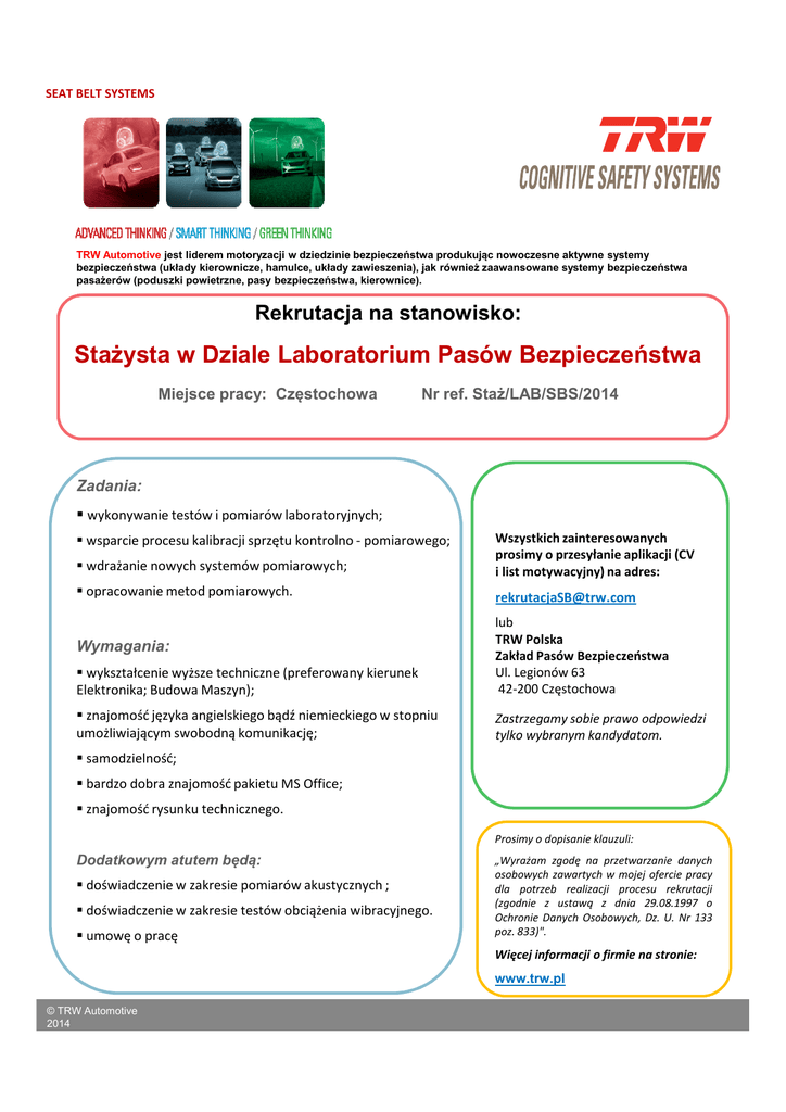SEAT BELT SYSTEMS TRW Automotive jest liderem motoryzacji w dziedzinie bezpieczeństwa produkując nowoczesne aktywne systemy bezpieczeństwa (układy kierownicze, hamulce, układy zawieszenia), jak również zaawansowane systemy bezpieczeństwa pasażerów (poduszki powietrzne, pasy bezpieczeństwa, kierownice). Rekrutacja na stanowisko: Stażysta w Dziale Laboratorium Pasów Bezpieczeństwa Miejsce pracy: Częstochowa Nr ref. Staż/LAB/SBS/2014 Zadania: wykonywanie testów i pomiarów laboratoryjnych; wdrażanie nowych systemów pomiarowych; Wszystkich zainteresowanych prosimy o przesyłanie aplikacji (CV i list motywacyjny) na adres: opracowanie metod pomiarowych. [email protected] wsparcie procesu kalibracji sprzętu kontrolno - pomiarowego; wykształcenie wyższe techniczne (preferowany kierunek Elektronika; Budowa Maszyn); lub TRW Polska Zakład Pasów Bezpieczeństwa Ul. Legionów 63 42-200 Częstochowa znajomość języka angielskiego bądź niemieckiego w stopniu umożliwiającym swobodną komunikację; Zastrzegamy sobie prawo odpowiedzi tylko wybranym kandydatom. Wymagania: samodzielność; bardzo dobra znajomość pakietu MS Office; znajomość rysunku technicznego. Prosimy o dopisanie klauzuli: Dodatkowym atutem będą: doświadczenie w zakresie pomiarów akustycznych ; doświadczenie w zakresie testów obciążenia wibracyjnego. umowę o pracę „Wyrażam zgodę na przetwarzanie danych osobowych zawartych w mojej ofercie pracy dla potrzeb realizacji procesu rekrutacji (zgodnie z ustawą z dnia 29.08.1997 o Ochronie Danych Osobowych, Dz. U. Nr 133 poz. 833)". Więcej informacji o firmie na stronie: www.trw.pl © TRW Automotive 2014