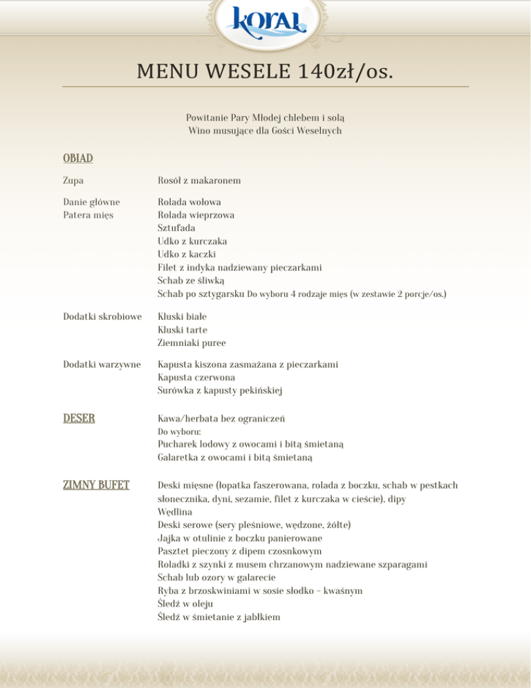 MENU WESELE 140zł/os. Powitanie Pary Młodej chlebem i solą Wino musujące dla Gości Weselnych OBIAD Zupa Rosół z makaronem Danie główne Patera mięs Rolada wołowa Rolada wieprzowa Sztufada Udko z kurczaka Udko z kaczki Filet z indyka nadziewany pieczarkami Schab ze śliwką Schab po sztygarsku Do wyboru 4 rodzaje mięs (w zestawie 2 porcje/os.) Dodatki skrobiowe Kluski białe Kluski tarte Ziemniaki puree Dodatki warzywne Kapusta kiszona zasmażana z pieczarkami Kapusta czerwona Surówka z kapusty pekińskiej DESER Kawa/herbata bez ograniczeń Do wyboru: Pucharek lodowy z owocami i bitą śmietaną Galaretka z owocami i bitą śmietaną ZIMNY BUFET Deski mięsne (łopatka faszerowana, rolada z boczku, schab w pestkach słonecznika, dyni, sezamie, filet z kurczaka w cieście), dipy Wędlina Deski serowe (sery pleśniowe, wędzone, żółte) Jajka w otulinie z boczku panierowane Pasztet pieczony z dipem czosnkowym Roladki z szynki z musem chrzanowym nadziewane szparagami Schab lub ozory w galarecie Ryba z brzoskwiniami w sosie słodko - kwaśnym Śledź w oleju Śledź w śmietanie z jabłkiem Pulpety rybne w occie Koreczki śledziowe Befsztyk tatarski Do wyboru 3 sałatki: Sałatka tortelini Sałatka grecka Sałatka ryżowa z pieczarkami Sałatka z kurczaka gotowanego Sałatka egzotyczna Sałatka brokułowa z jajkiem Sałatka z krewetkami Pieczywo, masło I KOLACJA Do wyboru 3 rodzaje (w zestawie 1 porcja/os.) Patera mięs i ryb Kotlet schabowy De volay Szaszłyk drobiowy Szwajcar Filet z kurczaka z ananasem Karczek w czosnku Golonko peklowane pieczone Kotlet z pieczarkami zapiekany z serem Ryba ze szpinakiem Łosoś na grzance Dodatki skrobiowe Frytki Ziemniaki opiekane Ziemniaki puree Dodatki warzywne Zestaw surówek Bukiet warzyw gotowanych z sosem cytrynowo - serowym II KOLACJA Do wyboru Boeuf strogonow Flaczki wołowe Bogracz