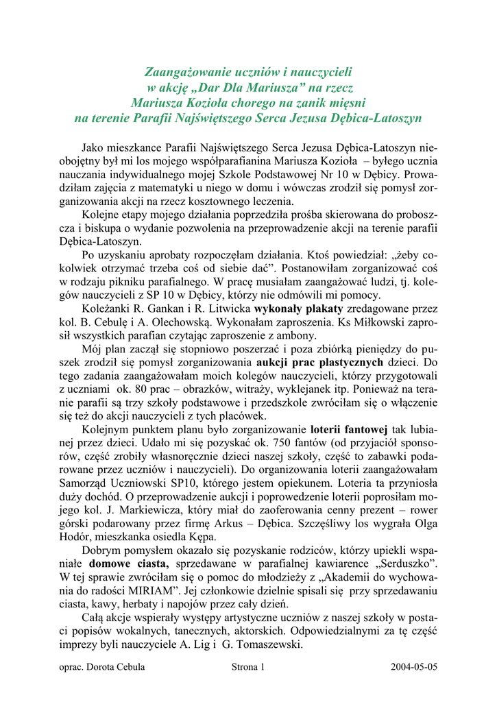 Zaangażowanie uczniów i nauczycieli w akcję „Dar Dla Mariusza” na rzecz Mariusza Kozioła chorego na zanik mięsni na terenie Parafii Najświętszego Serca Jezusa Dębica-Latoszyn Jako mieszkance Parafii Najświętszego Serca Jezusa Dębica-Latoszyn nieobojętny był mi los mojego współparafianina Mariusza Kozioła – byłego ucznia nauczania indywidualnego mojej Szkole Podstawowej Nr 10 w Dębicy. Prowadziłam zajęcia z matematyki u niego w domu i wówczas zrodził się pomysł zorganizowania akcji na rzecz kosztownego leczenia. Kolejne etapy mojego działania poprzedziła prośba skierowana do proboszcza i biskupa o wydanie pozwolenia na przeprowadzenie akcji na terenie parafii Dębica-Latoszyn. Po uzyskaniu aprobaty rozpoczęłam działania. Ktoś powiedział: „żeby cokolwiek otrzymać trzeba coś od siebie dać”. Postanowiłam zorganizować coś w rodzaju pikniku parafialnego. W pracę musiałam zaangażować ludzi, tj. kolegów nauczycieli z SP 10 w Dębicy, którzy nie odmówili mi pomocy. Koleżanki R. Gankan i R. Litwicka wykonały plakaty zredagowane przez kol. B. Cebulę i A. Olechowską. Wykonałam zaproszenia. Ks Miłkowski zaprosił wszystkich parafian czytając zaproszenie z ambony. Mój plan zaczął się stopniowo poszerzać i poza zbiórką pieniędzy do puszek zrodził się pomysł zorganizowania aukcji prac plastycznych dzieci. Do tego zadania zaangażowałam moich kolegów nauczycieli, którzy przygotowali z uczniami ok. 80 prac – obrazków, witraży, wyklejanek itp. Ponieważ na teranie parafii są trzy szkoły podstawowe i przedszkole zwróciłam się o włączenie się też do akcji nauczycieli z tych placówek. Kolejnym punktem planu było zorganizowanie loterii fantowej tak lubianej przez dzieci. Udało mi się pozyskać ok. 750 fantów (od przyjaciół sponsorów, część zrobiły własnoręcznie dzieci naszej szkoły, część to zabawki podarowane przez uczniów i nauczycieli). Do organizowania loterii zaangażowałam Samorząd Uczniowski SP10, którego jestem opiekunem. Loteria ta przyniosła duży dochód. O przeprowadzenie aukcji i poprowedzenie loterii poprosiłam mojego kol. J. Markiewicza, który miał do zaoferowania cenny prezent – rower górski podarowany przez firmę Arkus – Dębica. Szczęśliwy los wygrała Olga Hodór, mieszkanka osiedla Kępa. Dobrym pomysłem okazało się pozyskanie rodziców, którzy upiekli wspaniałe domowe ciasta, sprzedawane w parafialnej kawiarence „Serduszko”. W tej sprawie zwróciłam się o pomoc do młodzieży z „Akademii do wychowania do radości MIRIAM”. Jej członkowie dzielnie spisali się przy sprzedawaniu ciasta, kawy, herbaty i napojów przez cały dzień. Całą akcje wspierały występy artystyczne uczniów z naszej szkoły w postaci popisów wokalnych, tanecznych, aktorskich. Odpowiedzialnymi za tę część imprezy byli nauczyciele A. Lig i G. Tomaszewski. oprac. Dorota Cebula Strona 1 2004-05-05 „DAR DLA MARIUSZA 2004” I oczywiście do kwestowania trzeba było zaangażować uczniów (30 osób) i nauczycieli (10 osób), którzy przed i po każdej Mszy Św. pełnili służbę przy trzech wyjściach z placu parafialnego. Wspomagały naszą działalność także dzieci młodsze, które przebrane w stroje postaci bajkowych, zapraszały do domu parafialnego na przygotowane tam atrakcje. Dla wszystkich uczniów i nauczycieli i innych wolontariuszy przygotowałam identyfikatory. W trakcie akcji udzieliłam wywiadu na żywo, który „poszedł w eter” za pośrednictwem Radia Plus. Po udanej akcji z 15 czerwca 2003r. ukazały się artykuły w prasie lokalnej „Obserwator lokalny” oraz w gazecie parafialnej „Serce”. Na koniec trzeba było policzyć zyski (8 074,50zł)i wszystkim serdecznie podziękować. Wykonałam osobiście podziękowania dla sponsorów i przyjaciół akcji. Niestety zapomnieliśmy o zaproszeniu szerszych mediów i o wykonaniu pamiątkowych zdjęć, które uwieczniłyby przynajmniej przepiękne prace plastyczne dzieci. ANALIZA I. Korzyści odniesione przez Mariusza – głównego bohatera akcji jego rodziców: - Mariusz odczuł głęboko, że nie jest pozostawiony samemu sobie w swoim kalectwie, co dało mu poczucie więzi ze swoimi najbliższymi, znajomymi z parafii, byłymi kolegami ze szkoły podstawowej; - Chłopiec z pewnością nabrał większej ochoty do walki z chorobą, a jak wiadomo kondycja psychiczna chorego jest ogromnie pomocna przy stosowaniu innych zabiegów medycznych – w tym wypadku terapii mioblastycznej; - Realną i wymierną korzyścią okazała się też oczywiście znaczna kwota pieniężna, która z pewnością przyspieszy możliwości przeprowadzenia kolejnych terapii dla Mariusza; II. Korzyści odniesione przez młodzież i dzieci zaangażowane w organizację akcji: Dzieci i młodzież odkrywają w ten sposób swoje nowe możliwości działania, które mogą wykorzystać w przyszłości; Uwrażliwiają się na krzywdę i nieszczęście, które widzą wokół siebie i otrzymują wzorzec postępowania w trudnych sytuacjach; Dzieci integrują się ze sobą, gdyż łączy ich wspólne działanie na rzecz chorego chłopca; III. - Korzyści odniesione przez nauczycieli: Nauczyciele mają możliwość wykazania swej inicjatywy twórczej i wychowawczej w momencie organizowania akcji; Po dokładnej analizie wyciągają wnioski na przyszłość przy organizowaniu podobnych akcji; oprac. Dorota Cebula Strona 2 2004-05-05 „DAR DLA MARIUSZA 2004” IV. - 1. Wskazują młodzieży możliwość skutecznego działania na rzecz osób pokrzywdzonych przez los; Kształtują swoją wrażliwość na sytuacje trudne i wymagająca pomocy ich samych; Korzyści odniesione przez społeczność parafialną: Parafianie mogą odczuć swoją przynależność do wspólnoty, która troszczy się szczególnie o los osób potrzebujących pomocy; Parafianie wiedzą, że jest w parafii ktoś kto w razie potrzeby mógłby podjąć się organizacji podobnej akcji;