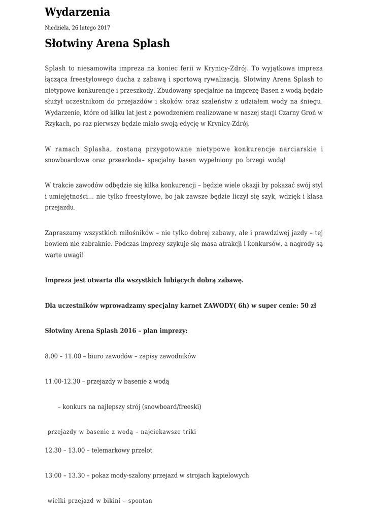 Wydarzenia Niedziela, 26 lutego 2017 Słotwiny Arena Splash Splash to niesamowita impreza na koniec ferii w Krynicy-Zdrój. To wyjątkowa impreza łącząca freestylowego ducha z zabawą i sportową rywalizacją. Słotwiny Arena Splash to nietypowe konkurencje i przeszkody. Zbudowany specjalnie na imprezę Basen z wodą będzie służył uczestnikom do przejazdów i skoków oraz szaleństw z udziałem wody na śniegu. Wydarzenie, które od kilku lat jest z powodzeniem realizowane w naszej stacji Czarny Groń w Rzykach, po raz pierwszy będzie miało swoją edycję w Krynicy-Zdrój. W ramach Splasha, zostaną przygotowane nietypowe konkurencje narciarskie i snowboardowe oraz przeszkoda– specjalny basen wypełniony po brzegi wodą! W trakcie zawodów odbędzie się kilka konkurencji – będzie wiele okazji by pokazać swój styl i umiejętności… nie tylko freestylowe, bo jak zawsze będzie liczył się szyk, wdzięk i klasa przejazdu. Zapraszamy wszystkich miłośników – nie tylko dobrej zabawy, ale i prawdziwej jazdy – tej bowiem nie zabraknie. Podczas imprezy szykuje się masa atrakcji i konkursów, a nagrody są warte uwagi! Impreza jest otwarta dla wszystkich lubiących dobrą zabawę. Dla uczestników wprowadzamy specjalny karnet ZAWODY( 6h) w super cenie: 50 zł Słotwiny Arena Splash 2016 – plan imprezy: 8.00 – 11.00 – biuro zawodów – zapisy zawodników 11.00-12.30 – przejazdy w basenie z wodą – konkurs na najlepszy strój (snowboard/freeski) przejazdy w basenie z wodą – najciekawsze triki 12.30 – 13.00 – telemarkowy przelot 13.00 – 13.30 – pokaz mody-szalony przejazd w strojach kąpielowych wielki przejazd w bikini – spontan 14.00 – przejazdy dla wszystkich, skoki do wody, pływanie dowolne 17.00 – zakończenie imprezy, rozdanie nagród i wyłonienie *Króla i Królowej Splash 2017 17.00 – afterparty DJ UWAGA do ogólnej klasyfikacji i wyboru *Króla i Królowej Splash’a 2017 liczy się udział w maksymalnej ilości konkurencji i zebranie jak największej ilości punktów … czyli bawimy się we wszystkich – super nagrody czekają na najlepszych!!! Partnerem wydarzenia jest LORIN – stroje kąpielowe.