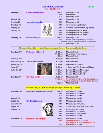 UKENS KALENDER uke 13 ________________________________ 22. – 29.03.2015 ________________________________ Søndag 22. 5. søndag i fasten B 09.30 11.00 16.30 Messe på polsk Høymesse Messe på polsk 18.00 Messe på polsk 18.00 Messe på polsk Torsdag 26. 18.00 Aftenmesse og tilbedelse Fredag 27. 18.00 Felles korsveiandakt og messe Lørdag 28. 13.00 16.00 19.00 Søndagsmesse på norsk Søndagsmesse på spansk Søndagsmesse på polsk Tirsdag 24. Onsdag 25. Herrens bebudelse Søndag 29. Palmesøndag B 09.30 Messe på polsk 11.00 Felles palmevigsel og prosesjon Deretter Jesu lidelseshistorie & Eukaristien 16.30 Messe på polsk St. Laurentius kirke • http://drammen.katolsk.no • [email protected] Sunday 22nd 5th Sunday of Lent B 9:30 am 11:00 am 4:30 pm Mass in Polish Holy Mass in Norwegian Mass in Polish Tuesday 24th 6:00 pm Mass in Polish Wednesday 25th Lord Annunciation 6:00 pm Mass in Polish Thursday 26 6:00 pm Mass and adoration Friday27th 6:00 pm Common Via Crucis and Mass 1:00 pm 4:00 pm 7:00 pm Sunday Mass in Norwegian Sunday Mass in Spanish Sunday Mass in Polish th th Saturday 28 Sunday 29th Palm Sunday B 9:30 am Mass in polish 11:00 am Common palm blessing & procession Then the Eucharist in the Catholic Church 4:30 pm Mass in polish Telefon: 32 83 20 19 • Norsk: 90 52 56 31 • Polsk: 45 11 24 80 Niedziela 22 5 niedziela Wielkiego Postu B 09.30 11.00 16.30 Msza sw po polsku Msza sw po norwesku Msza sw po polsku 18.00 Msza sw po polsku 18.00 Msza sw po polsku Czwartek 26 18.00 Msza sw po norwesku Piątek 27 18.00 Wspólny Via Crucis i msza sw Sobota 28 10.00 13.00 16.00 19.00 Katecheza dla dzieci Msza sw po norwesku Msza sw po hiszpansku Msza sw po polsku 09.30 11.00 Msza sw po polsku Święcenie palm i procesji Eucharystia w Kościele katolickim Msza sw po polsku Wtorek 24 Środa 25 Niedziela 29 Pan Zwiastowanie Niedziela Palmowa B 16.30