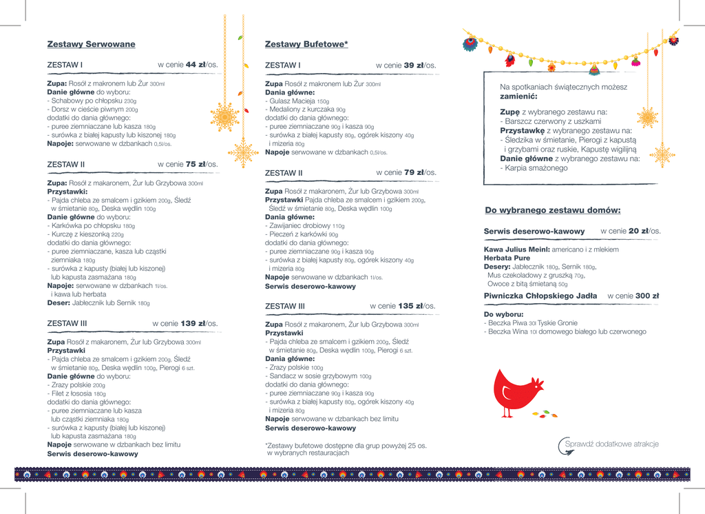 Zestawy Bufetowe* Zestawy Serwowane ZESTAW I w cenie 44 zł/os. Zupa: Rosół z makronem lub Żur 300ml Danie główne do wyboru: - Schabowy po chłopsku 230g - Dorsz w cieście piwnym 200g dodatki do dania głównego: - puree ziemniaczane lub kasza 180g - surówka z białej kapusty lub kiszonej 180g Napoje: serwowane w dzbankach 0,5l/os. ZESTAW II w cenie 75 zł/os. Zupa: Rosół z makaronem, Żur lub Grzybowa 300ml Przystawki: - Pajda chleba ze smalcem i gzikiem 200g, Śledź w śmietanie 80g, Deska wędlin 100g Danie główne do wyboru: - Karkówka po chłopsku 180g - Kurczę z kieszonką 220g dodatki do dania głównego: - puree ziemniaczane, kasza lub cząstki ziemniaka 180g - surówka z kapusty (białej lub kiszonej) lub kapusta zasmażana 180g Napoje: serwowane w dzbankach 1l/os. i kawa lub herbata Deser: Jabłecznik lub Sernik 180g ZESTAW III w cenie 139 zł/os. Zupa Rosół z makaronem, Żur lub Grzybowa 300ml Przystawki - Pajda chleba ze smalcem i gzikiem 200g, Śledź w śmietanie 80g, Deska wędlin 100g, Pierogi 6 szt. Danie główne do wyboru: - Zrazy polskie 200g - Filet z łososia 180g dodatki do dania głównego: - puree ziemniaczane lub kasza lub cząstki ziemniaka 180g - surówka z kapusty (białej lub kiszonej) lub kapusta zasmażana 180g Napoje serwowane w dzbankach bez limitu Serwis deserowo-kawowy ZESTAW I w cenie 39 zł/os. Zupa Rosół z makronem lub Żur 300ml Dania główne: - Gulasz Macieja 150g - Medaliony z kurczaka 90g dodatki do dania głównego: - puree ziemniaczane 90g i kasza 90g - surówka z białej kapusty 80g, ogórek kiszony 40g i mizeria 80g Napoje serwowane w dzbankach 0,5l/os. ZESTAW II w cenie 79 zł/os. Zupa Rosół z makaronem, Żur lub Grzybowa 300ml Przystawki Pajda chleba ze smalcem i gzikiem 200g, Śledź w śmietanie 80g, Deska wędlin 100g Dania główne: - Zawijaniec drobiowy 110g - Pieczeń z karkówki 90g dodatki do dania głównego: - puree ziemniaczane 90g i kasza 90g - surówka z białej kapusty 80g, ogórek kiszony 40g i mizeria 80g Napoje serwowane w dzbankach 1l/os. Serwis deserowo-kawowy Na spotkaniach świątecznych możesz zamienić: Zupę z wybranego zestawu na: - Barszcz czerwony z uszkami Przystawkę z wybranego zestawu na: - Śledzika w śmietanie, Pierogi z kapustą i grzybami oraz ruskie, Kapustę wigilijną Danie główne z wybranego zestawu na: - Karpia smażonego Do wybranego zestawu domów: Serwis deserowo-kawowy Kawa Julius Meinl: americano i z mlekiem Herbata Pure Desery: Jabłecznik 180g, Sernik 180g, Mus czekoladowy z gruszką 70g, Owoce z bitą śmietaną 50g Piwniczka Chłopskiego Jadła ZESTAW III w cenie 135 zł/os. Zupa Rosół z makaronem, Żur lub Grzybowa 300ml Przystawki - Pajda chleba ze smalcem i gzikiem 200g, Śledź w śmietanie 80g, Deska wędlin 100g, Pierogi 6 szt. Dania główne: - Zrazy polskie 100g - Sandacz w sosie grzybowym 100g dodatki do dania głównego: - puree ziemniaczane 90g i kasza 90g - surówka z białej kapusty 80g, ogórek kiszony 40g i mizeria 80g Napoje serwowane w dzbankach bez limitu Serwis deserowo-kawowy *Zestawy bufetowe dostępne dla grup powyżej 25 os. w wybranych restauracjach w cenie 20 zł/os. w cenie 300 zł Do wyboru: - Beczka Piwa 30l Tyskie Gronie - Beczka Wina 10l domowego białego lub czerwonego Sprawdź dodatkowe atrakcje