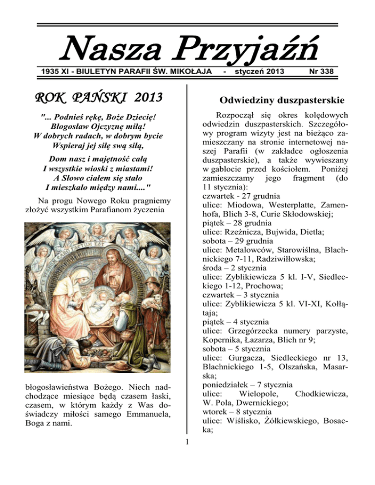 Nasza Przyjaźń 1935 XI - BIULETYN PARAFII ŚW. MIKOŁAJA ROK PAŃSKI 2013 - styczeń 2013 Nr 338 Odwiedziny duszpasterskie Rozpoczął się okres kolędowych odwiedzin duszpasterskich. Szczegółowy program wizyty jest na bieżąco zamieszczany na stronie internetowej naszej Parafii (w zakładce ogłoszenia duszpasterskie), a także wywieszany w gablocie przed kościołem. Poniżej zamieszczamy jego fragment (do 11 stycznia): czwartek - 27 grudnia ulice: Miodowa, Westerplatte, Zamenhofa, Blich 3-8, Curie Skłodowskiej; piątek – 28 grudnia ulice: Rzeźnicza, Bujwida, Dietla; sobota – 29 grudnia ulice: Metalowców, Starowiślna, Blachnickiego 7-11, Radziwiłłowska; środa – 2 stycznia ulice: Zyblikiewicza 5 kl. I-V, Siedleckiego 1-12, Prochowa; czwartek – 3 stycznia ulice: Zyblikiewicza 5 kl. VI-XI, Kołłątaja; piątek – 4 stycznia ulice: Grzegórzecka numery parzyste, Kopernika, Łazarza, Blich nr 9; sobota – 5 stycznia ulice: Gurgacza, Siedleckiego nr 13, Blachnickiego 1-5, Olszańska, Masarska; poniedziałek – 7 stycznia ulice: Wielopole, Chodkiewicza, W. Pola, Dwernickiego; wtorek – 8 stycznia ulice: Wiślisko, Żółkiewskiego, Bosacka; "... Podnieś rękę, Boże Dziecię! Błogosław Ojczyznę miłą! W dobrych radach, w dobrym bycie Wspieraj jej siłę swą siłą, Dom nasz i majętność całą I wszystkie wioski z miastami! A Słowo ciałem się stało I mieszkało między nami...." Na progu Nowego Roku pragniemy złożyć wszystkim Parafianom życzenia błogosławieństwa Bożego. Niech nadchodzące miesiące będą czasem łaski, czasem, w którym każdy z Was doświadczy miłości samego Emmanuela, Boga z nami. 1 środa - 9 stycznia ulice: Topolowa (numery parzyste 4-48) czwartek – 10 stycznia ulice: Topolowa c.d. i numery nieparzyste, Zygmunta Augusta, Kurkowa; piątek – 11 stycznia ulice: Ariańska, Strzelecka, Botaniczna, Borowickiej, Mogilska. o Liturgii Świętej 106). Niedziela jest też podstawą całego roku liturgicznego, na który składają się dwa cykle świąteczne (Wielkanocny i Bożonarodzeniowy) oraz okres zwykły. Obchody całego roku liturgicznego mają nam pomóc zbliżyć się do Jezusa, lepiej Go poznać i przygotować się na Jego powtórne przyjście. W styczniu kalendarz liturgiczny przewiduje celebrację dwóch uroczystości (Świętej Bożej Rodzicielki Maryi – 1I oraz Objawienia Pańskiego - 6 I) i dwóch świąt (Chrztu Pańskiego – w tym roku 13 I oraz Nawrócenia Świętego Pawła 25 I). Terminologia nie jest przypadkowa, a użyte wyrazy bynajmniej nie są synonimiczne. Jaka jest więc różnica między uroczystością i świętem? Chodzi oczywiście o rangę, znaczenie jakie się im przypisuje. Uroczystości zaliczane są do tzw. dni głównych, których obchody zaczynają się wieczorem dnia poprzedniego od I Nieszporów. Święta zamykają się w granicach dnia naturalnego, bez I Nieszporów. Prosimy o przygotowanie na czas kolędy krzyża, świec i wody święconej, którą można zabierać z przedsionka naszego kościoła. Osoby, które nie mogą przyjąć wizyty duszpasterskiej we wskazanym terminie, a chciałyby gościć kapłana pod swoim dachem, prosimy o skontaktowanie się z kancelarią parafialną (tel. 12 431-22-77). Jednocześnie informujemy, że ministranci pukają tylko do drzwi domów, w których w ubiegłych latach była przyjmowana kolęda. Osoby, które nie otrzymały kartki zawiadamiającej o wizycie duszpasterskiej a chciałyby ją przyjąć, prosimy o kontakt z kancelarią parafialną. Uroczystość Objawienia Pańskiego 6 stycznia W intencji odwiedzanych parafian zostaną odprawione Msze św. w niedzielę 27 stycznia 2013 roku, na które już dziś serdecznie zapraszamy. wszystkich wiernych naszej parafii. Dzisiejsza uroczystość jest jedną Dni świąteczne w Kościele Pierwszym i najstarszym świętem w Kościele jest niedziela, tzw. mała Wielkanoc. Tego dnia „wierni powinni schodzić się razem dla słuchania Słowa Bożego i uczestniczenia w Eucharystii, aby tak wspominać Mękę, Zmartwychwstanie i chwałę Pana Jezusa i składać dziękczynienie Bogu” (Konstytucja z najstarszych w Kościele. Na Wscho2 nia na spotkaniu opłatkowym w niedzielę 6 stycznia 2013 r. o godz. 15.00. dzie znana była już w III wieku, na Zachodzie początek jej obchodów datuje się na koniec IV wieku. Pokłon trzech Króli, albo raczej Mędrców, Magów, bo tak ich nazywa św. Mateusz, Ewangelista, to hołd oddany Bogu przez cały ówczesny świat pogański, całą rodzinę ludzką. Postacie Mędrców są owiane tajemnicą. Nie wiemy ilu ich dokładnie było. Tradycja najczęściej mówi o trzech, bo złożyli trzy dary, ale malowidła w katakumbach rzymskich z II i III wieku przedstawiają ich w liczbie dwóch, czterech a nawet sześciu. Kiedy przybyli pokłonić się przed Jezusem? Tuż po Jego narodzeniu? Raczej nie. Otóż wczytując się w tekst Ewangelii zauważymy, że Mędrcy znaleźli Dziecię w domu, a nie w betlejemskiej stajence (por. Mt 2, 9-11). Zastanawia również fakt, że Herod kazał wymordować wszystkie dzieci w wieku do dwóch lat. Być może więc Jezus miał już wówczas kilka miesięcy, a nawet ponad rok. Czy Mędrcy rzeczywiście nosili imiona: Kacper, Melchior i Baltazar? Nie ma co do tego żadnej pewności. Tradycja przekazuje te imiona dopiero od VIII wieku. Co się później stało z Mędrcami? Ewangelista wspomina, że udali się do swojej ojczyzny. Według legendy wiele lat później przyjęli tam chrzest od jednego z Apostołów, zostali wyświęceni na biskupów i ponieśli śmierć męczeńską. Nasze świętowanie rozpoczniemy Mszą św., po której młodzież z Zespołu Szkół nr 1 z ulicy Blachnickiego wystawi jasełka, przygotowane przez s . dr Lucynę Rąpałę. Następnie połamiemy się opłatkiem i będziemy wychwalać Pana śpiewem kolęd. Klub Seniora We wtorek, 8 stycznia, o godz. 16.00 w sali kolumnowej na wikarówce odbędzie się opłatek dla seniorów. S