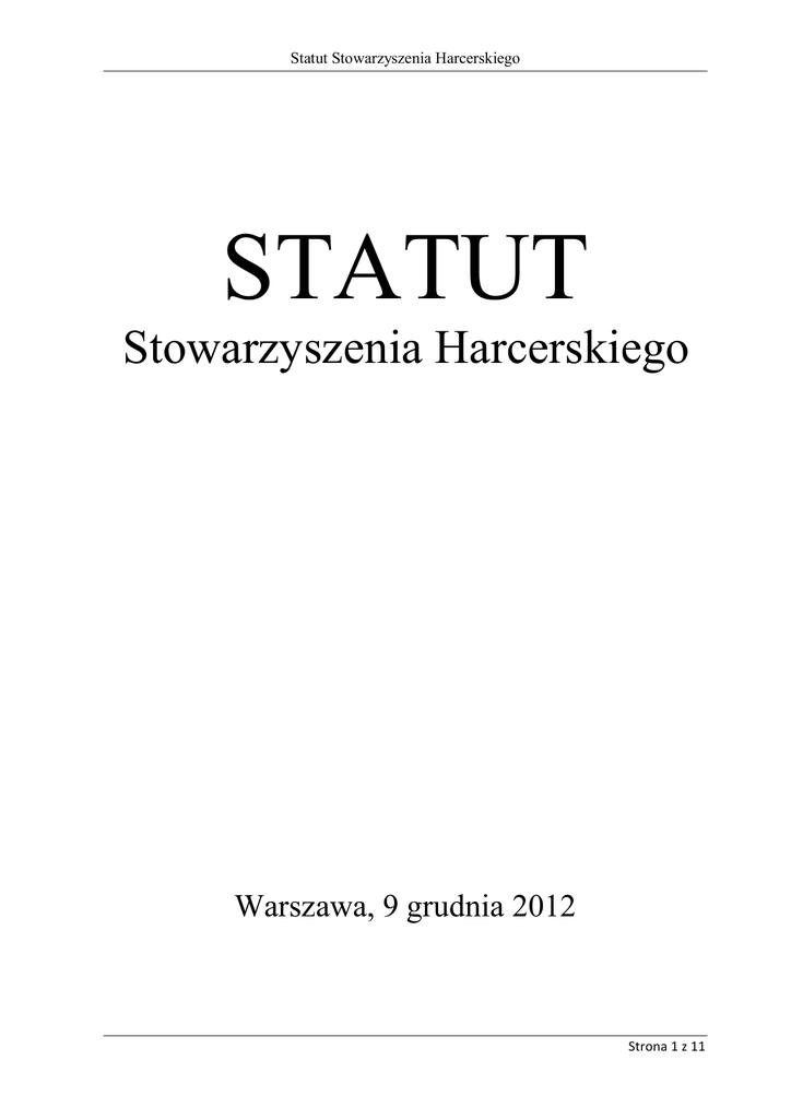 Statut Stowarzyszenia Harcerskiego STATUT Stowarzyszenia Harcerskiego Warszawa, 9 grudnia 2012 Strona 1 z 11 Statut Stowarzyszenia Harcerskiego Rozdział I Nazwa, teren działania §1 1. Stowarzyszenie Harcerskie jest stowarzyszeniem. Stowarzyszenie Harcerskie może używać skrótu SH. 2. Stowarzyszenie Harcerskie działa na terenie Rzeczypospolitej Polskiej. 3. Siedzibą władz stowarzyszenia jest miasto stołeczne Warszawa. Rozdział II Charakter SH, cele i środki działania §2 1. SH jest dobrowolnym, wychowawczym, patriotycznym i społecznym stowarzyszeniem zuchów, harcerek i harcerzy, instruktorek i instruktorów oraz działaczy. 2. SH samorządnie i demokratycznie decyduje o swoich celach, metodzie i programie oraz władzach i strukturze organizacyjnej. 3. SH kieruje się humanistycznymi normami moralnymi, kształtuje postawy szacunku dla każdego człowieka, przestrzega zasad tolerancji światopoglądowej. §3 Stowarzyszenie Harcerskie: 1) stwarza warunki do wszechstronnego, intelektualnego, społecznego, duchowego i fizycznego rozwoju człowieka; 2) zaspokaja potrzeby i oczekiwania, rozwija uzdolnienia i zainteresowania; 3) uczy decydowania i odpowiedzialności, samorządności i demokracji oraz szacunku i tolerancji dla innych ludzi i odmiennych poglądów; 4) kształtuje zaradność, nawyki gospodarności i skutecznego działania; 5) promuje zdrowy tryb życia, stwarza warunki do rozwoju sprawności fizycznej, kształtuje nawyki higieny i aktywności ruchowej w kontakcie z przyrodą, organizuje i promuje imprezy turystyczne i sportowe; 6) rozwija świadomość ekologiczną, organizuje działalność na rzecz ochrony środowiska; 7) pielęgnuje kulturę i tradycje narodowe oraz dorobek i tradycje harcerstwa; 8) jest rzecznikiem oraz obrońcą praw i interesów dzieci. §4 1. Harcerski ideał wychowawczy określają Obietnica i Prawo Zucha, Przyrzeczenie i Prawo Harcerskie oraz Zobowiązanie Instruktorskie. Obietnica Zucha Obiecuję być dobrym zuchem, zawsze przestrzegać Prawa Zucha. Prawo Zucha 1. 2. 3. 4. 5. 6. Zuch kocha Polskę. Zuch jest dzielny. Zuch mówi prawdę. Zuch pamięta o swoich obowiązkach. Wszystkim jest z zuchem dobrze. Zuch stara się być coraz lepszy. Strona 2 z 11 Statut Stowarzyszenia Harcerskiego Przyrzeczenie Harcerskie do wyboru przez składającego Przyrzeczenie Mam szczerą wolę całym życiem pełnić służbę Bogu i Polsce, nieść chętną pomoc bliźnim, być posłuszną/posłusznym Prawu Harcerskiemu. Mam szczerą wolę całym życiem pełnić służbę Polsce, dążyć do Prawdy i sprawiedliwości, nieść chętną pomoc bliźnim, być posłuszną/posłusznym Prawu Harcerskiemu. Prawo Harcerskie dla harcerek 1. Harcerka służy Polsce i sumiennie spełnia swoje obowiązki. 2. Na słowie harcerki polegaj jak na Zawiszy. 3. Harcerka jest pożyteczna i niesie pomoc bliźnim. 4. Harcerka w każdym widzi bliźniego, a za siostrę uważa każdą inną harcerkę. 5. Harcerka postępuje po rycersku. 6. Harcerka miłuje przyrodę i stara się ją poznać. 7. Harcerka jest karna i posłuszna rodzicom i wszystkim swoim przełożonym. 8. Harcerka jest zawsze pogodna. 9. Harcerka jest oszczędna i ofiarna. 10. Harcerka jest czysta w myśli, w mowie i uczynkach; nie pali tytoniu i nie pije napojów alkoholowych. dla harcerzy 1. Harcerz służy Polsce i sumiennie spełnia swoje obowiązki. 2. Na słowie harcerza polegaj jak na Zawiszy. 3. Harcerz jest pożyteczny i niesie pomoc bliźnim. 4. Harcerz w każdym widzi bliźniego, a za brata uważa każdego innego harcerza. 5. Harcerz postępuje po rycersku. 6. Harcerz miłuje przyrodę i stara się ją poznać. 7. Harcerz jest karny i posłuszny rodzicom i wszystkim swoim przełożonym. 8. Harcerz jest zawsze pogodny. 9. Harcerz jest oszczędny i ofiarny. 10. Harcerz jest czysty w myśli, w mowie i uczynkach; nie pali tytoniu i nie pije napojów alkoholowych. Zobowiązanie Instruktorskie Przyjmuję obowiązki instruktorki/instruktora Stowarzyszenia Harcerskiego. Jestem świadoma/świadom odpowiedzialności harcerskiego wychowawcy i opiekuna. Będę dbać o dobre imię harcerstwa, przestrzegać statutu stowarzyszenia, pracować nad sobą, pogłębiać swoją wiedzę i umiejętności. Wychowam następcę. Powierzonej przez Stowarzyszenie służby nie porzucę. 2. Decyzję o dopuszczeniu do złożenia Obietnicy Zuchowej lub Przyrzeczenia Harcerskiego podejmuje drużynowy lub opiekun drużyny. 3. Decyzję o dopuszczeniu do złożenia Zobowiązania Instruktorskiego podejmuje komendant hufca lub Naczelnik SH. Strona 3 z 11 Statut Stowarzyszenia Harcerskiego 4. § 5 1. Swoje cele SH realizuje stosując harcerską metodę wychowawczą. 2. Dla osiągnięcia swoich celów SH: 1) zrzesza swoich członków w podstawowych jednostkach organizacyjnych, 2) rozwija różnorodne formy zainteresowań, 3) kształci kadrę instruktorską, 4) organizuje wypoczynek letni i zimowy, wyjazdowy i w miejscu zamieszkania, 5) podejmuje działania w zakresie pomocy społecznej, 6) realizuje programy profilaktyki uzależnień, 7) działa na rzecz obrony narodowej i bezpieczeństwa narodowego oraz ratownictwa, 8) działa na rzecz rozwijania kontaktów i współpracy między społeczeństwami, 9) zabiega o fundusze, gromadzi pomoce i środki materialne, gospodaruje posiadanym majątkiem, prowadzi działalność gospodarczą, 10) współpracuje z samorządem terytorialnym, 11) może współdziałać z organizacjami i ruchami społecznymi realizującymi cele zbieżne z celami SH. 3. SH korzysta z poparcia i pomocy sympatyków stowarzyszenia, działających w ruchu przyjaciół harcerstwa. 4. SH realizuje swoje cele działając w oparciu o metodę harcerską także wśród osób nie zrzeszonych w SH Rozdział III Członkowie SH, ich prawa i obowiązki. §6 1. Członkiem SH może być każdy, kto wyraża chęć przynależności i działania zgodnie z zasadami Stowarzyszenia. 2. Członkami SH są: 1) zuchy (7–11 lat); 2) harcerki i harcerze (o