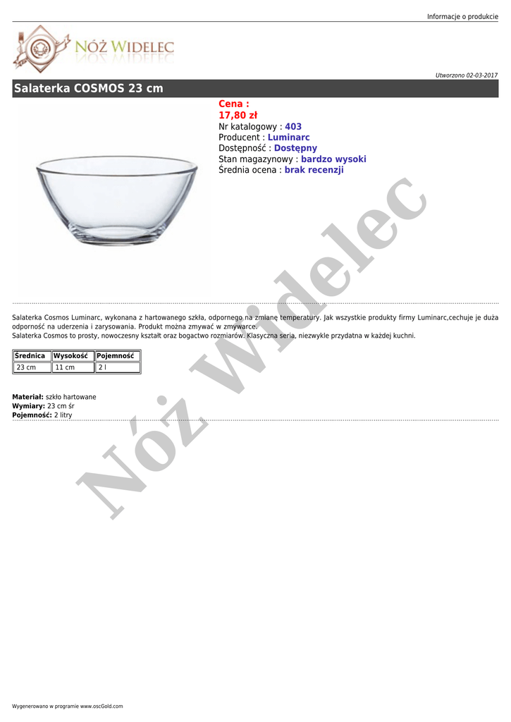 Informacje o produkcie Utworzono 02-03-2017 Salaterka COSMOS 23 cm Cena : 17,80 zł id e le c Nr katalogowy : 403 Producent : Luminarc Dostępność : Dostępny Stan magazynowy : bardzo wysoki Średnia ocena : brak recenzji Średnica Wysokość Pojemność 23 cm 11 cm 2l N óż Materiał: szkło hartowane Wymiary: 23 cm śr Pojemność: 2 litry W Salaterka Cosmos Luminarc, wykonana z hartowanego szkła, odpornego na zmianę temperatury. Jak wszystkie produkty firmy Luminarc,cechuje je duża odporność na uderzenia i zarysowania. Produkt można zmywać w zmywarce. Salaterka Cosmos to prosty, nowoczesny kształt oraz bogactwo rozmiarów. Klasyczna seria, niezwykle przydatna w każdej kuchni. Wygenerowano w programie www.oscGold.com