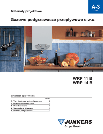 A-3 Materia³y projektowe 12/02 Gazowe podgrzewacze przep³ywowe c.w.u. WRP 11 B WRP 14 B Zawartoœæ opracowania: Strona 1. 2. 3. 4. 5. Typy dostarczanych podgrzewaczy Oznaczenie wed³ug norm Dane techniczne Wyposa¿enie fabryczne Budowa podgrzewacza 2 2 3 3 3 GAZOWE PODGRZEWACZE PRZEP£YWOWE C.W.U. TYPU WRP 11 B / WRP 14 B A-3 1. Typy dostarczanych grzejników WRP 11 B / WRP 14 B 12/02 Typ grzejnika Nr katalogowy Rodzaj gazu WRP 11 B 23 WRP 11 B 21 WRP 14 B 23 WRP 14 B 21 7 701 331 758 7 701 231 974 7 702 331 824 7 702 231 982 GZ 50 GZ 35 GZ 50 GZ 35 Istnieje mo¿liwoœæ przezbrojenia urz¹dzenia na inne rodzaje gazu: p³ynny (propan) oraz ziemny GZ 41,5. Brak mo¿liwoœci przezbrojenia WRP 14 B z gazu ziemnego GZ 50 na GZ 35. Dostêpne s¹ nastêpuj¹ce zestawy przezbrojeniowe: Typ WRP 11 B WRP 11 B WRP 14 B WRP 14 B Gaz propan GZ 41,5 propan GZ 41,5 Nr katalogowy 7 701 409 075 7 701 209 053 7 702 409 068 7 702 209 058 Oznaczenia: W R P 11/14 B = gazowy grzejnik wody przep³ywowej = p³ynna proporcjonalna zmiana mocy = jonizacyjna kontrola wystêpowania p³omienia na palniku = wskaŸnik mocy = zasilanie bateryjne (elektroniczne zapalanie iskrowe, zabezpieczenie jonizacyjne) Rys. 1 2. Oznaczenie wed³ug norm WRP11 B23 S5395 WRP11 B21 S5395 WRP14 B23 S5395 WRP14 B21 S5395 W -gazowy grzejnik wody przep³ywowej R - proporcjonalna zmiana mocy P - zap³on elektroniczny B - zasilanie bateryjne 11, 14 - wskaŸnik mocy 23 - gaz ziemny GZ50 (propan) 21 - gaz ziemny GZ35 (GZ41,5) S5395 - wersja z czujnikiem ci¹gu kominowego GGWP-19,2-B1-II/II50,IIIB;CWRP 11B 23: x-bj-Zc-P2 PN-87/M-40301 GGWP-17,4-B1-II/II35;41;CWRP 11B 21: x-bj-Zc-P2 PN-87/M-40301 WRP 14B 23: WRP 14B 21: GGWP-23,6-B1-II/II50,IIIB;C-xbj-Zc-P2 PN-87/M-40301 GGWP-21,0-B1-II/II35;41;C-xbj-Zc-P2 PN-87/M-40301 Opis oznaczników: GGWP - Gazowy Grzejnik Wody Przep³ywowej. 2 19,2; 23,6 moc (wydajnoœæ cieplna) grzejnika w kW. B1 przystosowany do pod³¹czenia do przewodu kominowego z ci¹giem naturalnym. II przystosowany do spalania wiêcej ni¿ jednej grupy lub podgrupy gazu (lecz nie wszystkich grup lub podgrup), tzn. grupy II - podgrupy: 35 (gaz ziemny GZ-35), 41 (gaz ziemny GZ-41,5), 50 (gaz ziemny GZ-50), grupy III: B (propan-butan techniczny - mieszanina B) i C (propan techniczny - mieszanina C). x z wymian¹ czêœci przy przestawieniu na inny rodzaj gazu. bj zasilany na baterie, z zabezpieczeniem przeciwwyp³ywowym jonizacyjnym. Zc zabezpieczenie przed cofaniem spalin (wyp³ywem spalin do pomieszczenia) w przypadku braku lub s³abego ci¹gu kominowego. P2 normalnociœnieniowy, o zakresie ciœnienia wody od 0,6 do 6,0 bar. PN-87/M-40301 Polska Norma: Gazowe grzejniki wody przep³ywowej. Wymagania i badania. Infolinia 0801 600 801 GAZOWE PODGRZEWACZE PRZEP£YWOWE C.W.U. TYPU WRP 11 B / WRP 14 B 3. Dane techniczne Parametr Znamionowa moc cieplna grzejnika (wydajnoœæ cieplna) Minimalna u¿ytkowa moc cieplna Znamionowe obci¹¿enie cieplne palnika g³ównego Minimalne obci¹¿enie cieplne palnika g³ównego Sprawnoœæ cieplna Ciœnienie wody - roboczy zakres przy pe³nej mocy cieplnej Zakres przep³ywu wody przy ustawieniu pokrêt³a regulatora wody do oporu w lewo Przyrost temperatury wody !t Minimalne ciœnienie wody potrzebne do uruchomienia Minimalne ciœnienie wody potrzebne do max. przep³ywu Zakres przep³ywu wody przy ustawieniu pokrêt³a regulatora wody do oporu w prawo Przyrost temperatury wody !t Minimalne ciœnienie wody potrzebne do uruchomienia Minimalne ciœnienie wody potrzebne do max. przep³ywu Maksymalne zu¿ycie gazu: - GZ-50 - GZ-41 - GZ-35 - mieszanina propanobutanu technicznego z powietrzem - propan-butan Króciec przy³¹czeniowy gazu Króciec przy³¹czeniowy wody: - zimnej - ciep³ej Œrednica przewodu odprowadzania spalin Temperatura spalin przy mocy nominalnej Minimalny ci¹g kominowy Wymiary zewnêtrzne grzejnika - wysokoœæ - szerokoœæ - g³êbokoœæ Waga Jednostka WRP 11 B WRP 14 B kW kW kW kW % bar 19,2 (17,4)* 7,0 21,8 (20,0)* 8,1 ok. 87 0,6÷6 23,6** 7,0 27,2*** 8,1 ok. 86 0,6÷6 l/min °C bar bar 4÷11 ok. 25 0,2 0,6 4÷13 ok. 25 0,2 1,0 l/min °C bar bar 2÷5,5 ok. 50 0,10 0,25 2÷7,0 ok. 50 0,10 0,35 m /godz. 3 m /godz. 3 m /godz. 3 m /godz. kg/godz. cal 2,3 2,8 3,2 3,0 1,7 3/4 2,9 3,6 3,6 2,2 3/4 cal cal mm °C mbar 3/4 1/2 130 160 0,015 3/4 1/2 130 170 0,015 mm mm mm kg 580 310 220 12 655 350 220 14 3 A-3 12/02 * dla mieszaniny propanobutanu technicznego z powietrzem i gazu GZ 35 ** dla gazu GZ 35 - 20,5 kW; dla gazu GZ 41,5 - 21,5 kW *** dla gazu GZ 35 - 23,5 kW; dla gazu GZ 41,5 - 25,0 kW 4. Wyposa¿enie fabryczne Gazowe podgrzewacze wody przep³ywowej z zap³onem elekronicznym, wyposa¿one s¹ w palnik atmosferyczny ze stali nierdzewnej, przystosowany do spalania gazów ziemnych i p³ynnych. Ka¿de urz¹dzenie jest kompletne, dostarczane jest w stanie gotowoœci do pracy na gazie GZ 50 lub GZ 35 i wyposa¿one jest w nastêpuj¹ce elementy regulacyjne, bezpieczeñstwa i obs³ugi: Ð wymiennik miedziany; Ð czujnik temperatury spalin; Ð czujnik przegrzewu wymiennika ciep³a; Ð pokrêt³o iloœci ciep³ej wody umo¿liwiaj¹ce regulacjê przyrostu temperatury c.w.u. w zakresie od 30 do 50°C; Ð jonizacyjna kontrola wystêpowania p³omienia na Infolinia 0801 600 801 Ð Ð Ð Ð palniku; diodowy wskaŸnik roz³adowania baterii; wy³¹cznik od³¹czaj¹cy zasilanie; dwie baterie R 20; 7-pozycyjne pokrêt³o rêcznej regulacji wysokoœci p³omienia na palniku (2-pozycyjne dla gazu GZ35). 5. Budowa podgrzewacza Podgrzewacze WRP 11 B i WRP 14 B maj¹ podobn¹ budowê, ró¿ni¹ siê tylko wielkoœci¹ niektórych czêœci: obudowy, palnika, nagrzewnicy, przelotów w zespole wodnym. Widok podgrzewacza z przodu, jego wymiary zewnêtrzne i po³o¿enie przy³¹czy pokazano na rys. nr 2 a) i b), schemat podgrzewacza z przodu bez obudowy - na rys. 3. 3 GAZOWE PODGRZEWACZE PRZEP£YWOWE C.W.U. TYPU WRP 11 B / WRP 14 B A-3 a) 12/02 Wymiary (mm) WR 11..B... WR 14..B... b) A B C D E F G 310 350 580 