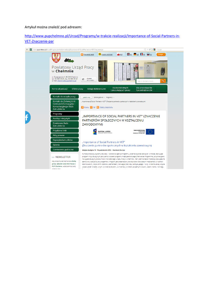 Artykuł można znaleźć pod adresem: http://www.pupchelmno.pl/Urzad/Programy/w-trakcie-realizacji/Importance-of-Social-Partners-inVET-Znaczenie-par