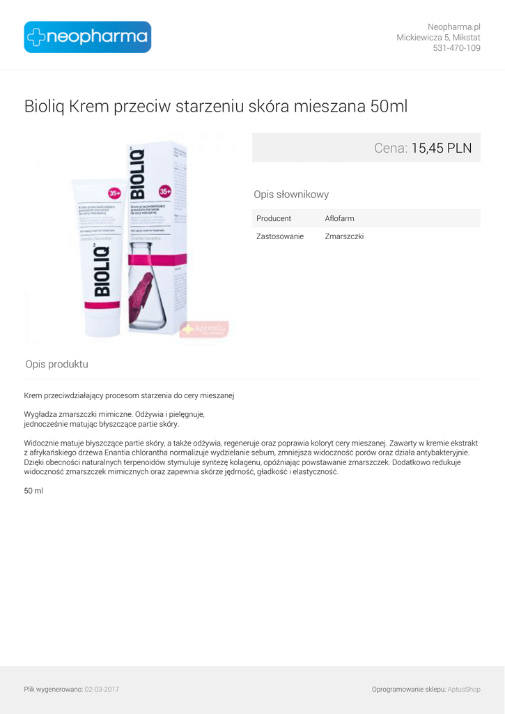 Neopharma.pl Mickiewicza 5, Mikstat 531-470-109 Bioliq Krem przeciw starzeniu skóra mieszana 50ml Cena: 15,45 PLN Opis słownikowy Producent Aflofarm Zastosowanie Zmarszczki Opis produktu Krem przeciwdziałający procesom starzenia do cery mieszanej Wygładza zmarszczki mimiczne. Odżywia i pielęgnuje, jednocześnie matując błyszczące partie skóry. Widocznie matuje błyszczące partie skóry, a także odżywia, regeneruje oraz poprawia koloryt cery mieszanej. Zawarty w kremie ekstrakt z afrykańskiego drzewa Enantia chlorantha normalizuje wydzielanie sebum, zmniejsza widoczność porów oraz działa antybakteryjnie. Dzięki obecności naturalnych terpenoidów stymuluje syntezę kolagenu, opóźniając powstawanie zmarszczek. Dodatkowo redukuje widoczność zmarszczek mimicznych oraz zapewnia skórze jędrność, gładkość i elastyczność. 50 ml Plik wygenerowano: 02-03-2017 Powered by TCPDF (www.tcpdf.org) Oprogramowanie sklepu: AptusShop