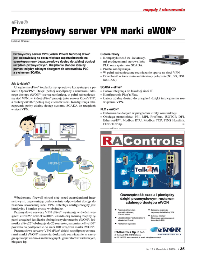 eFive® Przemysłowy serwer VPN marki eWON® Łukasz Chmiel Przemysłowy serwer VPN (Virtual Private Network) eFive® jest odpowiedzią na coraz większe zapotrzebowanie na szerokopasmowy bezprzewodowy dostęp do zdalnej obsługi urządzeń przemysłowych. Urządzenie stanowi idealny pomost między zdalnym dostępem do sterowników PLC a systemem SCADA. Jak to działa? Urządzenia eFive® to platformy sprzętowe korzystające z pakietu OpenVPN®. Dzięki pełnej współpracy z routerami zdalnego dostępu eWON® tworzą zamkniętą, w pełni zabezpieczoną sieć VPN, w której eFive® pracuje jako serwer OpenVPN®, a routery eWON® pełnią rolę klientów sieci. Konfiguracja taka zapewnia pełny zdalny dostęp systemu SCADA do urządzeń w sieci VPN. Główne zalety Kompatybilność ze światowymi producentami sterowników PLC oraz systemów SCADA. zz Prosta konfiguracja. zz W pełni zabezpieczone rozwiązanie oparte na sieci VPN. zz Dowolność w tworzeniu architektury połączeń (2G, 3G, DSL lub LAN). zz SCADA + eFive® zz Łatwa integracja do lokalnej sieci IT. zz Konfiguracja Plug’n Play. zz Łatwy zdalny dostęp do urządzeń dzięki intuicyjnemu rozwiązaniu VPN. PLC + eWON® zz Buforowanie danych w przypadku utraty komunikacji. zz Obsługa protokołów: PPI, MPI, Profibus, ISOTCP, DF1, Ethernet/IP®, Modbus RTU, Modbus TCP, FINS Hostlink, FINS TCP itp. n reklama Wbudowany firewall chroni sieć przed zagrożeniami internetowymi, zapewniając jednocześnie odpowiedni dostęp do zasobów stworzonej sieci VPN. Interfejs konfiguracyjny jest intuicyjny i bardzo prosty w obsłudze. Przemysłowe serwery VPN eFive® występują w dwóch wersjach: eFive25® oraz eFive100®. Zasadniczą różnicą między typami urządzeń jest liczba obsługiwanych routerów eWON®. Jednostka eFive25® obsługuje do 25 routerów, natomiast eFive100® pozwala na podłączenie do sieci 100 urządzeń marki eWON®. Przemysłowe serwery VPN eFive® dzięki współpracy z routerami marki eWON® stanowią doskonałe rozwiązanie w szeregu aplikacji: wodno-kanalizacyjnych, generatorów wiatrowych, biogazu itp. Nr 12 l Grudzień 2013 r. l 35