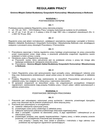 REGULAMIN PRACY Gminno-Miejski Zakład BudŜetowy Gospodarki Komunalnej i Mieszkaniowej w Bolkowie ROZDZIAŁ l POSTANOWIENIA WSTĘPNE Art. 1 Podstawę prawną ustalania Regulaminu pracy stanowią przepisy: 1. art. 104, art. 1041 – 1043 Kodeksu Pracy i przepisy wykonawcze wydane na ich podstawie. 2. art. 27 ust. 1i art. 30 ust. 4, 5 ustawy z dnia 23 maja 1991 roku o związkach zawodowych (Dz. U. z 2001 Nr 79 poz. 854) Art. 2 Regulamin pracy jest aktem normatywnym, ustalającym wewnętrzną organizację i porządek w GminnoMiejskim Zakładzie BudŜetowym Gospodarki Komunalnej i Mieszkaniowej Bolkowie oraz określającym związane z procesami pracy obowiązki Pracodawcy i Pracowników. Art. 3 1. Pracodawca zapoznaje z treścią regulaminu pracy kaŜdego przyjmowanego do pracy pracownika przed rozpoczęciem przez niego pracy, a pracownik potwierdza znajomość regulaminu swoim podpisem w treści umowy o pracę. 2. Określenia uŜyte w Regulaminie oznaczają: a) Pracownik: osoba, która zatrudniona jest na podstawie umowy o pracę lub innego aktu będącego podstawą do nawiązania stosunku pracy. b) Pracodawca - Gminno-Miejski Zakład BudŜetowy Gospodarki Komunalnej i Mieszkaniowej w Bolkowie Art. 4 1. Celem Regulaminu pracy jest sprecyzowanie reguł porządku pracy, ułatwiających naleŜyty prze bieg oraz dostosowanie podstawowych zasad prawa pracy do warunków istniejących w zakładzie pracy. 2. Przepisy Regulaminu pracy mają zastosowanie do wszystkich Pracowników zatrudnionych w zakładzie pracy, bez względu na rodzaj pracy i zajmowane stanowisko. 3. W sprawach związanych ze stosunkiem pracy, nie uregulowanych szczegółowo niniejszym regulaminem, zastosowanie mają przepisy Kodeksu pracy i innych ustaw i aktów wykonawczych z zakresu prawa pracy. ROZDZIAŁ II PODSTAWOWE OBOWIĄZKI PRACOWNIKA Art. 5 1. Pracownik jest zobowiązany wykonywać pracę sumiennie i starannie, przestrzegać dyscypliny pracy oraz stosować się do poleceń przełoŜonych, które dotyczą pracy. 2. Pracownik jest zobowiązany w szczególności: a) rzetelnie i efektywnie wykonywać pracę, b) przestrzegać czasu pracy ustalonego w zakładzie pracy, c) naleŜycie wykonywać polecenia przełoŜonego dotyczące organizacji pracy, d) dbać o porządek i czystość na stanowisku pracy, w jego sąsiedztwie i zabezpieczyć je po zakończeniu pracy, e) przestrzegać przepisy oraz zasady bezpieczeństwa i higieny pracy, a takŜe przepisy przeciw poŜarowe, a w szczególności Pracownik jest obowiązany: − znać przepisy i zasady bhp, brać udział w szkoleniu i instruktaŜu z tego zakresu oraz poddawać się wymaganym egzaminom sprawdzającym, − wykonywać pracę w sposób zgodny z przepisami i zasadami bhp oraz stosować się do wydanych w tym zakresie zarządzeń i wskazówek przełoŜonych, − dbać o naleŜyty stan maszyn, urządzeń, narzędzi i sprzętu oraz o porządek i ład w miejscu pracy, m.in. poprzez odpowiednie przechowywanie powierzonego mienia (narzędzi, części zamiennych itp.) w miejscach do tego przeznaczonych, − dbać o naleŜyty porządek oraz wygląd szatni i pomieszczeń socjalnych oraz korzystać z nich zgodnie z przeznaczeniem, − stosować środki ochrony zbiorowej, a takŜe uŜywać przydzielonej odzieŜy ochronnej i roboczej oraz sprzętu ochrony osobistej zgodnie z ich przeznaczeniem, − poddawać się badaniom lekarskim - wstępnym - przy podejmowaniu zatrudnienia oraz okresowym i kontrolnym, − niezwłocznie zawiadomić przełoŜonego o zauwaŜonym wypadku przy pracy albo zagroŜeniu Ŝycia ludzkiego lub zdrowia, − zapoznać się i przestrzegać obowiązujące na danym stanowisku pracy zasady bezpieczeństwa poŜarowego oraz znać lokalizację podręcznego sprzętu gaśniczego, a takŜe posiadać umiejętności posługiwania się nim, − współdziałać z pracodawcą w wypełnianiu obowiązków dotyczących bezpieczeństwa i higieny pracy, f) przestrzegać tajemnicy słuŜbowej i nie udzielać Ŝadnych informacji osobom trzecim na temat zakładu pracy oraz na temat spraw, o których Pracownik dowiedział się w czasie wykonywania czynności słuŜbowych, bez uzyskania pisemnej zgody pracodawcy, g) przejawiać koleŜeński stosunek do współpracowników, w szczególności okazywać pomoc Pracownikom nowo zatrudnionym i młodocianym, h) dbać o mienie zakładu pracy, w tym równieŜ o przydzieloną odzieŜ ochronną, roboczą i sprzęt ochrony osobistej oraz zabezpieczać je prze uszkodzeniem, zniszczeniem lub kradzieŜą, a takŜe dbać o jego stan i wygląd, i) wykazywać lojalność w stosunku do pracodawcy i realizować jego politykę rozwoju zakładu pracy, j) podnosić swoje kwalifikacje poprzez uczestnictwo w kursach i szkoleniach organizowanych przez pracodawcę, jak równieŜ poprzez samokształcenie zawodowe, k) przestrzegać postanowień niniejszego Regulaminu oraz wewnętrznych aktów normatywnych obowiązujących w zakładzie pracy. 3. Pracownik ma prawo: a) do zatrudnienia na stanowisku pracy zgodnie z rodzajem pracy wynikającym z treści zawartej umowy o pracę i zgodnie z posiadanymi kwalifikacjami, b) do wynagrodzenia za pracę, c) do bezpiecznych i higienicznych warunków pracy, d) do wypoczynku: w dniach wolnych od pracy, przez prawidłowe przestrzeganie czasu pracy w zakładzie oraz korzystania z urlopów wypoczynkowych i innych przerw, e) do równych praw z tytułu jednakowego wypełniania takich samych obowiązków, a szczególnie do równouprawnienia, czyli do równego traktowania kobiet i męŜczyzn w zakresie pracy, f) do tworzenia organizacji Pracowników i przystępowania do nich, które to organizacje - związki zawodowe mają prawo do reprezentowania i obrony praw i interesów Pracowników, g) do uczestniczenia w zarządzaniu zakładem w zakresie i na zasadach określonych w odrębnych przepisach. ROZDZIAŁ III PRAWA l OBOWIĄZKI PRACODAWCY Art. 6 1. Do obowiązków Pracodawcy naleŜy w szczególności: a) zaznajamianie Pracowników podejmu
