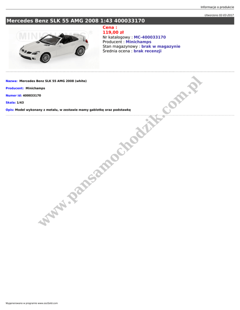 Informacje o produkcie Utworzono 02-03-2017 Mercedes Benz SLK 55 AMG 2008 1:43 400033170 Cena : 119,00 zł Nr katalogowy : MC-400033170 Producent : Minichamps Stan magazynowy : brak w magazynie Średnia ocena : brak recenzji .p l Nazwa: Mercedes Benz SLK 55 AMG 2008 (white) Skala: 1/43 w w w .p an sa m oc ho dz ik Opis: Model wykonany z metalu, w zestawie mamy gablotkę oraz podstawkę .c Numer id: 400033170 om Producent: Minichamps Wygenerowano w programie www.oscGold.com