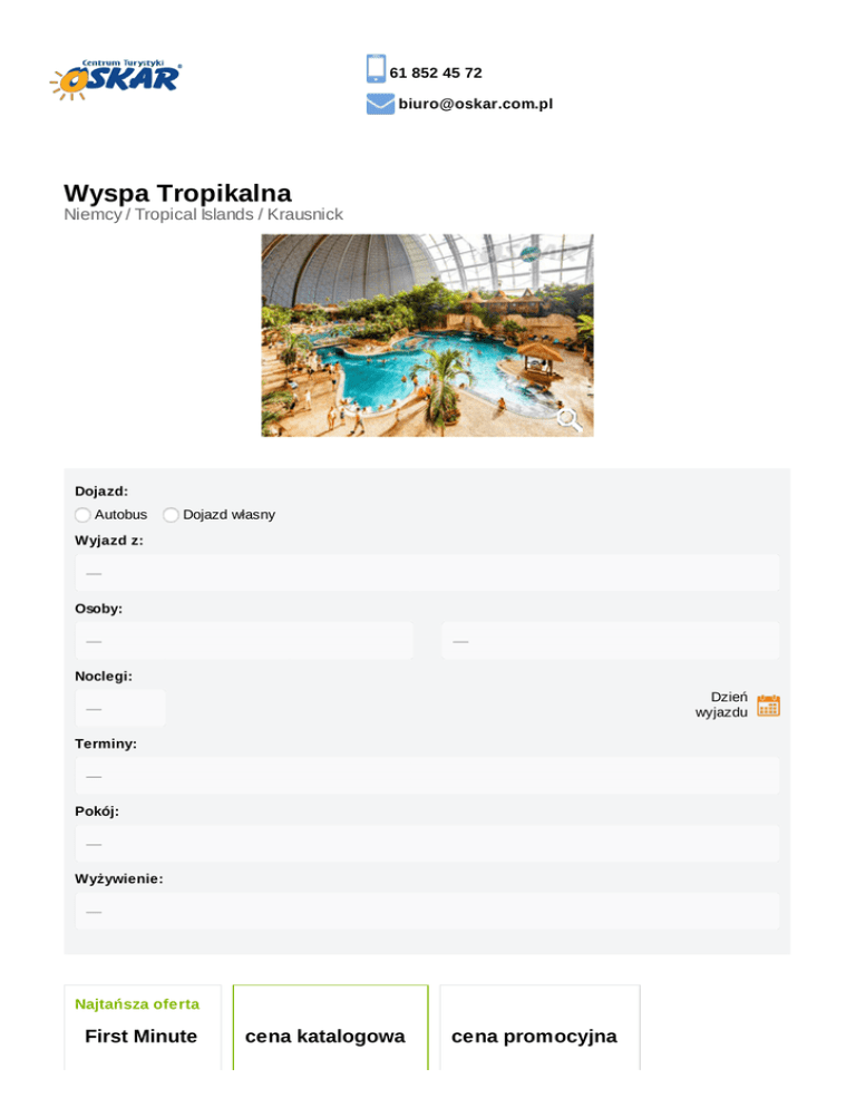 61 852 45 72 [email protected] Wyspa Tropikalna Niemcy / Tropical Islands / Krausnick Dojazd: Autobus Dojazd własny Wyjazd z: Osoby: Noclegi: Dzień wyjazdu Terminy: Pokój: Wyżywienie: Najtańsza oferta First Minute cena katalogowa cena promocyjna do 5 marca 2017: 46,20 zł do 5 marca 2017: 46,20 zł do 5 marca 2017: 46,20 zł do 5 marca 2017: 107,80 zł do 5 marca 2017: 107,80 zł do 31 sierpnia 2017: 107,80 zł Suma:154,00 zł Suma: 154,00 zł Suma: 154,00 zł Opis oferty Miejscowość Wyspa Tropikalna Wymarzona Opinie temperatura - nawet 26°C przez 365 dni w roku sprawia, że Wyspa Tropikalna (Tropical Islands) to idealny cel weekendowej podróży! Każdy gość może rozkoszować się tropikami na terenie odpowiadającym 8 boiskom do piłki nożnej (66.000 km2)! Największy zadaszony las tropikalny świata, Rozkład jazdy największa w Europie strefa saun, Morze Południowe z 200 m piaszczystej plaży i wiele innych atrakcji czekają na gości w każdym wieku! Tropical Islands to przygoda, odpoczynek i relaks, to gorący wypoczynek w samym sercu Europy. Na wyspie szybować można balonem aż 55 metrów nad lasem tropikalnym, obserwować żółwie i bagno mangrowe, unosić się na falach Laguny Bali lub poszaleć zjeżdżając z najwyższej w Niemczech zjeżdżalni wieżowej. To wszystko jest możliwe tylko w Tropical Islands! Karta Dużej Rodziny www.oskar.com.pl/zalaczniki/karta_duzej_rodziny Zakwaterowanie Oferta nie obejmuje zakwaterowania. Turystyczny Fundusz Gwarancyjny W związku z powołaniem do życia w dniu 26.11.2016 Turystycznego Funduszu Gwarancyjnego każdy klient Biura Podróży Oskar zobowiązany jest do zapłaty kwoty w wysokości 10zł/os. przy każdorazowej rezerwacji imprezy turystycznej (obowiązuje od dnia 26.11.2016). Kwota przeznaczona na Turystyczny Fundusz Gwarancyjny zostanie automatycznie doliczona do wartości rezerwacji (w momencie jej dokonania). Wyjątkiem są imprezy turystyczne odbywające się w krajach posiadających granicę z Rzeczpospolitą Polską. Składka nie jest przychodem biura. Ubezpieczenie Warunki ubezpieczenia Bezpieczne Podróże Signal Iduna dokument do pobrania www.oskar.com.pl/zalaczniki/owu Warunki ubezpieczenia Kosztów Imprezy Turystycznej Signal Iduna dokument do pobrania www.oskar.com.pl/zalaczniki/owurg DWUpak i TRZYpak DWUpak z rabatem do 25% na osobe TRZYpak z rabatem do 50% na osobe Promocja obowiązuje przy zakupie 2 lub 3 spośród typów ofert: Karnawał w Wenecji, Wyspa Tropikalna, Legoland, Heide Park, Alzacja: Strasburg + Colmar, Festiwal Tulipanów i Amsterdam, Parada Kwiatów, Hamburg + Kraina M iniatur, Kopenhaga + Ogrody Tivoli, Salzburg i Hallstatt, Wodospad Rheinfall i Wyspa M ainau. Rabat naliczany jest od ceny podstawowej i dotyczy najtańszej spośród wybranych ofert. Istnieje możliwość dowolnej kombinacji rezerwacji wyjazdów przy zalożeniu, że dane osobowe uczestników nie ulegają zmianie. Udogodnienia Klimatyzacja Regulowane fotele Tacki Nowoczesna flota Zawodowy kierowca Pasy bezpieczeństwa Toaleta w autokarze Podnóżki City breaks Dla rodzin z dziećmi Wi-Fi Basen kryty Bez paszportu Basen odkryty Zjeżdżalnie wodne Wellness/SPA Program ramowy Wyjazd z Poznania w sobotę o godz. 06:00. Przyjazd do Tropikalnej Wyspy około godz. 10:00. Zabawa w aquaparku do godz. 20:00. Zbiórka przy autokarze. Wyjazd w drogę powrotną. Przyjazd do Poznania około godz. 23:00. Orientacyjne godziny wyjazdów i powrotów z/do innych miast znajdują się w rozkładzie jazdy. Cena obejmuje przejazd autokarem (klimatyzacja, barek, DVD, WC) na trasie Poznań - Tropical Islands - Poznań opieka pilota na trasie ubezpieczenie KL i NNW Cena nie obejmuje Dopłaty wymagane na miejscu bilet wstępu Tropical Islands: tropiki (baseny): 35 €/os. dorosła; 29 €/dzieci do 14 lat, uczniowie, studenci i seniorzy; dzieci do 5 lat bezpłatnie; tropiki +sauny: 40 €/os. dorosła; 35 €/dzieci do 14 lat, uczniowie, studenci i seniorzy - płatne u pilota w autokarze dopłata za zmianę stref 14 €/dzień Informacje dodatkowe należy zadeklarować rodzaj biletu w momencie rezerwacji lub na kilka dni przed wyjazdem - NIE M A M OŻLIWOŚCI ZM IANY RODZAJU BILETU NA DZIEŃ PRZED WYJAZDEM ORAZ NA M IEJSCU PRZY KASACH dla grup możliwość organizacji wyjazdu w dowolnym terminie - zainteresowane osoby prosimy o kontakt dokumenty - paszport lub dowód osobisty (zgodnie z obowiązującymi przepisami) zaleca się wyrobienie karty EKUZ Chcesz wiedzieć szybciej? Polub nas na facebooku OSKAR Sp. z o.o. pl.Wolności 2/4c, 61-738 Poznań Potrzebujesz pomocy? Zadzwoń lub napisz: 61 852 45 72 [email protected] Zadzwoń Projekt i wdrożenie: Simply User