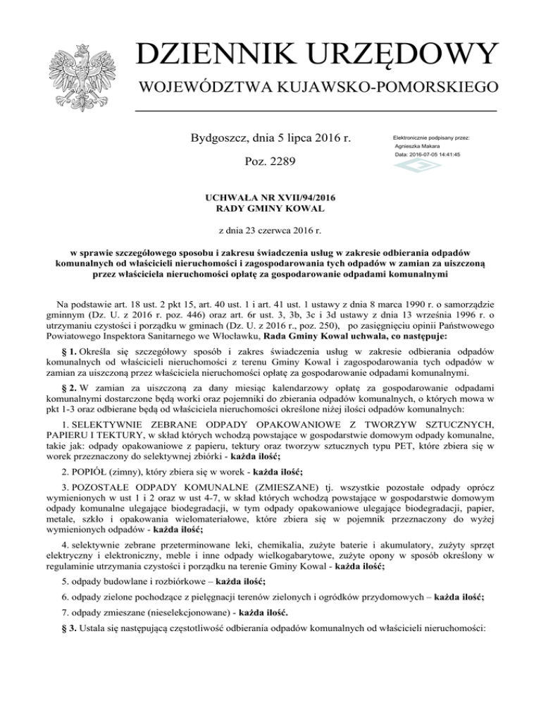 DZIENNIK URZĘDOWY WOJEWÓDZTWA KUJAWSKO-POMORSKIEGO Bydgoszcz, dnia 5 lipca 2016 r. Elektronicznie podpisany przez: Agnieszka Makara Poz. 2289 Data: 2016-07-05 14:41:45 UCHWAŁA NR XVII/94/2016 RADY GMINY KOWAL z dnia 23 czerwca 2016 r. w sprawie szczegółowego sposobu i zakresu świadczenia usług w zakresie odbierania odpadów komunalnych od właścicieli nieruchomości i zagospodarowania tych odpadów w zamian za uiszczoną przez właściciela nieruchomości opłatę za gospodarowanie odpadami komunalnymi Na podstawie art. 18 ust. 2 pkt 15, art. 40 ust. 1 i art. 41 ust. 1 ustawy z dnia 8 marca 1990 r. o samorządzie gminnym (Dz. U. z 2016 r. poz. 446) oraz art. 6r ust. 3, 3b, 3c i 3d ustawy z dnia 13 września 1996 r. o utrzymaniu czystości i porządku w gminach (Dz. U. z 2016 r., poz. 250), po zasięgnięciu opinii Państwowego Powiatowego Inspektora Sanitarnego we Włocławku, Rada Gminy Kowal uchwala, co następuje: § 1. Określa się szczegółowy sposób i zakres świadczenia usług w zakresie odbierania odpadów komunalnych od właścicieli nieruchomości z terenu Gminy Kowal i zagospodarowania tych odpadów w zamian za uiszczoną przez właściciela nieruchomości opłatę za gospodarowanie odpadami komunalnymi. § 2. W zamian za uiszczoną za dany miesiąc kalendarzowy opłatę za gospodarowanie odpadami komunalnymi dostarczone będą worki oraz pojemniki do zbierania odpadów komunalnych, o których mowa w pkt 1-3 oraz odbierane będą od właściciela nieruchomości określone niżej ilości odpadów komunalnych: 1. SELEKTYWNIE ZEBRANE ODPADY OPAKOWANIOWE Z TWORZYW SZTUCZNYCH, PAPIERU I TEKTURY, w skład których wchodzą powstające w gospodarstwie domowym odpady komunalne, takie jak: odpady opakowaniowe z papieru, tektury oraz tworzyw sztucznych typu PET, które zbiera się w worek przeznaczony do selektywnej zbiórki - każda ilość; 2. POPIÓŁ (zimny), który zbiera się w worek - każda ilość; 3. POZOSTAŁE ODPADY KOMUNALNE (ZMIESZANE) tj. wszystkie pozostałe odpady oprócz wymienionych w ust 1 i 2 oraz w ust 4-7, w skład których wchodzą powstające w gospodarstwie domowym odpady komunalne ulegające biodegradacji, w tym odpady opakowaniowe ulegające biodegradacji, papier, metale, szkło i opakowania wielomateriałowe, które zbiera się w pojemnik przeznaczony do wyżej wymienionych odpadów - każda ilość; 4. selektywnie zebrane przeterminowane leki, chemikalia, zużyte baterie i akumulatory, zużyty sprzęt elektryczny i elektroniczny, meble i inne odpady wielkogabarytowe, zużyte opony w sposób określony w regulaminie utrzymania czystości i porządku na terenie Gminy Kowal - każda ilość; 5. odpady budowlane i rozbiórkowe – każda ilość; 6. odpady zielone pochodzące z pielęgnacji terenów zielonych i ogródków przydomowych – każda ilość; 7. odpady zmieszane (nieselekcjonowane) - każda ilość. § 3. Ustala się następującą częstotliwość odbierania odpadów komunalnych od właścicieli nieruchomości: Dziennik Urzędowy Województwa Kujawsko-Pomorskiego –2– Poz. 2289 1. SELEKTYWNIE ZEBRANE ODPADY OPAKOWANIOWE Z TWORZYW SZTUCZNYCH, PAPIERU I TEKTURY, o których mowa w § 2 pkt. 1, w zamian za uiszczoną opłatę, odbierane są bezpośrednio od właścicieli nieruchomości – raz w miesiącu; 2. POPIÓŁ (zimny), o którym mowa w § 2 pkt. 2 w zamian za uiszczoną opłatę, odbierany jest bezpośrednio od właścicieli nieruchomości – jeden raz w miesiącu w okresie od października do kwietnia lub na bieżąco w punkcie selektywnego zbierania odpadów komunalnych w wyznaczonych dniach i godzinach jego otwarcia; 3. POZOSTAŁE ODPADY KOMUNALNE (ZMIESZANE), o których mowa w § 2 pkt. 3,w zamian za uiszczoną opłatę, odbierane są bezpośrednio od właścicieli nieruchomości – raz w miesiącu; 4. Odpady zmieszane (nieselekcjonowane), w przypadku gdy właściciel nieruchomości nie zadeklaruje selektywnej zbiórki odpadów komunalnych, o których mowa w § 2 pkt. 7, odbierane są bezpośrednio od właścicieli nieruchomości – raz w miesiącu; § 4. Ustala się następującą częstotliwość odbierania selektywnie zbieranych odpadów komunalnych od właścicieli nieruchomości: 1. przeterminowane leki – na bieżąco w przeznaczonych do tego celu pojemnikach, ustawionych w wyznaczonych miejscach lub w punkcie selektywnego zbierania odpadów komunalnych, w wyznaczonych dniach i godzinach jego otwarcia; 2. chemikalia – na bieżąco w punkcie selektywnego zbierania odpadów komunalnych, w wyznaczonych dniach i godzinach jego otwarcia; 3. baterie – na bieżąco w przeznaczonych do tego celu pojemnikach, ustawionych w wyznaczonych miejscach, w punktach ich sprzedaży (w godzinach pracy) lub w punkcie selektywnego zbierania odpadów komunalnych w wyznaczonych dniach i godzinach jego otwarcia; 4. akumulatory – na bieżąco w punktach ich sprzedaży (w godzinach pracy) lub w punkcie selektywnego zbierania odpadów komunalnych, w wyznaczonych dniach i godzinach jego otwarcia; 5. zużyty sprzęt elektryczny i elektroniczny - na bieżąco w punktach ich sprzedaży (w godzinach pracy) lub w punkcie selektywnego zbierania odpadów komunalnych, w wyznaczonych dniach i godzinach jego otwarcia; 6. meble i inne odpady wielkogabarytowe - na bieżąco w punkcie selektywnego zbierania odpadów komunalnych, w wyznaczonych dniach i godzinach jego otwarcia; 7. odpady budowlane i rozbiórkowe - na bieżąco w punkcie selektywnego zbierania odpadów komunalnych, w wyznaczonych dniach i godzinach jego otwarcia; 8. zużyte opony - na bieżąco w punktach ich sprzedaży (w godzinach pracy) lub w punkcie selektywnego zbierania odpadów komunalnych, w wyznaczonych dniach i godzinach jego otwarcia; 9. odpady zielone - na bieżąco w punkcie selektywnego zbierania odpadów komunalnych, wyznaczonych dniach i godzinach jego otwarcia. w § 5. 1. Punkt Selektywnego Zbierania Odpadów Komunalnych (PSZOK) funkcjonuje w miejscowości Przydatki Goł