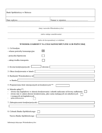 Bank Spółdzielczy w Skórczu Data wpływu ........................................... Numer w rejestrze........................................... ......................................................................................................................................................................... (imię i nazwisko Wnioskodawcy/ów) ......................................................................................................................................................................... (adres stałego zameldowania) ......................................................................................................................................................................... (adres do korespondencji, nr telefonu) WNIOSEK O KREDYT NA CELE KONSUMPCYJNE LUB POŻYCZKĘ 1. Cel kredytu: - własne potrzeby konsumpcyjne - pożyczka hipoteczna - zakup środka transportu 2. Kwota kredytu/pożyczki słownie: 3. Okres kredytowania w latach 4. Rachunek Wnioskodawcy nr w Banku 5. Proponowana ilość miesięcznych rat kredytowych ** 6. Metoda spłaty**: - równe raty kapitałowe w okresie kredytowania i odsetki naliczane od kwoty zadłużenia - równe raty w całym okresie kredytowania, jako suma malejących rat odsetkowych i rosnących rat kapitałowych - spłata jednorazowa 7. Zabezpieczenie kredytu/pożyczki: 8. Członek Banku Spółdzielczego Nazwa Banku Spółdzielczego Informacje dotyczące Wnioskodawcy/ów: TREŚĆ WNIOSKODAWCA MAŁŻONEK pozostający/nie pozostający* we wspólności majątkowej Imię i nazwisko, nazwisko panieńskie Imię ojca Data i miejsce urodzenia PESEL Stan cywilny Obywatelstwo Seria i numer dowodu tożsamości i przez kogo wydany i dzień wydania NIP Status zajmowanego domu/lokalu /własne, najem, z rodzicami itp./ oraz okres zamieszkiwania pod obecnym adresem Poprzednie miejsce zamieszkania – w wypadku zmiany w ciągu 2 ostatnich lat Numer rachunku oszczędnościowo- rozliczeniowego, nazwa banku prowadzącego i rok otwarcia Wykształcenie Zawód wykonywany Miejsce pracy – nazwa i adres pracodawcy, nr telefonu oraz okres pracy i stanowisko Dochód miesięczny netto podstawowy Dochód miesięczny netto dodatkowy Stałe obciążenia dochodu z tytułu wyroków sądowych, świadczeń alimentacyjnych – wysokość obciążenia miesięcznego i ostateczny termin spłaty Zobowiązania podatkowe – zaległe /kwota/ i bieżące /wysokość zobowiązania miesięcznego/ Przeciętne wydatki miesięczne z tytułu czynszu, opłat za energię, telefon itp. Liczba osób we wspólnym gospodarstwie domowym / w tym na utrzymaniu Koszty utrzymania rodziny( wyżywienie, ubrania, lekarstwa itp.) Stosunek do służby wojskowej Czy ubiega się o kredyt lub pożyczkę w innym banku …............................................................................................................................ podpisy Kredytobiorcy / Współkredytobiorcy Informacje o posiadanym majątku nieruchomości – adres rodzaj nieruchomości – wartość rynkowa lokaty (kwoty, waluta, okres, nazwa banku) udziały w przedsiębiorstwach, akcje, obligacje posiadane jednostki uczestnictwa TFI (kwota, nazwa Funduszu) Posiadane zobowiązania finansowe Zaciągnięte kredyty, pożyczki kredyt pożyczka .............. kredyt pożyczka ........... kwota, waluta aktualnego zadłużenia miesięczna rata nazwa banku/oddział data zaciągnięcia zobowiązania (data umowy) kwota, waluta aktualnego zadłużenia miesięczna rata nazwa banku/oddział data zaciągnięcia zobowiązania (data umowy) data spłaty zobowiązania (z umowy) data spłaty zobowiązania (z umowy) Przyznane limity kredytowe kwota, waluta przyznanego limitu nazwa banku/oddział data zaciągnięcia zobowiązania (data umowy) data spłaty zobowiązania (z umowy) kwota, waluta przyznanego limitu nazwa banku/oddział data zaciągnięcia zobowiązania (data umowy) data spłaty zobowiązania (z umowy) Zobowiązania z tytułu udzielonych poręczeń kredyt pożyczka kredyt pożyczka .............. . kwota, waluta aktualnego zadłużenia miesięczna rata nazwa banku/oddział data zaciągnięcia zobowiązania (data umowy) data spłaty zobowiązania (z umowy) kwota, waluta aktualnego zadłużenia miesięczna rata nazwa banku/oddział data zaciągnięcia zobowiązania (data umowy) data spłaty zobowiązania (z umowy) ...................................... (podpis Wnioskodawcy) Informacje dotyczące Poręczycieli: ...................................... (podpis Małżonka) TREŚĆ PORĘCZYCIEL 1 pozostający/nie pozostający* we wspólności majątkowej PORĘCZYCIEL 2 pozostający/nie pozostający* we wspólności majątkowej Imię i nazwisko, nazwisko panieńskie Imię ojca Data i miejsce urodzenia PESEL Stan cywilny Obywatelstwo Seria i numer dowodu tożsamości i przez kogo wydany i dzień wydania NIP Miejsce stałego zameldowania – adres z kodem, nr telefonu, nr telefonu komórkowego Status zajmowanego domu/lokalu /własne, najem, z rodzicami itp./ oraz okres zamieszkiwania pod obecnym adresem Poprzednie miejsce zamieszkania – w wypadku zmiany w ciągu 2 ostatnich lat Numer rachunku oszczędnościowo- rozliczeniowego, nazwa banku prowadzącego i rok otwarcia Wykształcenie Zawód wykonywany Miejsce pracy – nazwa i adres pracodawcy, nr telefonu oraz okres pracy i stanowisko Dochód miesięczny netto Zobowiązania wobec banków i innych podmiotów z tytułu kredytów, pożyczek, poręczeń itp. – nazwa instytucji, rodzaj i kwota zobowiązania, ostateczny termin spłaty i wysokość obciążenia miesięcznego (rata kapitału i odsetek) Stałe obciążenia dochodu z tytułu wyroków sądowych, świadczeń alimentacyjnych – wysokość obciążenia miesięcznego i ostateczny termin spłaty Zobowiązania podatkowe – zaległe /kwota/ i bieżące /wysokość zobowiązania miesięcznego/ Przeciętne wydatki miesięczne z tytułu czynszu, opłat za energię, telefon itp. Liczba osób we wspólnym gospodarstwie domowy