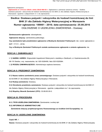 1z2 http://bzp1.portal.uzp.gov.pl/index.php?ogloszenie=show&pozycja=18... Ogłoszenie powiązane: Ogłoszenie nr 171111-2016 z dnia 2016-08-02 r. Ogłoszenie o zamiarze zawarcia umowy - Siedlce Dostawa pożywki i odczynnika do hodowli komórkowej do linii BHK 21 dla Zakładu Higieny Weterynaryjnej w Warszawie -zgodnie z załącznikiem nr 1 do zaproszenia Siedlce: Dostawa pożywki i odczynnika do hodowli komórkowej do linii BHK 21 dla Zakładu Higieny Weterynaryjnej w Warszawie Numer ogłoszenia: 189061 - 2016; data zamieszczenia: 25.08.2016 OGŁOSZENIE O UDZIELENIU ZAMÓWIENIA - Dostawy Zamieszczanie ogłoszenia: obowiązkowe. Ogłoszenie dotyczy: zamówienia publicznego. Czy zamówienie było przedmiotem ogłoszenia w Biuletynie Zamówień Publicznych: tak, numer ogłoszenia w BZP: 171111 - 2016r. Czy w Biuletynie Zamówień Publicznych zostało zamieszczone ogłoszenie o zmianie ogłoszenia: nie. SEKCJA I: ZAMAWIAJĄCY I. 1) NAZWA I ADRES: Wojewódzki Inspektorat Weterynarii z siedzibą w Siedlcach, ul. Kazimierzowska 29, 08-110 Siedlce, woj. mazowieckie, tel. 025 6326459, faks 025 6325584. I. 2) RODZAJ ZAMAWIAJĄCEGO: Administracja rządowa terenowa. SEKCJA II: PRZEDMIOT ZAMÓWIENIA II.1) Nazwa nadana zamówieniu przez zamawiającego: Dostawa pożywki i odczynnika do hodowli komórkowej do linii BHK 21 dla Zakładu Higieny Weterynaryjnej w Warszawie. II.2) Rodzaj zamówienia: Dostawy. II.3) Określenie przedmiotu zamówienia: Dostawa pożywki i odczynnika do hodowli komórkowej do linii BHK 21 dla Zakładu Higieny Weterynaryjnej w Warszawie - zgodnie z załącznikiem ne 1 do zaproszenia. II.4) Wspólny Słownik Zamówień (CPV): 33.69.65.00-0. SEKCJA III: PROCEDURA III.1) TRYB UDZIELENIA ZAMÓWIENIA: Zamówienie z wolnej ręki III.2) INFORMACJE ADMINISTRACYJNE Zamówienie dotyczy projektu/programu finansowanego ze środków Unii Europejskiej: nie SEKCJA IV: UDZIELENIE ZAMÓWIENIA Część NR: 1 Nazwa: Dostawa pożywki i odczynnika do hodowli komórkowej do linii BHK 21 dla Zakładu Higieny Weterynaryjnej 2016-08-25 14:31 2z2 http://bzp1.portal.uzp.gov.pl/index.php?ogloszenie=show&pozycja=18... w Warszawie. IV.1) DATA UDZIELENIA ZAMÓWIENIA: 10.08.2016. IV.2) LICZBA OTRZYMANYCH OFERT: 1. IV.3) LICZBA ODRZUCONYCH OFERT: 0. IV.4) NAZWA I ADRES WYKONAWCY, KTÓREMU UDZIELONO ZAMÓWIENIA: Life Technologies Polska Sp. z o.o., ul. Bonifraterska 17, 00-203 Warszawa, kraj/woj. mazowieckie. IV.5) Szacunkowa wartość zamówienia (bez VAT): 742,45 PLN. IV.6) INFORMACJA O CENIE WYBRANEJ OFERTY ORAZ O OFERTACH Z NAJNIŻSZĄ I NAJWYŻSZĄ CENĄ Cena wybranej oferty: 895,44 Oferta z najniższą ceną: 895,44 / Oferta z najwyższą ceną: 895,44 Waluta: PLN . ZAŁĄCZNIK I Uzasadnienie udzielenia zamówienia w trybie negocjacji bez ogłoszenia, zamówienia z wolnej ręki albo zapytania o cenę 1. Podstawa prawna Postępowanie prowadzone jest w trybie zamówienie z wolnej ręki na podstawie art. 67 ust. 1 pkt 4 ustawy z dnia 29 stycznia 2004r. - Prawo zamówień publicznych. 2. Uzasadnienia wyboru trybu Należy podać uzasadnienie faktyczne i prawne wyboru trybu oraz wyjaśnić, dlaczego udzielenie zamówienia jest zgodne z przepisami. Uprzednio prowadzone postępowania o udzielenie zamówienia publicznego nr sprawy WIW-AD-I.272.4.2016 pakiet nr 1 oraz WIW-AD.272.18.2016 zostały unieważnione na podstawie art. 93 ust. 1 pkt 1 Ustawy PZP. 2016-08-25 14:31