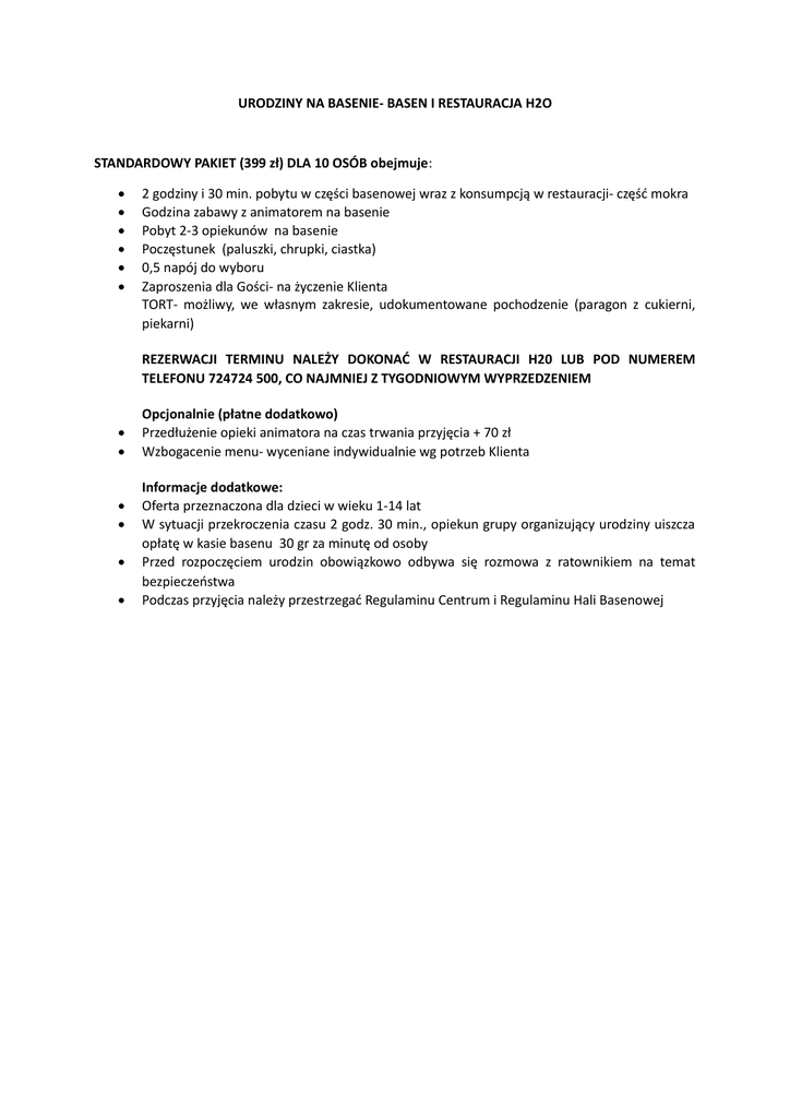URODZINY NA BASENIE- BASEN I RESTAURACJA H2O STANDARDOWY PAKIET (399 zł) DLA 10 OSÓB obejmuje: 2 godziny i 30 min. pobytu w części basenowej wraz z konsumpcją w restauracji- część mokra Godzina zabawy z animatorem na basenie Pobyt 2-3 opiekunów na basenie Poczęstunek (paluszki, chrupki, ciastka) 0,5 napój do wyboru Zaproszenia dla Gości- na życzenie Klienta TORT- możliwy, we własnym zakresie, udokumentowane pochodzenie (paragon z cukierni, piekarni) REZERWACJI TERMINU NALEŻY DOKONAĆ W RESTAURACJI H20 LUB POD NUMEREM TELEFONU 724724 500, CO NAJMNIEJ Z TYGODNIOWYM WYPRZEDZENIEM Opcjonalnie (płatne dodatkowo) Przedłużenie opieki animatora na czas trwania przyjęcia + 70 zł Wzbogacenie menu- wyceniane indywidualnie wg potrzeb Klienta Informacje dodatkowe: Oferta przeznaczona dla dzieci w wieku 1-14 lat W sytuacji przekroczenia czasu 2 godz. 30 min., opiekun grupy organizujący urodziny uiszcza opłatę w kasie basenu 30 gr za minutę od osoby Przed rozpoczęciem urodzin obowiązkowo odbywa się rozmowa z ratownikiem na temat bezpieczeństwa Podczas przyjęcia należy przestrzegać Regulaminu Centrum i Regulaminu Hali Basenowej