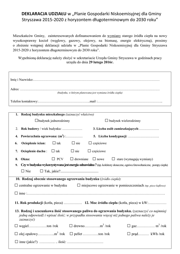 DEKLARACJA UDZIAŁU w „Planie Gospodarki Niskoemisyjnej dla Gminy Stryszawa 2015-2020 z horyzontem długoterminowym do 2030 roku” Mieszkańców Gminy, zainteresowanych dofinansowaniem do wymiany starego źródła ciepła na nowy wysokosprawny kocioł (węglowy, gazowy, olejowy, na biomasę, energie elektryczną), prosimy o złożenie wstępnej deklaracji udziału w „Planie Gospodarki Niskoemisyjnej dla Gminy Stryszawa 2015-2020 z horyzontem długoterminowym do 2030 roku”. Wypełnioną deklarację należy złożyć w sekretariacie Urzędu Gminy Stryszawa w godzinach pracy urzędu do dnia 29 lutego 2016r. Imię i Nazwisko:…………………………………………………………………………………………………… Adres: ……………………………………………………………………………………………………………… (budynku, w którym planowana jest wymiana źródła ciepła) Telefon kontaktowy:………………………………………..mail :………………………………………………….. 1. Rodzaj budynku mieszkalnego (zaznaczyć właściwe) □budynek jednorodzinny □ budynek wielorodzinny 2. Rok budowy / wiek budynku: ……………… 3. Liczba osób zamieszkujących:……………… 4. Powierzchnia ogrzewana: (m2) :…………… 5. Liczba kondygnacji: ………………………. 6. Ocieplenie ścian: 7. Ocieplenie dachu : 8. Okna: 9. □ tak □ tak □ PCV □ nie □ częściowe □ nie □ częściowe □ drewniane □ nowe □ stare (wymagają wymiany) Czy w budynku wykorzystywana jest energia odnawialna ? (np. kolektory słoneczne, ogniwa fotowoltaniczne, pompy ciepła) □ Nie □ Tak, jakie?.......................................... 10. Rodzaj obecnie stosowanego ogrzewania budynku (źródło ciepła): □ centralne ogrzewanie w budynku □ miejscowe ogrzewanie w pomieszczeniach (np. piece kaflowe) □ inne :…………………………………………………………………………………………………… 11. Rok produkcji (kotła, pieca) …………… 12. Moc źródła ciepła (kotła, pieca) w kW:…………… 13. Rodzaj i szacunkowa ilość stosowanego paliwa do ogrzewania budynku. (zaznaczyć co najmniej jedną odpowiedź i wpisać ilość; w przypadku stosowania więcej niż jednego paliwa należy je zaznaczyć) □ węgiel……………ton /rok □ drewno………….m3 /rok □ olej opałowy…………..m3 /rok □ pellet ………….ton /rok □ inne (jakie?) …………. .. ilość: ………………………… □ gaz…………… m3 /rok □ prąd……… kWh /rok 14. Ciepła woda - sposób podgrzewania (w przypadku stosowania więcej niż jednego sposobu podgrzewania ciepłej wody, należy je zaznaczyć): □ to samo źródło co ogrzewanie □ piecyk gazowy □ podgrzewacz elektryczny □ kolektory słoneczne □ inny:…………………………………………………… 15. Planuję wymianę dotychczasowego wyżej opisanego źródła ciepła (kotła, pieca, kominka itp.) na: □ kocioł na ekogroszek (odpowiadający 5 klasie wg normy PN-EN 303-5:2012 o sprawności energetycznej ⩾87%) □ kocioł na biomasę (np. pellet) □ kocioł gazowy □ kocioł olejowy □ piec zasilany prądem elektrycznym Planowany termin przeprowadzenia modernizacji: □ 2016 □2017 □2018 □później Po zapoznaniu się z wstępnymi warunkami określonymi w załączniku do deklaracji, deklaruję swój udział w „Planie Gospodarki Niskoemisyjnej dla Gminy Stryszawa 2015-2020 z horyzontem długoterminowym do 2030 roku”, polegający na likwidacji stałego źródła ciepła opalanego paliwem stałym oraz trwałym jego zastąpieniu przez nowe źródło ciepła wskazane w punkcie 15 Deklaracji. Równocześnie zobowiązuję się dopełnić wszelkich formalności wynikających z obowiązujących przepisów prawa związanych z modernizacją ogrzewania budynku mieszkalnego. Przyjmuję do wiadomości, że warunkiem realizacji Programu jest pozyskanie środków finansowych przez Gminę Stryszawa oraz spełnienie warunków stawianych przez Instytucje udzielające dofinansowania. ………………………………………… (data i podpis)
