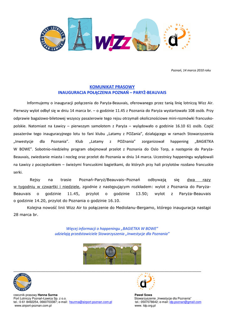 Poznań, 14 marca 2010 roku KOMUNIKAT PRASOWY INAUGURACJA POŁĄCZENIA POZNAŃ – PARYŻ-BEAUVAIS Informujemy o inauguracji połączenia do Paryża-Beauvais, oferowanego przez tanią linię lotniczą Wizz Air. Pierwszy wylot odbył się w dniu 14 marca br. – o godzinie 11.45 z Poznania do Paryża wystartowało 108 osób. Przy odprawie bagażowo-biletowej wszyscy pasażerowie tego rejsu otrzymali okolicznościowe mini-rozmówki francuskopolskie. Natomiast na Ławicy – pierwszym samolotem z Paryża – wylądowało o godzinie 16.10 61 osób. Część pasażerów tego inauguracyjnego lotu to fani klubu „Latamy z POZania”, działającego w ramach Stowarzyszenia „Inwestycje dla Poznania”. Klub „Latamy z POZnania” zorganizował happening „BAGIETKA W BOWE”. Sobotnio-niedzielny program obejmował przelot z Poznania do Oslo Torp, a następnie do ParyżaBeauvais, zwiedzanie miasta i nocleg oraz przelot do Poznania w dniu 14 marca. Uczestnicy happeningu wylądowali na Ławicy z poczęstunkiem – świeżymi francuskimi bagietkami, do których przy hali przylotów rozdano francuskie serki. Rejsy na trasie Poznań-Paryż/Beauvais–Poznań odbywają się dwa razy w tygodniu w czwartki i niedziele, zgodnie z następującym rozkładem: wylot z Poznania do ParyżaBeauvais o godzinie 11.45, przylot o godzinie 13.50; wylot z Paryża-Beauvais o godzinie 14.20, przylot do Poznania o godzinie 16.10. Kolejna nowość linii Wizz Air to połączenie do Mediolanu-Bergamo, którego inauguracja nastąpi 28 marca br. Więcej informacji o happeningu „BAGIETKA W BOWE” udzielają przedstawiciele Stowarzyszenia „Inwestycje dla Poznania” __________________________________________________________________________________ rzecznik prasowy Hanna Surma Port Lotniczy Poznań-Ławica Sp. z o.o. tel.: 0-61 8492254, 0660703387; e-mail: [email protected] www.airport-poznan.com.pl Paweł Sowa Stowarzyszenie „Inwestycje dla Poznania” tel.: 0507078642; e-mail: [email protected] www. Idp.org.pl