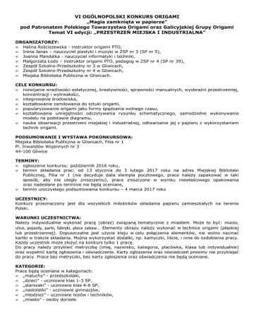 VI OGÓLNOPOLSKI KONKURS ORIGAMI „Magia zamknięta w papierze” pod Patronatem Polskiego Towarzystwa Origami oraz Galicyjskiej Grupy Origami Temat VI edycji: „PRZESTRZEŃ MIEJSKA I INDUSTRIALNA” ORGANIZATORZY: • Halina Rościszewska - instruktor origami PTO, • Irena Janas – nauczyciel plastyki i muzyki w ZSP nr 3 (SP nr 5), • Joanna Mandalka - nauczyciel informatyki i techniki, • Małgorzata Łodo – instruktor origami PTO, pedagog w ZSP nr 4 (SP nr 39), • Zespół Szkolno-Przedszkolny nr 3 w Gliwicach, • Zespół Szkolno-Przedszkolny nr 4 w Gliwicach, • Miejska Biblioteka Publiczna w Gliwicach. CELE KONKURSU: • rozwijanie wrażliwości estetycznej, kreatywności, sprawności manualnych, wyobraźni przestrzennej, koncentracji i wytrwałości, • integrowanie środowiska, • kształtowanie zamiłowania do sztuki origami, • popularyzowanie origami jako formy spędzania wolnego czasu, • kształtowanie umiejętności odczytywania rysunku schematycznego, samodzielne wykonywanie modelu na podstawie diagramu, • nauka obserwacji przestrzeni miejskiej i industrialnej, odtwarzanie jej z papieru z wykorzystaniem technik origami. PODSUMOWANIE I WYSTAWA POKONKURSOWA: Miejska Biblioteka Publiczna w Gliwicach, Filia nr 1 Pl. Inwalidów Wojennych nr 3 44-100 Gliwice TERMINY: • ogłoszenie konkursu: październik 2016 roku, • termin składania prac: od 13 stycznia do 3 lutego 2017 roku na adres Miejskiej Biblioteki Publicznej, Filia nr 1 (nie decyduje data stempla pocztowego, prace należy zapakować w taki sposób, aby nie uległy zniszczeniu), prace zniszczone w wyniku niewłaściwego opakowania oraz nadesłane po terminie nie będą oceniane, • termin uroczystego podsumowania konkursu – 4 marca 2017 roku UCZESTNICY: Konkurs przeznaczony jest dla wszystkich miłośników składania papieru zamieszkałych na terenie Polski. WARUNKI UCZESTNICTWA: Należy indywidualnie wykonać pracę (obraz) związaną tematycznie z miastem. Może to być: miasto, ulice, pojazdy, parki, fabryki, place zabaw... Elementy obrazu należy wykonać w technice origami (płaskiej lub przestrzennej). Dopuszczalne jest użycie kleju w celu połączenia elementów, nie wolno nacinać kartki w trakcie składania. Można wykorzystać dodatki, np. kamyczki, liście, i inne do ozdobienia pracy. Każdy uczestnik może złożyć na konkurs tylko 1 pracę. Do pracy należy przykleić metryczkę (imię, nazwisko, kategoria, placówka, klasa lub indywidualnie) oraz wypełnić kartę zgłoszenia i oświadczenie. Karty zgłoszenia oraz oświadczeń prosimy nie przyklejać do pracy. Prace bez metryczki, bez karty zgłoszenia oraz oświadczenia nie będą oceniane. KATEGORIE: Prace będą oceniane w kategoriach: • „maluchy” - przedszkolaki, • „dzieci” - uczniowie klas 1-3 SP, • „starszaki” - uczniowie klas 4-6 SP, • „nastolatki” - uczniowie gimnazjów, • „młodzież” - uczniowie liceów i techników, • „miasto” - osoby dorosłe. TECHNIKI SKŁADANIA: • kategorie "maluchy" i "dzieci" - wszystkie techniki • kategorie "starszaki", "nastolatki", "młodzież", "miasto" (nie dotyczy szkół specjalnych) - wszystkie techniki (np. klasyczna, wetfolding, modułowa, crumpling, tesselacje, itp.) za wyjątkiem techniki „składanie z kół i kwadratów” FORMAT I WIELKOŚĆ PRACY : Pracę (obraz) do powieszenia na ścianie należy wykonać na tekturze kwadratowej o boku 35 cm. Praca może zajmować całą powierzchnię lub jej część. Elementy (origami lub dodatki) mogą być przestrzenne, ale żadne nie mogą wystawać poza obszar pracy. JURY: W skład jury zasiądą przedstawiciele z Polskiego Towarzystwa Origami oraz nauczyciele prowadzący zajęcia origami, których podopieczni nie biorą udziału w konkursie. Skład jury zostanie podany w późniejszym terminie. KRYTERIA OCENY: Jury oceniać będzie zgodność pracy z tematem konkursu, kompozycję i estetykę pracy, oryginalność wykonania, trudność złożeń, dobór koloru i papieru. NAGRODY: Laureaci konkursu otrzymają nagrody rzeczowe i dyplomy. Lista nagrodzonych uczestników zamieszczona będzie na stronie internetowej http://www.konkurs.magia.origami.cmza.pl Najlepsze prace konkursowe zostaną wystawione na wystawie „W mieście” w Miejskiej Bibliotece Publicznej w Gliwicach, Filia nr 1 (od 4 do 31 marca 2017 roku) oraz w Zespole Szkolno-Przedszkolnym nr 3 i w Zespole Szkolno-Przedszkolnym nr 4 w Gliwicach. ZAKOŃCZENIE KONKURSU: Uroczyste podsumowanie konkursu, wręczenie nagród i dyplomów odbędzie się 4 marca 2017 roku w Miejskiej Bibliotece Publicznej w Gliwicach, Filia nr 1. Po podsumowaniu konkursu odbędą się warsztaty origami przeprowadzone przez instruktorów origami Halinę Rościszewską-Narloch oraz Małgorzatę Łodo. UWAGI: • kartę zgłoszenia zbiorczą wypełnia osoba lub jednostka zgłaszająca z załączeniem podpisanych przez opiekunów prawnych oświadczeń (według załączników), • informacje o konkursie oraz uaktualnienia będą zamieszczane systematycznie na stronach internetowych: http://www.konkurs.magia.origami.cmza.pl https://www.facebook.com/konkurs.magia.origami • organizatorzy nie zwracają nadesłanych prac, • administrowanie danych osobowych uczestników konkursu przez organizatora odbywać się będzie wyłącznie w celach związanych z konkursem (informacyjnych, promocyjnych, wystawienniczych, publikacje). Organizatorzy zastrzegają sobie prawo do publikowania danych osobowych uczestników biorących udział w konkursie (zawartych w Karcie Zgłoszenia za wyjątkiem adresów i telefonów), • zdjęcia prac konkursowych wraz z informacją o autorze pracy oraz zdjęcia z uroczystego podsumowania będą opublikowane w biuletynie pokonkursowym oraz na stronach internetowych podanych powyżej, • nagrody i dyplomy nieodebrane w ciągu miesiąca od dnia podsumowania konkursu przechodzą na własność organizatora (istnieje możliwość przesłania nagród poczt