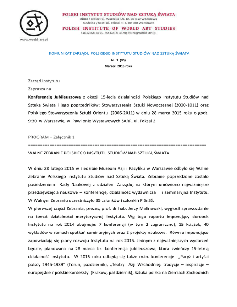 KOMUNIKAT ZARZĄDU POLSKIEGO INSTYTUTU STUDIÓW NAD SZTUKĄ ŚWIATA Nr 3 (30) Marzec 2015 roku Zarząd Instytutu Zaprasza na Konferencję Jubileuszową z okazji 15-lecia działalności Polskiego Instytutu Studiów nad Sztuką Świata i jego poprzedników: Stowarzyszenia Sztuki Nowoczesnej (2000-1011) oraz Polskiego Stowarzyszenia Sztuki Orientu (2006-2011) w dniu 28 marca 2015 roku o godz. 9:30 w Warszawie, w Pawilonie Wystawowych SARP, ul. Foksal 2 PROGRAM – Załącznik 1 =========================================================================== WALNE ZEBRANIE POLSKIEGO INSYTUTU STUDIÓW NAD SZTUKĄ ŚWIATA W dniu 28 lutego 2015 w siedzibie Muzeum Azji i Pacyfiku w Warszawie odbyło się Walne Zebranie Polskiego Instytutu Studiów nad Sztuką Świata. Zebranie poprzedzone zostało posiedzeniem Rady Naukowej z udziałem Zarządu, na którym omówiono najważniejsze przedsięwzięcia naukowe – konferencje, działalność wydawnicza i seminaryjna Instytutu. W Walnym Zebraniu uczestniczyło 35 członków i członkiń PISnSŚ. W pierwszej części Zebrania, prezes, prof. dr hab. Jerzy Malinowski, wygłosił sprawozdanie na temat działalności merytorycznej Instytutu. Wg tego raportu imponujący dorobek Instytutu na rok 2014 obejmuje: 7 konferencji (w tym 2 zagraniczne), 15 książek, 40 wykładów w ramach spotkań seminaryjnych oraz 2 projekty naukowe. Równie imponująco zapowiadają się plany rozwoju Instytutu na rok 2015. Jednym z najważniejszych wydarzeń będzie, planowana na 28 marca br. konferencja jubileuszowa, która zwieńczy 15-letnią działalność Instytutu. W 2015 roku odbędą się także m.in. konferencje „Paryż i artyści polscy 1945-1989” (Toruń, październik), „Teatry Azji Wschodniej: tradycje – inspiracje – europejskie / polskie konteksty (Kraków, październik), Sztuka polska na Ziemiach Zachodnich i Północnych 1945-1981” (Wrocław, listopad). W 2015 roku opublikowany zostanie tom „Bożnice drewniane” (wersja polska i angielska) - monumentalne dzieło Marii i Kazimierza Piechotków, a także „Historia sztuki polskiej” w języku chińskim w Szanghaju. Do innych, ważnych projektów, jakie będą realizowane w bieżącym roku należy digitalizacja wszystkich publikacji, jakie zostały wydane przez PISnSŚ w ciągu 15 lat jego działalności. Wszystkie te pozycje znajdą się na stronie internetowej Instytutu, a także będą dostępne szerokiej rzeszy czytelników w repozytoriach cyfrowych bibliotek polskich. Na zebraniu zostało przedstawione sprawozdanie Komisji Rewizyjnej. Zgłoszono i zatwierdzono 3 uchwały: - o przyjęciu uproszczonego sprawozdania finansowego - o powołaniu Oddziału Gdańskiego Instytutu - o członkostwie honorowym dla osób zasłużonych dla działalności Instytutu. Zebranie zwieńczył postulat Prezesa, aby podążając za sukcesami w pozyskiwaniu środków finansowych na konferencje i publikacje, nasi członkowie i członkinie zgłaszali także swoje propozycje grantów, które realizowane będą pod egidą Instytutu. Zamykając działalność Polskiego Instytutu Studiów nad Sztuką Świata na rok 2014 bardzo dobrym bilansem osiągnięć naukowych życzymy naszym Członkom i Członkiniom, aby rok 2015 był równie owocny i twórczy! Dr Małgorzata Stolarska-Fronia - sekretarz Zarządu PISnSŚ SPRAWOZDANIE ZA 2014 ROK – Załącznik 2 ================================================================================== Oddział Toruński zaprasza na: Spotkanie naukowe w dniu 11 marca (środa) godz. 17.00 , Wydział Sztuk Pięknych, s. 317, z wykładem: Małgorzaty Baka-Theis (Uniwersytet Mikołaja Kopernika; PISnSŚ), Współczesna sztuka afrykańska - zjawiska, kolekcje, rynek sztuki / Contemporary African arts phenomena, colecting and art market. ========================================================================== Załącznik 1 Konferencja Jubileuszowa z okazji 15-lecia działalności Polskiego Instytutu Studiów nad Sztuką Świata i jego poprzedników: Stowarzyszenia Sztuki Nowoczesnej (2000-1011) oraz Polskiego Stowarzyszenia Sztuki Orientu (2006-2011) w dniu 28 marca 2015 roku w Pawilonie Wystawowych SAPR, ul. Foksal 2 09:30-09:50 – Powitanie gości i uczestników Prof. Jerzy Malinowski, Otwarcie konferencji Dr Małgorzata Jankowska, O działalności Stowarzyszenia Sztuki Nowoczesnej Dr Joanna Wasilewska, Współpraca międzynarodowa Instytutu 09:50-10:20 część oficjalna AZJA I EUROPA POŁUDNIOWO-WSCHODNIA 10:20-10:35 Prof. Waldemar Deluga, dr Magdalena Łaptaś, Badania sztuki bizantyjskiej i kościołów wschodnio-chrześcijańskich, sztuki Ormian; rocznik „Series Byzantina” 10:35-10:50 Dr Beata Biedrońska-Słota, Badania sztuki islamu - Imperium Osmańskie, kraje arabskie 10:50-11:05 Prof.Swietłana Czerwonnaja, Badania sztuki islamu - Europa Wschodnia; sztuka Tatarów 11:05-11:20 Magdalena Ginter-Frołow, Karolina Krzywicka, Badania sztuki islamu - Iran i Azja Środkowa 11:20-11:30 Dr hab. Piotr Balcerowicz, Badania przed-islamskiej sztuki Pakistanu, Afganistanu i Azji Środkowej (zostanie odczytane) 11:30-11:40 Prof. Marzena Czerniak-Drożdżowicz, Badania architektury Indii i Azji PołudniowoWschodniej 11:40-12:00 Dr Dorota Kamińska-Jones i dr Agnieszka Staszczyk, Badania rzeźby i malarstwa Indii; rocznik „Art of the Orient” 12:00-12:10 Dr Izabela Kopania, Badania sztuki Azji Południowo-Wschodniej 12:10-12:20 Dr hab. Andrzej Rozwadowski, Badania sztuki Azji Północnej: ryty naskalne, sztuka a szamanizm 12:20-12:30 Dr Agnieszka Helman-Ważny, Badania sztuki Nepalu, Tybetu i Mongolii (zostanie odczytane) 12:30-12:40 Edward Kajdański, Badania kultury Chin 12:40-12:50 Dr Bogna Łakomska, Badania sztuki Chin; seria „Artistic Traditions of Non-European Culture” 12:50-13:10 Dr hab. Beata Kubiak Ho-chi, Badania sztuki japońskiej 13:10-13:25 Dr hab. Weronika Liszewska, Mirosława Wojtczak, Konserwacja i ochrona dzieł sztuki Azji; „Toruńskie Studia o sztuce Orientu” 13:25-13: