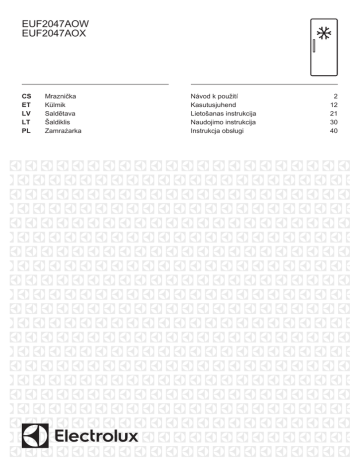 EUF2047AOW EUF2047AOX CS ET LV LT PL Mraznička Külmik Saldētava Šaldiklis Zamrażarka Návod k použití Kasutusjuhend Lietošanas instrukcija Naudojimo instrukcija Instrukcja obsługi 2 12 21 30 40 2 www.electrolux.com OBSAH 1. BEZPEČNOSTNÍ INFORMACE......................................................................... 3 2. BEZPEČNOSTNÍ POKYNY ...............................................................................4 3. OVLÁDACÍ PANEL.............................................................................................6 4. DENNÍ POUŽÍVÁNÍ............................................................................................ 7 5. ČIŠTĚNÍ A ÚDRŽBA.......................................................................................... 8 6. ODSTRAŇOVÁNÍ ZÁVAD.................................................................................. 9 7. INSTALACE......................................................................................................10 8. TECHNICKÉ ÚDAJE........................................................................................ 10 MYSLÍME NA VÁS Děkujeme, že jste si zakoupili spotřebič značky Electrolux. Vybrali jste si produkt, se kterým jsou spjaty desítky let profesionálních zkušeností a inovací. Tento důmyslný a stylový spotřebič byl navržen s ohledem na jeho uživatele. Kdykoliv jej proto používáte, můžete se spolehnout, že pokaždé dosáhnete skvělých výsledků. Vítá Vás Electrolux. Navštivte naše stránky ohledně: Rady ohledně používání, brožury, poradce při potížích, servisních informací: www.electrolux.com/webselfservice Registrace vašeho spotřebiče, kterou získáte lepší servis: www.registerelectrolux.com Nákupu příslušenství, spotřebního materiálu a originálních náhradních dílů pro váš spotřebič: www.electrolux.com/shop PÉČE O ZÁKAZNÍKY A SERVIS Doporučujeme používat originální náhradní díly. Při kontaktu se servisním střediskem se ujistěte, že máte k dispozici následující údaje: Model, výrobní číslo (PNC), sériové číslo. Tyto informace jsou uvedeny na typovém štítku. Upozornění / Důležité bezpečnostní informace Všeobecné informace a rady Poznámky k ochraně životního prostředí Zmĕny vyhrazeny. ČESKY 1. 3 BEZPEČNOSTNÍ INFORMACE Tento návod si pečlivě přečtěte ještě před instalací spotřebiče a jeho prvním použitím. Výrobce nenese odpovědnost za žádný úraz ani škodu v důsledku nesprávné instalace nebo použití. Návod k použití vždy uchovávejte na bezpečném a přístupném místě pro jeho budoucí použití. 1.1 Bezpečnost dětí a postižených osob • • • • Tento spotřebič smí používat děti starší osmi let nebo osoby se sníženými schopnostmi, pouze pokud tak činí pod dozorem nebo vedením, které zohledňuje bezpečný provoz spotřebiče, a pokud rozumí rizikům spojeným s provozem spotřebiče. Nenechte děti hrát si se spotřebičem. Čištění a uživatelskou údržbu spotřebiče by neměly provádět děti bez dozoru. Všechny obaly uschovejte z dosahu dětí a řádně je zlikvidujte. 1.2 Všeobecné bezpečnostní informace • • • • Tento spotřebič je určen pro použití v domácnosti a pro následující způsoby použití: – Ve farmářských domech, v kuchyňkách pro zaměstnance v obchodech, kancelářích a jiných pracovních prostředích – Pro zákazníky hotelů, motelů, penzionů a jiných ubytovacích zařízení Udržujte volně průchodné větrací otvory na povrchu spotřebiče nebo kolem vestavěného spotřebiče. K urychlení odmrazování nepoužívejte mechanické ani jiné pomocné prostředky, které nejsou doporučeny výrobcem. Nepoškozujte chladicí okruh. 4 www.electrolux.com • • • • • V prostoru chladicích spotřebičů nepoužívejte jiné elektrické přístroje, než typy schválené k tomuto účelu výrobcem. K čištění spotřebiče nepoužívejte proud vody nebo páru. Vyčistěte spotřebič vlhkým měkkým hadrem. Používejte pouze neutrální mycí prostředky. Nepoužívejte prostředky s drsnými částicemi, drátěnky, rozpouštědla nebo kovové předměty. V tomto spotřebiči neuchovávejte výbušné směsi, jako např. aerosolové spreje s hořlavým hnacím plynem. Jestliže je poškozený přívodní kabel, smí ho vyměnit pouze výrobce, autorizované servisní středisko nebo osoba s podobnou příslušnou kvalifikací, jinak by mohlo dojít k úrazu. 2. BEZPEČNOSTNÍ POKYNY 2.1 Instalace VAROVÁNÍ! Tento spotřebič smí instalovat jen kvalifikovaná osoba. • • • • • • • • • Odstraňte všechny obaly nebo přepravní šrouby. Poškozený spotřebič neinstalujte ani nepoužívejte. Řiďte se pokyny k instalaci dodanými spolu s tímto spotřebičem. Při přemisťování spotřebiče buďte vždy opatrní, protože je těžký. Vždy používejte ochranné rukavice a uzavřenou obuv. Přesvědčte se, že vzduch může okolo spotřebiče volně proudit. Počkejte alespoň čtyři hodiny, než spotřebič připojíte k napájení. Olej tak může natéct zpět do kompresoru. Neinstalujte spotřebič v blízkosti topidel, sporáků, trub či varných desek. Zadní stěna spotřebiče musí být umístěna směrem ke zdi. Neinstalujte spotřebič tam, kde by se dostal do přímého slunečního světla. • • Neinstalujte spotřebič v příliš vlhkých či příliš chladných místech, jako jsou přístavby, garáže či vinné sklepy. Při přemisťování spotřebiče jej nadzdvihněte za přední okraj, abyste zabránili poškrábání podlahy. 2.2 Připojení k elektrické síti VAROVÁNÍ! Hrozí nebezpečí požáru nebo úrazu elektrickým proudem. • • • • • Spotřebič musí být uzemněn. Zkontrolujte, zda údaje o napájení na typovém štítku souhlasí s parametry elektrické sítě. 