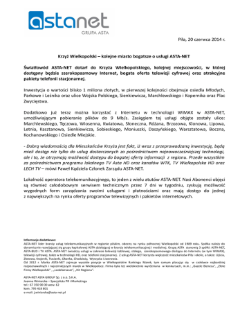 Piła, 20 czerwca 2014 r. Krzyż Wielkopolski – kolejne miasto bogatsze o usługi ASTA-NET Światłowód ASTA-NET dotarł do Krzyża Wielkopolskiego, kolejnej miejscowości, w której dostępny będzie szerokopasmowy Internet, bogata oferta telewizji cyfrowej oraz atrakcyjne pakiety telefonii stacjonarnej. Inwestycja o wartości blisko 1 miliona złotych, w pierwszej kolejności obejmuje osiedla Młodych, Parkowe i Leśnika oraz ulice Wojska Polskiego, Sienkiewicza, Marchlewskiego i Kopernika oraz Plac Zwycięstwa. Dodatkowo już teraz można korzystać z Internetu w technologii WiMAX w ASTA-NET, umożliwiającym pobieranie plików do 9 Mb/s. Zasięgiem tej usługi objęte zostały ulice: Marchlewskiego, Tęczowa, Wiosenna, Kwiatowa, Słoneczna, Różana, Brzozowa, Klonowa, Lipowa, Letnia, Kasztanowa, Sienkiewicza, Sobieskiego, Moniuszki, Daszyńskiego, Warsztatowa, Boczna, Kochanowskiego i Osiedle Miejskie. - Dobrą wiadomością dla Mieszkańców Krzyża jest fakt, iż wraz z przeprowadzaną inwestycję, będą mieli dostęp nie tylko do usług dostarczanych za pośrednictwem najnowocześniejszej technologi, ale i to, że otrzymają możliwość dostępu do bogatej oferty informacji z regionu. Przede wszystkim za pośrednictwem programu lokalnego TV Asta HD oraz kanałów WTK, TV Wielkopolska HD oraz LECH TV – mówi Paweł Kądziela Członek Zarządu ASTA-NET. Lokalność operatora telekomunikacyjnego, to jeden z wielu atutów ASTA-NET. Nasi Abonenci objęci są również całodobowym serwisem technicznym przez 7 dni w tygodniu, zyskują możliwość wygodnych form zarządzania swoimi usługami i płatnościami oraz mają dostęp do jednej z największych na rynku oferty programów telewizyjnych i pakietów internetowych. Informacje dodatkowe: ASTA-NET lider branży usług telekomunikacyjnych w regionie pilskim, obecny na rynku północnej Wielkopolski od 1989 roku. Spółka należy do dynamicznie rozwijającej się grupy kapitałowej ASTA działającej w branży telekomunikacyjnej i medialnej. Grupę ASTA stanowią 3 spółki: ASTA-NET, ASTA-BUD i TV ASTA. ASTA-NET świadczy usługi w zakresie telewizji kablowej, stałego, szerokopasmowego dostępu do Internetu (w tym WiMAX), telewizji cyfrowej, także w technologii HD, oraz telefonii stacjonarnej. Z usług ASTA-NET korzysta większość mieszkańców Piły i okolic, a także: Ujścia, Złotowa, Krajenki, Trzcianki, Okonka, Chodzieży, Wyrzyska i Jastrowia. Od 2012 r. Marka ASTA-NET zajmuje wysokie pozycje w Wielkopolskim Rankingu Marek, tym samym plasując się w czołówce najbardziej rozpoznawalnych i najcenniejszych marek w Wielkopolsce. Firma była też wielokrotnie wyróżniana w konkursach, m.in.: „Gazele Biznesu”, „Złote Firmy Wielkopolski” , „Lodołamacze”, „Hit Regionu”. ASTA-NET ASTA GROUP Sp. z o.o. S.K.A. Joanna Winiarska – Specjalista PR i Marketingu tel.: 67 350 90 00 wew. 62 kom. 795 418 801 e-mail: [email protected]