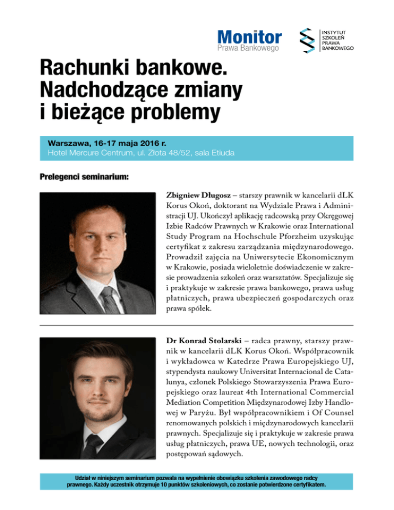 Rachunki bankowe. Nadchodzące zmiany i bieżące problemy Warszawa, 16-17 maja 2016 r. Hotel Mercure Centrum, ul. Złota 48/52, sala Etiuda Prelegenci seminarium: Zbigniew Długosz – starszy prawnik w kancelarii dLK Korus Okoń, doktorant na Wydziale Prawa i Administracji UJ. Ukończył aplikację radcowską przy Okręgowej Izbie Radców Prawnych w Krakowie oraz International Study Program na Hochschule Pforzheim uzyskując certyfikat z zakresu zarządzania międzynarodowego. Prowadził zajęcia na Uniwersytecie Ekonomicznym w Krakowie, posiada wieloletnie doświadczenie w zakresie prowadzenia szkoleń oraz warsztatów. Specjalizuje się i praktykuje w zakresie prawa bankowego, prawa usług płatniczych, prawa ubezpieczeń gospodarczych oraz prawa spółek. Dr Konrad Stolarski – radca prawny, starszy prawnik w kancelarii dLK Korus Okoń. Współpracownik i wykładowca w Katedrze Prawa Europejskiego UJ, stypendysta naukowy Universitat Internacional de Catalunya, członek Polskiego Stowarzyszenia Prawa Europejskiego oraz laureat 4th International Commercial Mediation Competition Międzynarodowej Izby Handlowej w Paryżu. Był współpracownikiem i Of Counsel renomowanych polskich i międzynarodowych kancelarii prawnych. Specjalizuje się i praktykuje w zakresie prawa usług płatniczych, prawa UE, nowych technologii, oraz postępowań sądowych. Udział w niniejszym seminarium pozwala na wypełnienie obowiązku szkolenia zawodowego radcy prawnego. Każdy uczestnik otrzymuje 10 punktów szkoleniowych, co zostanie potwierdzone certyfikatem. Dr Dominika Rogoń – doktor nauk prawnych, prowadzi Kancelarię Radcy Prawnego w Krakowie. Posiada kilkuletnie doświadczenie w bieżącej obsłudze banków, instytucji finansowych i innych podmiotów gospodarczych, a także w działalności dydaktycznej i szkoleniowej. Współpracownik naukowy Polsko-Niemieckiego Centrum Prawa Bankowego przy UJ, współautorka komentarza do ustawy o kredycie konsumenckim oraz do ustawy – Prawo bankowe. Cele seminarium: Celem seminarium jest podsumowanie bieżących problemów związanych z poszczególnymi rodzajami rachunków bankowych, w szczególności rachunków o charakterze oszczędnościowym. Zostaną omówione szczególne uregulowania Prawa bankowego i ustawy o spółdzielczych kasach oszczędnościowo-kredytowych przewidziane dla tego rodzaju rachunków, z uwzględnieniem zmian wchodzących w życie w 2016 r. W drugiej części seminarium przedmiotem dyskusji będą zmiany zasad postępowania z rachunkami bankowymi i rachunkami członków SKOK po śmierci posiadacza, jak również z tzw. rachunkami „uśpionymi”, wprowadzone przez ustawę z dnia 9.10.2015 r. o zmianie ustawy – Prawo bankowe oraz niektórych innych ustaw. Ponadto zostaną omówione obowiązki informacyjne banków i SKOK-ów wynikające z ww. ustawy. Drugiego dnia seminarium prelegenci będą się starali przygotować uczestników do praktycznego stosowania przepisów tzw. dyrektywy o rachunkach płatniczych (PAD) oraz przepisów stanowiących transpozycję tej dyrektywy do prawa polskiego (termin implementacji upływa 18 września 2016 r.). Przepisy PAD, nakładają na część dostawców usług płatniczych, w szczególności banki, nowe obowiązki w związku z prowadzeniem przez tych dostawców usług rachunku płatniczego dla konsumentów, m.in. w zakresie obowiązku prowadzenia tzw. rachunku podstawowego, transparentności opłat i wprowadzenia usługi przenoszenia rachunków płatniczych. Przepisy te mogą istotnie wpłynąć na sposób prowadzenia działalności na przez dostawców usług płatniczych i skutkować koniecznością podjęcia przez nich odpowiednich kroków w celu dostosowania prowadzonej przez siebie działalności do tych przepisów. Udział w niniejszym seminarium pozwala na wypełnienie obowiązku szkolenia zawodowego radcy prawnego. Każdy uczestnik otrzymuje 10 punktów szkoleniowych, co zostanie potwierdzone certyfikatem. Grupa docelowa: Banki: – członkowie zarządów – pracownicy departamentów produktowych – pracownicy departamentów prawnych – pracownicy departamentów operacyjnych – pracownicy departamentów IT – pracownicy departamentów compliance – pracownicy departamentów odpowiadających za obsługę klientów indywidualnych SKOK-i przedstawiciele organów nadzoru nad rynkiem finansowym przedstawiciele organów ochrony konsumentów dostawcy usług płatniczych Udział w niniejszym seminarium pozwala na wypełnienie obowiązku szkolenia zawodowego radcy prawnego. Każdy uczestnik otrzymuje 10 punktów szkoleniowych, co zostanie potwierdzone certyfikatem. PROGRAM Poniedziałek, 16 maja – Prowadzący: dr Dominika Rogoń 10.00 – 10.15 – Rejestracja uczestników 10.15 – 11.45 Kategorie rachunków bankowych a. Rodzaje rachunków bankowych według art. 49 p.b. b. Rodzaj rachunku a źródło wpływów na rachunek c. Rachunki bankowe a rachunki płatnicze – kwalifikacja rachunków i zastosowanie przepisów k.c., p.b., u.u.p. d. Powiązanie rachunku z kredytem Rachunki oszczędnościowe i związane z nimi przywileje a. Kwota wolna od egzekucji – obecna regulacja i zmiana od 8.09.2016 r. – maksymalna kwota zwolnienia – „niezależnie od liczby zawartych umów” – jednorazowość vs. odnawialność przywileju b. Dyspozycja wkładem na wypadek śmierci – forma dyspozycji – krąg uprawnionych i sposób ich wskazania – dyspozycja wkładem a zapis windykacyjny – nowe obowiązki informacyjne wobec posiadaczy rachunku i beneficjentów od 1.07.2016 r. c. Wypłaty po śmierci posiadacza rachunku 11.45 – 12.15 12.15 – 13.45 – Przerwa na kawę Rozwiązanie umowy rachunku bankowego osoby fizycznej; nowe zasady dotyczące „uśpionych” rachunków bankowych lub rachunków członków SKOK w świetle ustawy z dnia 9.10.2015 r. o zmianie ustawy – Prawo bankowe oraz niektórych innych ustaw (od 1.07.2016 r.) a. Regulacja art. 60 p.b. b. Rozwiązanie umowy rachunku z dniem 