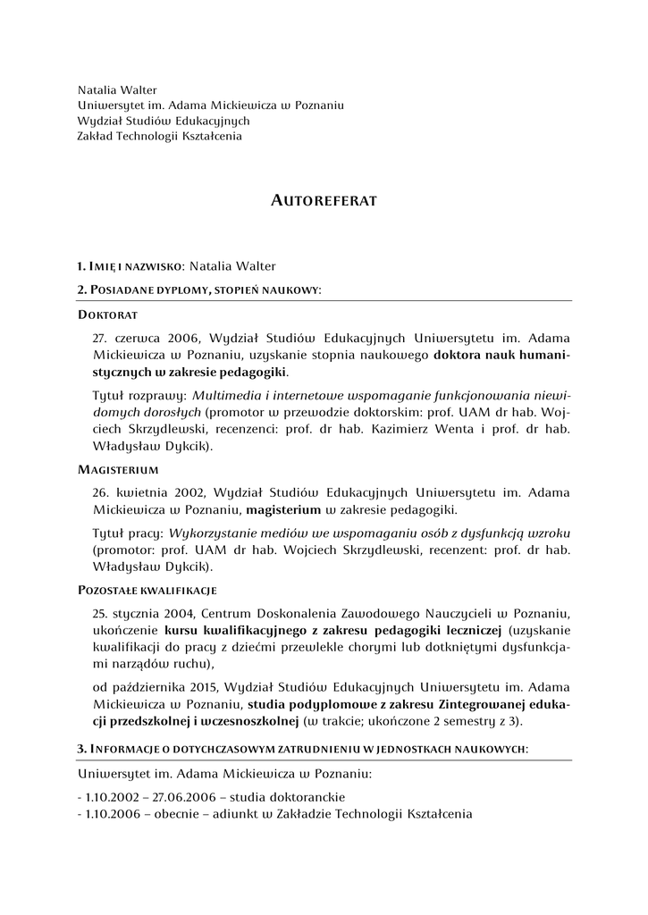 Natalia Walter Uniwersytet im. Adama Mickiewicza w Poznaniu Wydział Studiów Edukacyjnych Zakład Technologii Kształcenia AUTOREFERAT 1. IMIĘ I NAZWISKO: Natalia Walter 2. POSIADANE DYPLOMY, STOPIEŃ NAUKOWY: DOKTORAT 27. czerwca 2006, Wydział Studiów Edukacyjnych Uniwersytetu im. Adama Mickiewicza w Poznaniu, uzyskanie stopnia naukowego doktora nauk humanistycznych w zakresie pedagogiki. Tytuł rozprawy: Multimedia i internetowe wspomaganie funkcjonowania niewidomych dorosłych (promotor w przewodzie doktorskim: prof. UAM dr hab. Wojciech Skrzydlewski, recenzenci: prof. dr hab. Kazimierz Wenta i prof. dr hab. Władysław Dykcik). MAGISTERIUM 26. kwietnia 2002, Wydział Studiów Edukacyjnych Uniwersytetu im. Adama Mickiewicza w Poznaniu, magisterium w zakresie pedagogiki. Tytuł pracy: Wykorzystanie mediów we wspomaganiu osób z dysfunkcją wzroku (promotor: prof. UAM dr hab. Wojciech Skrzydlewski, recenzent: prof. dr hab. Władysław Dykcik). POZOSTAŁE KWALIFIKACJE 25. stycznia 2004, Centrum Doskonalenia Zawodowego Nauczycieli w Poznaniu, ukończenie kursu kwalifikacyjnego z zakresu pedagogiki leczniczej (uzyskanie kwalifikacji do pracy z dziećmi przewlekle chorymi lub dotkniętymi dysfunkcjami narządów ruchu), od października 2015, Wydział Studiów Edukacyjnych Uniwersytetu im. Adama Mickiewicza w Poznaniu, studia podyplomowe z zakresu Zintegrowanej edukacji przedszkolnej i wczesnoszkolnej (w trakcie; ukończone 2 semestry z 3). 3. INFORMACJE O DOTYCHCZASOWYM ZATRUDNIENIU W JEDNOSTKACH NAUKOWYCH: Uniwersytet im. Adama Mickiewicza w Poznaniu: - 1.10.2002 – 27.06.2006 – studia doktoranckie - 1.10.2006 – obecnie – adiunkt w Zakładzie Technologii Kształcenia Natalia Walter | A u t o r e f e r a t 4. OSIĄGNIĘCIE WYNIKAJĄCE Z ART. 16 UST. 2 USTAWY Z DNIA 14 MARCA 2003 R. O STOPNIACH NAUKOWYCH I TYTULE NAUKOWYM ORAZ O STOPNIACH I TYTULE W ZAKRESIE SZTUKI (Dz. U. nr 65, poz. 595 ze zm.): Monografia: Natalia Walter (2016), INTERNETOWE WSPARCIE SPOŁECZNE. STUDIUM SOCJOPEDAGOGICZNE, Wydawnictwo Naukowe Uniwersytetu im. Adama Mickiewicza, Poznań, ISBN 978-83-232-3046-5, s. 237 (recenzent wydawniczy: prof. dr hab. Anna Nowak, UŚ). OMÓWIENIE CELU NAUKOWEGO WW. PRACY I OSIĄGNIĘTYCH WYNIKÓW WRAZ Z OMÓWIENIEM ICH EWENTUALNEGO WYKORZYSTANIA: Nowe media to, z jednej strony, narzędzia funkcjonowania. W przypadku wielu osób z niepełnosprawnościami mogą stać się jedyną szansą na dostęp do informacji, komunikowanie, uczenie się, pracę oraz życie społeczne. Z drugiej strony – to przestrzeń, w której zachodzą interakcje społeczne mogące wpływać na radzenie sobie w przypadku wystąpienia wydarzenia krytycznego, zarówno o charakterze normatywnym (rozwojowym), jak i traumatycznym. Ze stresem wywołanym przez wydarzenia krytyczne, zarówno rozwojowe, jak i sytuacyjne, ludzie radzą sobie w różny sposób, między innymi korzystając z określonych zasobów. Według R. S. Lazarusa i S. Folkman (1984) należą do nich zasoby fizyczne (takie jak zdrowie i energia), psychologiczne (pozytywne przekonania), a także kompetencje w zakresie rozwiązywania problemów oraz, co dla mnie szczególnie interesujące, społeczne (w tym wsparcie społeczne). Wsparcie społeczne, które pojawia się jako pomoc człowiekowi znajdującemu się w sytuacji trudnej, stanowi kategorię zarówno psychologiczną, jak i bliską mi – pedagogiczną. Jako pedagog medialny od wielu lat zastanawiam się i badam, czy technologie informacyjno-komunikacyjne, zwłaszcza nowe, stanowią przestrzeń funkcjonowania człowieka w ujęciu humanistycznym oraz poznawczym. Czy we wszechobecnym środowisku cyfrowym istnieje miejsce dla człowieka, który pragnie się rozwijać, stawać się lepszym, dla którego, obok wartości dionizyjskich, ważne są też prometejskie? (por. J. Kozielecki, 2000). Przez wiele lat aktywnie działałam na rzecz osób z rozmaitymi niepełnosprawnościami. Szczególną rolę w mojej pracy naukowej odegrała współpraca ze Wspólnotą Burego Misia, skupiającą osoby z niepełnosprawnością intelektualną i fizyczną. Prowadziłam także badania nad wykorzystaniem technologii informacyjno-komunikacyjnych przez osoby z dysfunkcją wzroku. Jako nauczyciel, przez kilka lat zapoznawałam dzieci zmagające się z niepełnosprawnością sprzężoną z możliwościami komputera i Internetu. Byłam świadkiem pokonywania trudności, rozwijania możliwości i przełamywania barier. Jednocześnie obserwowałam osoby, które znalazły się w nowej, trudnej, nierzadko traumatycznej sytuacji, i dla których Internet stał się narzędziem radzenia sobie i pokonywania trudności. Ponadto, ba2|S t r o n a Natalia Walter | A u t o r e f e r a t dając interakcje zachodzące w sieci oraz postawy internautów, dostrzegłam, oprócz zachowań, które za E. Frommem (1999) można określić jako nieproduktywne, działania altruistyczne i pomocowe. Zainteresowały mnie one i zainspirowały do dalszych badań i poszukiwań. Uświadomiłam sobie, że kultura Internetu, którą w powszechnym odczuciu kojarzymy głównie z postawami narcystycznymi, wrogością, wulgarnością i ogólnym chaosem, wywodzi się z akademickiej tradycji wspólnego uprawiania nauki (M. Castells, 2003). Również kultura daru leży u podstaw powstania Internetu. Pierwsze protokoły i ich implementacje, które wykorzystywano w ARPAnecie, były otwarte i dostępne za darmo. Podobnie było z pierwotnymi systemami operacyjnymi, programami oraz aplikacjami internetowymi. Ta otwartość i dostępność kodu źródłowego stała się kluczowa w rozwoju Internetu. Jej istotą jest technomerytokracja, czyli wiara w dobro leżące u podstaw postępu naukowo-technicznego (M. Castells, 2003). Altruizm jest zatem wpisany w istotę funkcjonowania Internetu. Kluczowym pojęciem dla moich rozważań uczyniłam internetowe wsparcie społeczne. Definiuję je w monografii jako pomoc dostępną online dla jednostki znajdującej się w 
