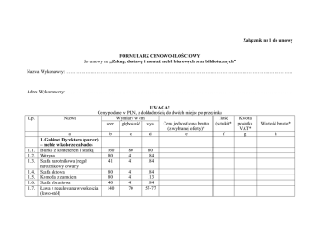 Załącznik nr 1 do umowy FORMULARZ CENOWO-ILOŚCIOWY do umowy na „Zakup, dostawę i montaż mebli biurowych oraz bibliotecznych” Nazwa Wykonawcy: ………………………………………………………………………………………………………………………………….. Adres Wykonawczy: ………………………………………………………………………………………………………………………………….. Lp. 1.1. 1.2. 1.3. 1.4. 1.5. 1.6. 1.7. UWAGA! Ceny podane w PLN, z dokładnością do dwóch miejsc po przecinku Nazwa Ilość Wymiary w cm Cena jednostkowa brutto (sztuki)* szer. głębokość wys. (z wybranej oferty)* a b c d e f 1. Gabinet Dyrektora (parter) – meble w kolorze calvados Biurko z kontenerem i szafką 160 80 80 Witryna 80 41 184 Szafa narożnikowa (regał 41 41 184 narożnikowy otwarty Szafa aktowa 80 41 184 Komoda z zamkiem 80 41 113 Szafa ubraniowa 40 41 184 Ława z regulowaną wysokością 140 70 57-77 (ławo-stół) Kwota podatku VAT* g Wartość brutto* h 1.8. Krzesło drewniane z podłokietnikami 1.9. Krzesło obrotowe z podłokietnikami drewnianymi, 1.10. Szafka gospodarcza z szufladą 2. Hall (parter) – meble w kolorze buk jasny 2.1. Szafa z gablotą wystawową 2.2. Szafa wbudowana z drzwiami 3. Oddział dziecięcy (parter) – meble w kolorze olchy 3.1. Regał 3.2. Regał 6 półkowy 3.3. J.w. lecz z drzwiami 3.4. Szafka katalogowa – 30 szuflad 3.5. Lada biblioteczna z kontenerem na karty biblioteczne 3.6. Krzesło obrotowe z podłokietnikami 4. Pom. księgowości (parter)– meble w kolorze olchy 4.1. Szafa aktowa 4.2. Szafa ubraniowa 4.3. Szafka gospodarcza z szufladą 4.4. Sejf do mocowania w szafie 4.5. Krzesło obrotowe z podłokietnikami 5. Pracownia plastyczna (parter) – meble w kolorze olchy 80 41 80,5 90 129 40 60 266 266 90 90 90 90 30 30 30 42 150 165 165 140 250 80 120 80 40 80 32 41 41 41 40 184 184 80,5 30 5.1. 6.1. 6.2. 6.3. 6.4. 6.5. 6.6. 6.7. 7.1. 7.2. 7.3. 8.1. 8.2. Stół prostokątny 6. Pom. gromadzenia (parter) – meble w kolorze olchy Szafa aktowa Regał otwarty 5 poziomowy Regał narożny 5 poziomowy Szafa ubraniowa Szafka katalogowa Szafka gospodarcza z szufladą Krzesło obrotowe z podłokietnikami 7. Hall/cafe (pietro) – meble w kolorze olchy Szafa garderobiana wbudowana 4 drzwiowa+boksy 33x32 – 10 szt. wymiar całkowity 200x45; 50x160, środkiem naklejone lustro Sofa – obicie w kolorze niebieskim Stolik drewniany – wypełnienie blatu stolika w kolorze obicia sof, a obramowanie i nogi w kolorze 8. Pokój biurowy (piętro) Biurko z czterema szufladami i szafką (szafka i szuflada górna zamykana na klucz Regał wiszący otwarty (nad stanowisko komputerowe) 160 80 73,5 80 80 41 41 40 80 80 41 41 41 184 184 184 184 80 80,5 146 79 62 160 70 76 80 37,5 42 8.3. 8.4. 8.5. 8.6. 8.7. 8.8. 9.1. 9.2. 9.3. 9.4. 9.5. 9.6. 10.1. 10.2. 10.3. 10.4. 10.5. 10.6. Szafka ubraniowa Szafo-regał (4 półki) Szafka na ksero Szafka gospodarcza z szufladą Szafka wisząca Krzesło obrotowe z podłokietnikami 9. Czytelnia (piętro) – meble w kolorze olchy Regał 7 półkowy - otwarty Regał 6 półkowy - otwarty Regał na czasopisma Krzesło drewniane z siedziskiem tapicerowanym i podłokietnikami Stanowisko przegląd ze ścianą boczną i tylną wys. 45 cm Krzesło obrotowe z podłokietnikami 10. Wypożyczalnia (piętro) – meble w kolorze olchy Szafa katalogowa – 30 szuflad Regał 7 półkowy z zapinkami stabilizującymi Regał 6 półkowy z zapinkami stabilizującymi Lada biblioteczna dwuosobowa Wózek jezdny na książki 2poziomowy Drabinka 3-poziomowa 40 80 60 80 80 41 41 60 41 37,5 184 184 60 80,5 42 90 90 120 25 25 40 230 215 160 100 60 73 90 90 42 30 140 230 90 25 215 80 40 78 10.7. Krzesło obrotowe z podłokietnikami RAZEM suma pozycji od 1 do 56 * wartości i ilości zostaną uzupełnione przez Zamawiającego po wyborze oferty ZAMAWIJĄCY: WYKONAWCA: