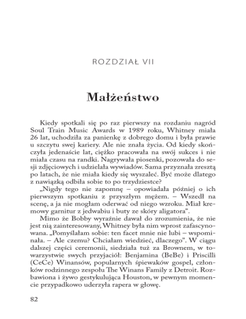 R o zdz i a ł V II Małżeństwo Kiedy spotkali się po raz pierwszy na rozdaniu nagród Soul Train Music Awards w 1989 roku, Whitney miała 26 lat, uchodziła za panienkę z dobrego domu i była prawie u szczytu swej kariery. Ale nie znała życia. Od kiedy skończyła jedenaście lat, ciężko pracowała na swój sukces i nie miała czasu na randki. Nagrywała piosenki, pozowała do sesji zdjęciowych i udzielała wywiadów. Sama przyznała zresztą po latach, że nie miała kiedy się wyszaleć. Być może dlatego z nawiązką odbiła sobie to po trzydziestce? „Nigdy tego nie zapomnę – opowiadała później o ich pierwszym spotkaniu z przyszłym mężem. – Wszedł na scenę, a ja nie mogłam oderwać od niego wzroku. Miał kremowy garnitur z jedwabiu i buty ze skóry aligatora”. Mimo że Bobby wyraźnie dawał do zrozumienia, że nie jest nią zainteresowany, Whitney była nim wprost zafascynowana. „Pomyślałam sobie: ten facet mnie nie lubi – wspominała. – Ale czemu? Chciałam wiedzieć, dlaczego”. W ciągu dalszej części ceremonii, siedziała tuż za Brownem, w towarzystwie swych przyjaciół: Benjamina (BeBe) i Priscilli (CeCe) Winansów, popularnych śpiewaków gospel, członków rodzinnego zespołu The Winans Family z Detroit. Rozbawiona i żywo gestykulująca Houston, w pewnym momencie przypadkowo uderzyła rapera w głowę. 82 – Przepraszam – powiedziała zawstydzona. Odwrócił się i zmierzył ją lodowatym wzrokiem. – Nie rób tego nigdy więcej – rzucił z wściekłością. Kolejna okazja do spotkania Browna trafiła się cztery miesiące później, na przyjęciu zorganizowanym przez CeCe Winans po koncercie jej zespołu. Wśród zaproszonych gości pojawił się również Bobby. Przez cały czas Whitney zerkała na niego dyskretnie, ale on nie zwracał na nią uwagi. Tak jej się przynajmniej wydawało, aż do momentu, kiedy pod koniec przyjęcia podszedł niespodziewanie i nieoczekiwanie zapytał: – Jeżeli cię poproszę, żebyś poszła ze mną, to pójdziesz? Przypuszczalnie istniała jakaś szybka i mądra odpowiedź, ale niestety jej nie znała, więc odparła tylko: – Pójdę. Poszli więc razem na kolację, zjedli, wypili i porozmawiali. I na tym się skończyło. Przynajmniej tym razem. „Co jest grane?” – myślała potem Whitney, nie będąc do końca pewną prawdziwych intencji Bobby’ego. Wkrótce to samo pytanie zaczęło sobie zadawać pół Ameryki. *** 8 stycznia 1990 roku Whitney pojechała na zakontraktowany przez Davisa koncert do Jokohamy. Mimo malowniczej scenerii, z licznymi zabytkowymi świątyniami oraz z przepięknymi, egzotycznymi parkami, miasto nie przypadło jej do gustu. Szczególnie, kiedy potężne trzęsienie ziemi o sile 6,1 stopnia w skali Richtera wyrzuciło ją o wpół do szóstej rano z hotelowego łóżka, napędzając sporo strachu. W maju została zaproszona przez kanał telewizyjny CBS do wzięcia udziału w – cieszącym się wielką oglądalnością – programie „That’s What Friends Are For”, w którym wystąpiły również gwiazdy tej miary, co Lauren Bacall, Chevy Chase i Whoopi Goldberg. Przez cały czas spotykała się na przemian z Bobby’m Brownem i z Eddiem Murphym, coraz częściej jednak 83 z tym pierwszym, coraz rzadziej z drugim. W końcu zdegustowany tym wszystkim Murphy, dodatkowo jeszcze zdenerwowany z powodu rozsiewanych przez prasę plotek o rzekomym związku Whitney z quarterbackiem* Philadelphia Eagles, Randallem Cunninghamem, poprosił ją o oddanie diamentowego pierścionka zaręczynowego, który wręczył jej kilka miesięcy wcześniej. W marcu 1993 roku Eddie poślubił w New York City’s Plaza Hotel Nicolle Mitchel. Bobby Brown i Whitney Houston znaleźli się pomiędzy zaproszonymi gośćmi. Poza tym Whitney doglądała budowy swego domu w Medham Township, w którym montowano właśnie wielkie okna i fontannę w holu. Ogromny livingroom został wyposażony w masywną kanapę na kółkach i potężny, purpurowy stół z grubym, szklanym blatem. W licznych pokojach wszystko sterowane było za pomocą pilota, od świateł do zasłon. Zamontowano nawet specjalny przenośnik łączący kuchnię z jadalnią. W listopadzie – jak już wcześniej wspomniano – pojawił się jej trzeci album, I’m Your Baby Tonight. W marcu 1991 roku Bobby Brown poprosił ją o rękę. Zrobił to dokładnie w swoim stylu, rzucając przy jakiejś okazji mimochodem: – Wyjdziesz za mnie? – Zapomnij o tym – odpowiedziała wtedy. – Mam inne plany. Mimo tej odmowy, grzeczna dziewczynka z dobrego domu wciąż pragnęła jednak mocniejszych wrażeń. Popularny raper fascynował ją i nie dawała sobie wytłumaczyć, że to nie jest odpowiedni partner dla niej. Po latach katorżniczego wysiłku i podporządkowania całego życia karierze, młodość zaczynała dopominać się o swoje prawa. *** * Quarterback (rozgrywający) – pozycja zawodnika w futbolu amerykańskim. Zawodnik ten należy do formacji ataku, a jego zadaniem jest rozegranie piłki. 84 Sytuację komplikowała jeszcze stała obecność u jej boku Robyn Crawford, która dostarczała plotkarskiej prasie wciąż nowych materiałów na temat łączącej je rzekomo lesbijskiej miłości*. W tym też mniej więcej czasie pojawiła się wiadomość, że Kim Ward jest w ciąży z Bobbym. O tym, że nie były to plotki, wszyscy przekonali się już kilka miesięcy później, kiedy Kim wydała na świat Bobby’ego Juniora. Pod koniec kwietnia prasa i telewizja skupiły się jednak na innym wydarzeniu, do którego doszło po koncercie Houston w Lexington, w stanie Kentucky. Mieszkająca w Radisson Plaza Hotel Whitney, poszła w towarzystwie swojego brata Michaela, Robyn Crawford i brytyjskiego ochroniarza, Davida Jonesa, do restauracji, gdzie stała się obiektem „adoracji” kilku podpitych mężczyzn, dość nachalnie starających się zaprosić ją do swego stolika. Kiedy grzecznie odmówiła, stali się oni jeszcze bar
