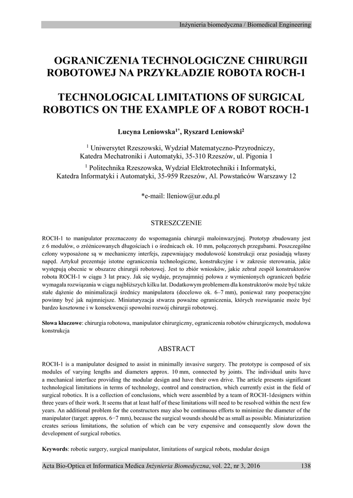 ograniczenia technologiczne chirurgii robotowej na przykładzie