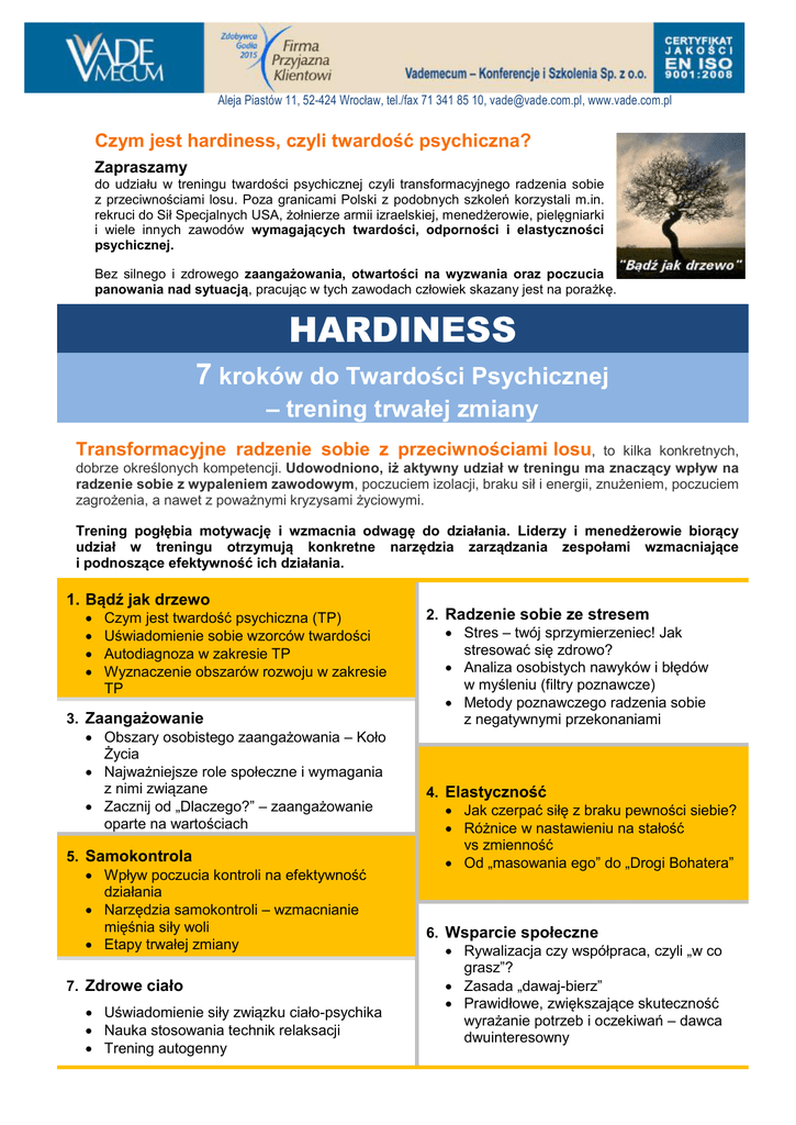 Aleja Piastów 11, 52-424 Wrocław, tel./fax 71 341 85 10, [email protected], www.vade.com.pl Czym jest hardiness, czyli twardość psychiczna? Zapraszamy do udziału w treningu twardości psychicznej czyli transformacyjnego radzenia sobie z przeciwnościami losu. Poza granicami Polski z podobnych szkoleń korzystali m.in. rekruci do Sił Specjalnych USA, żołnierze armii izraelskiej, menedżerowie, pielęgniarki i wiele innych zawodów wymagających twardości, odporności i elastyczności psychicznej. Bez silnego i zdrowego zaangażowania, otwartości na wyzwania oraz poczucia panowania nad sytuacją, pracując w tych zawodach człowiek skazany jest na porażkę. HARDINESS 7 kroków do Twardości Psychicznej – trening trwałej zmiany Transformacyjne radzenie sobie z przeciwnościami losu, to kilka konkretnych, dobrze określonych kompetencji. Udowodniono, iż aktywny udział w treningu ma znaczący wpływ na radzenie sobie z wypaleniem zawodowym, poczuciem izolacji, braku sił i energii, znużeniem, poczuciem zagrożenia, a nawet z poważnymi kryzysami życiowymi. Trening pogłębia motywację i wzmacnia odwagę do działania. Liderzy i menedżerowie biorący udział w treningu otrzymują konkretne narzędzia zarządzania zespołami wzmacniające i podnoszące efektywność ich działania. 1. Bądź jak drzewo Czym jest twardość psychiczna (TP) Uświadomienie sobie wzorców twardości Autodiagnoza w zakresie TP Wyznaczenie obszarów rozwoju w zakresie TP 3. Zaangażowanie Obszary osobistego zaangażowania – Koło Życia Najważniejsze role społeczne i wymagania z nimi związane Zacznij od „Dlaczego?” – zaangażowanie oparte na wartościach 5. Samokontrola Wpływ poczucia kontroli na efektywność działania Narzędzia samokontroli – wzmacnianie mięśnia siły woli Etapy trwałej zmiany 7. Zdrowe ciało Uświadomienie siły związku ciało-psychika Nauka stosowania technik relaksacji Trening autogenny 2. Radzenie sobie ze stresem Stres – twój sprzymierzeniec! Jak stresować się zdrowo? Analiza osobistych nawyków i błędów w myśleniu (filtry poznawcze) Metody poznawczego radzenia sobie z negatywnymi przekonaniami 4. Elastyczność Jak czerpać siłę z braku pewności siebie? Różnice w nastawieniu na stałość vs zmienność Od „masowania ego” do „Drogi Bohatera” 6. Wsparcie społeczne Rywalizacja czy współpraca, czyli „w co grasz”? Zasada „dawaj-bierz” Prawidłowe, zwiększające skuteczność wyrażanie potrzeb i oczekiwań – dawca dwuinteresowny Marzena Jankowska − trener biznesu, nauczyciel akademicki, coach, specjalista HRM. Absolwentka psychologii biznesu na Uniwersytecie Śląskim, a także studiów podyplomowych z zakresu zarządzania projektami (Wyższa Szkoła Bankowa). Ukończyła Szkołę Trenerów METRUM w Katowicach, Kurs Mediacji w Polskim Centrum Mediacji oraz Szkołę Coachingu Menedżerskiego (Moderator). Od ponad 8 lat prowadzi cieszące się dużym uznaniem szkolenia dla biznesu, administracji i organizacji pozarządowych, a także szkolenia train the trainers ze szczególnym uwzględnieniem metod i narzędzi trenerskich bazujących na neurodydaktyce. Od 2007 r. jest wykładowca/trenerem Wyższej Szkoły Bankowej w Poznaniu, WZ Chorzów prowadzenie zajęć dla studentów studiów podyplomowych (MBA we współpracy z Franklin University, Akademia trenera, Negocjacje i mediacje w biznesie, Administracja – zarządzanie i administracja, BHP, Akademia skutecznego menedżera, Komunikacja i wystąpienia publiczne). Specjalizuje się w tematyce twardości psychicznej (psychological hardiness) − prowadzi badania i warsztaty. Jest autorką szeregu artykułów na ten temat, m.in. „Twardość psychiczna a postrzeganie sytuacji pracy i życia rodzinnego przez menedżerów w kontekście kryzysu organizacji”, „Hardiness jako narzędzie wspomagające radzenie sobie w sytuacji kryzysowej” – przegląd badań”, „Twórczość jako proces samokreacji, wzmacniający twardość psychiczną w obliczu zmian”. Współautorka poradnika dotyczącego m.in. wzmacniania twardości psychicznej, pt. „Automotywacja. Odkryj w sobie siłę do działania” (wydawnictwo Edgard). Co Gdzie Kiedy Finanse HARDINESS - 7 kroków do Twardości Psychicznej – trening trwałej zmiany Spółka Vademecum posiada certyfikaty: POZNAŃ, Hotel GROMADA ul. Babimojska 7. Dojazd z Dworca PKP tramwajem nr 6,13. 20—21 kwietnia 2017 r. Zajęcia w godzinach 09:00 – 16:15. Koszt uczestnictwa jednej osoby: 998 zł netto za 2-dniowy warsztat praktyczny. Do powyższej ceny należy doliczyć 23 % VAT. W cenie uwzględniono koszty: 16 godzin warsztatów – ćwiczenia i praktyczne zadania, poradnik dotyczący m.in. wzmacniania twardości psychicznej, pt. „Automotywacja. Odkryj w sobie siłę do działania” współautorstwa trenerki prowadzącej zajęcia, serwis kawowy, lunch. System Zarządzania Jakością ISO 9001:2008 Informacja dodatkowa: koszt noclegu w hotelu GROMADA w pok. 1-os. ze śniadaniem wynosi 150 zł netto. Płatność Bank Ochrony Środowiska S.A. O/Wrocław 89 1540 1030 2001 7753 1706 0002 z podaniem numeru 2017/04/038 Zgłoszenia Zgłoszenia przyjmujemy e’mailem, faksem lub telefonicznie: Vademecum – Konferencje i Szkolenia Sp. z o.o., Aleja Piastów 11, 52-424 Wrocław, tel./fax: (071) 341 85 10, e-mail: [email protected] Pisemne potwierdzenie realizacji szkolenia prześlemy faksem lub e'mailem do Działu Szkoleń 7 dni przed datą rozpoczęcia zajęć Znak jakości MSUES nr 86/2014 Vademecum Sp. z o.o., Aleja Piastów 11, 52-424 Wrocław, tel./fax: 71 341 85 10, e-mail: [email protected] ZGŁOSZENIE na szkolenie 2017/04/038 – POZNAŃ, 20–21 kwietnia 2017 r. HARDINESS - 7 kroków do Twardości Psychicznej – trening trwałej zmiany ZGŁASZAJĄCY Pełna nazwa firmy .................................................................................................................................................... ...............