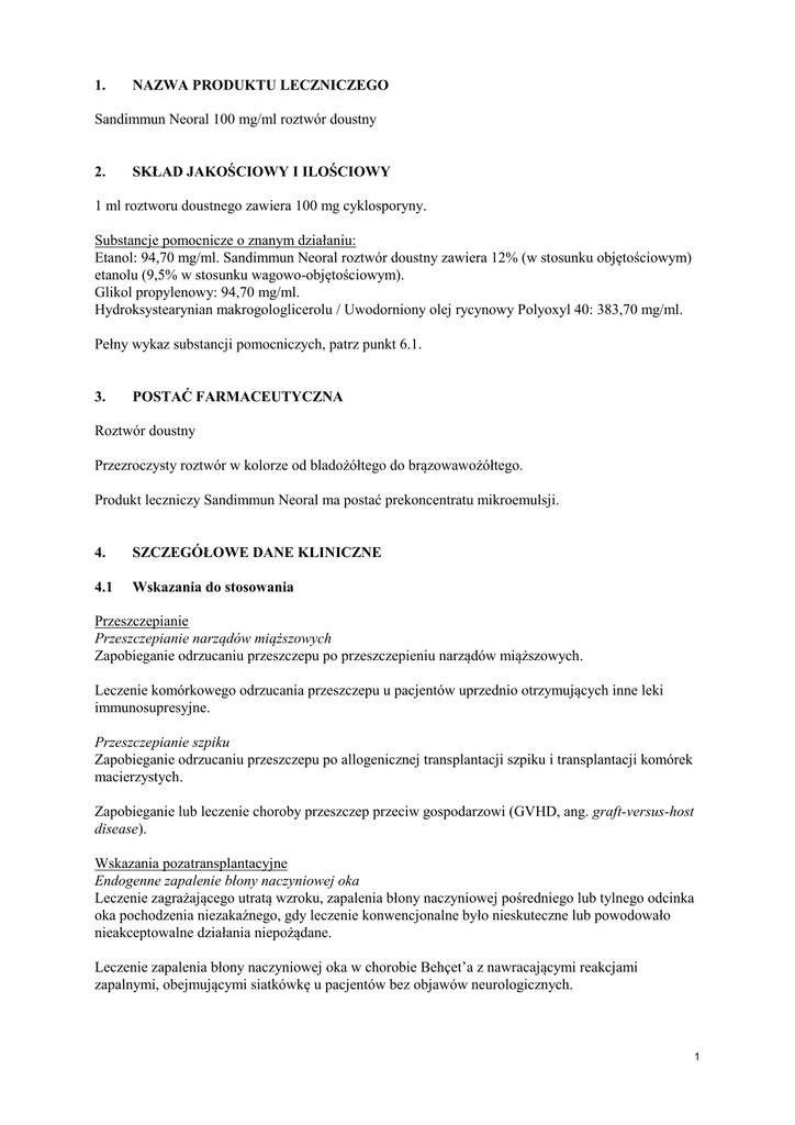 1. NAZWA PRODUKTU LECZNICZEGO Sandimmun Neoral 100 mg/ml roztwór doustny 2. SKŁAD JAKOŚCIOWY I ILOŚCIOWY 1 ml roztworu doustnego zawiera 100 mg cyklosporyny. Substancje pomocnicze o znanym działaniu: Etanol: 94,70 mg/ml. Sandimmun Neoral roztwór doustny zawiera 12% (w stosunku objętościowym) etanolu (9,5% w stosunku wagowo-objętościowym). Glikol propylenowy: 94,70 mg/ml. Hydroksystearynian makrogologlicerolu / Uwodorniony olej rycynowy Polyoxyl 40: 383,70 mg/ml. Pełny wykaz substancji pomocniczych, patrz punkt 6.1. 3. POSTAĆ FARMACEUTYCZNA Roztwór doustny Przezroczysty roztwór w kolorze od bladożółtego do brązowawożółtego. Produkt leczniczy Sandimmun Neoral ma postać prekoncentratu mikroemulsji. 4. SZCZEGÓŁOWE DANE KLINICZNE 4.1 Wskazania do stosowania Przeszczepianie Przeszczepianie narządów miąższowych Zapobieganie odrzucaniu przeszczepu po przeszczepieniu narządów miąższowych. Leczenie komórkowego odrzucania przeszczepu u pacjentów uprzednio otrzymujących inne leki immunosupresyjne. Przeszczepianie szpiku Zapobieganie odrzucaniu przeszczepu po allogenicznej transplantacji szpiku i transplantacji komórek macierzystych. Zapobieganie lub leczenie choroby przeszczep przeciw gospodarzowi (GVHD, ang. graft-versus-host disease). Wskazania pozatransplantacyjne Endogenne zapalenie błony naczyniowej oka Leczenie zagrażającego utratą wzroku, zapalenia błony naczyniowej pośredniego lub tylnego odcinka oka pochodzenia niezakaźnego, gdy leczenie konwencjonalne było nieskuteczne lub powodowało nieakceptowalne działania niepożądane. Leczenie zapalenia błony naczyniowej oka w chorobie Behçet’a z nawracającymi reakcjami zapalnymi, obejmującymi siatkówkę u pacjentów bez objawów neurologicznych. 1 Zespół nerczycowy Steroidozależny i steroidooporny zespół nerczycowy, wywołany przez pierwotne choroby kłębuszków nerkowych, takie jak nefropatie z minimalnymi zmianami, ogniskowe i segmentowe stwardnienie kłębuszków lub błoniaste zapalenie kłębuszków nerkowych. Produkt leczniczy Sandimmun Neoral może być stosowany do wywołania remisji i jej utrzymania. Może też być użyty do podtrzymania remisji wywołanej steroidami, co pozwala na odstawienie steroidów. Reumatoidalne zapalenie stawów Leczenie ciężkiego, czynnego reumatoidalnego zapalenia stawów. Łuszczyca Leczenie ciężkiej łuszczycy u pacjentów, u których konwencjonalne leczenie jest nieskuteczne lub niewskazane. Atopowe zapalenie skóry Produkt leczniczy Sandimmun Neoral jest wskazany u pacjentów z ciężkim atopowym zapaleniem skóry, u których konieczne jest leczenie ogólne. 4.2 Dawkowanie i sposób podawania Dawkowanie Podane zakresy dawek dla podania doustnego mają służyć wyłącznie jako wskazówki. Dobowe dawki produktu leczniczego Sandimmun Neoral należy podawać w dwóch dawkach podzielonych, rozłożonych w równych odstępach w ciągu doby. Zaleca się, by produkt leczniczy Sandimmun Neoral był przyjmowany według stałego planu w odniesieniu do pory dnia i posiłków. Produkt leczniczy Sandimmun Neoral może być przepisywany wyłącznie przez lub w ścisłej współpracy z lekarzem posiadającym doświadczenie w prowadzeniu terapii immunosupresyjnej i (lub) przeszczepianiu narządów. Przeszczepianie Przeszczepianie narządów miąższowych Leczenie produktem leczniczym Sandimmun Neoral należy rozpocząć w ciągu 12 godzin przed transplantacją, dawką od 10 do 15 mg/kg mc. podaną w 2 dawkach podzielonych. Dawka ta powinna być stosowana przez 1 do 2 tygodni po operacji jako dawka dobowa i powinna ona być stopniowo zmniejszana, odpowiednio do stężenia cyklosporyny we krwi, aż do osiągnięcia zalecanej dawki podtrzymującej wynoszącej około 2 do 6 mg/kg mc. na dobę podawanej w 2 dawkach podzielonych. Jeżeli produkt leczniczy Sandimmun Neoral jest podawany razem z innymi lekami immunosupresyjnymi (np. z kortykosteroidami lub jako składnik leczenia trzema lub czterema produktami leczniczymi), mogą być stosowane mniejsze dawki (np. 3 do 6 mg/kg mc. na dobę w początkowym okresie leczenia, podawane w 2 dawkach podzielonych). Przeszczepianie szpiku Pierwszą dawkę należy podać w dniu poprzedzającym transplantację. W większości przypadków zaleca się zastosowanie w tym celu produktu leczniczego Sandimmun w postaci koncentratu do sporządzania roztworu do infuzji. Zalecana dawka wynosi 3 do 5 mg/kg mc. na dobę. Tę dawkę podaje się w infuzjach dożylnych w czasie do 2 tygodni bezpośrednio po transplantacji, a następnie zaleca się doustne leczenie podtrzymujące produktem leczniczym Sandimmun Neoral w dawce około 12,5 mg/kg mc. na dobę, podawanej w 2 dawkach podzielonych. 2 Leczenie podtrzymujące należy kontynuować przez co najmniej 3 miesiące (i najlepiej przez 6 miesięcy), następnie należy stopniowo zmniejszać dawkę aż do odstawienia produktu w rok po transplantacji. Jeżeli produkt leczniczy Sandimmun Neoral jest podawany od początku leczenia, to zaleca się dawkę od 12,5 do 15 mg/kg mc. na dobę, podawaną w 2 dawkach podzielonych, zaczynając od dnia poprzedzającego transplantację. Stosowanie większych dawek produktu leczniczego Sandimmun Neoral lub dożylne podanie produktu leczniczego Sandimmun może być konieczne w przypadku zaburzeń żołądka i jelit, które mogą zmniejszyć wchłanianie. U niektórych pacjentów, po przerwaniu podawania cyklosporyny może wystąpić choroba przeszczep przeciw gospodarzowi (GVHD), jednak zwykle ustępuje ona po ponownym podaniu cyklosporyny. W takich przypadkach należy podać początkowo doustną dawkę uderzeniową wynoszącą 10 do 12,5 mg/kg mc., a następnie codziennie podawać doustną dawkę podtrzymującą w wysokości, która wcześniej dawała zadowalające wyniki. W leczeniu łagodnej, przewlekłej GVHD należy stosować małe dawki produktu leczniczego Sandimmun Neoral. Wskazania pozatransplantacyjne Podczas stosowania produktu leczniczego Sandimmun Neo