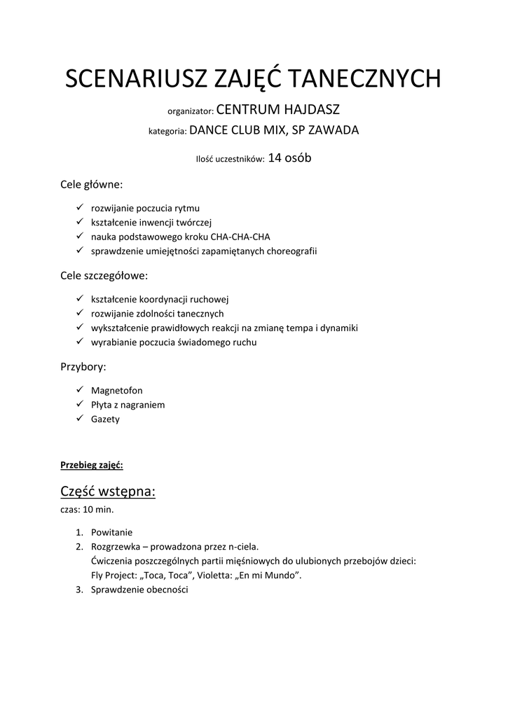 SCENARIUSZ ZAJĘĆ TANECZNYCH organizator: CENTRUM HAJDASZ kategoria: DANCE CLUB MIX, SP ZAWADA Ilość uczestników: 14 osób Cele główne: rozwijanie poczucia rytmu kształcenie inwencji twórczej nauka podstawowego kroku CHA-CHA-CHA sprawdzenie umiejętności zapamiętanych choreografii Cele szczegółowe: kształcenie koordynacji ruchowej rozwijanie zdolności tanecznych wykształcenie prawidłowych reakcji na zmianę tempa i dynamiki wyrabianie poczucia świadomego ruchu Przybory: Magnetofon Płyta z nagraniem Gazety Przebieg zajęć: Część wstępna: czas: 10 min. 1. Powitanie 2. Rozgrzewka – prowadzona przez n-ciela. Ćwiczenia poszczególnych partii mięśniowych do ulubionych przebojów dzieci: Fly Project: „Toca, Toca”, Violetta: „En mi Mundo”. 3. Sprawdzenie obecności Część główna: czas: 30 min. 1. Prezentacja i nauka podstawowego kroku CHA-CHA-CHA : -rytm, technika, różnorodność tempa w muzyce 2. Przypomnienie i zatańczenie układu : TSUNAMI, korygowanie błędów w elementach „skakanka” i „robot”. 3. „Zabawa z gazetami.” Uczestnicy siedzą w kręgu, w rytm muzyki przekładają od siebie do swojego sąsiada zwiniętą w kulkę gazetę. (tempo muzyki jest zmienne). 4. Przetańczenie nauczonej choreografii – wybór dzieci: (DISCO, HIP-HOP, LOCKING) Część końcowa: czas: 5 minut. 1. Zabawa, ćwiczenie kształtujące oraz uspokajające: „Cztery ściany” Ustawienie uczestników: B x A x x x x x x x x x C x D Wszyscy uczniowie stoją w tym samym kierunku. Zabawę rozpoczyna uczestnik B, który stojąc tyłem do grupy wykonuje różne, uspokajające ćwiczenia do muzyki. Odwracając się w wybranym przez siebie kierunku wyznacza kolejną osobę (A, C lub D) która teraz będzie naśladowana przez pozostałych. 2. Pożegnanie dzieci, nagrodzenie uczestnictwa w zajęciach stemplami. Opracowała: Paulina Królikowska – animator Centrum Hajdasz